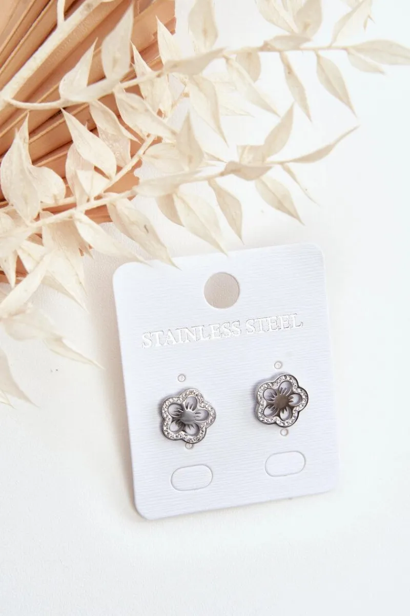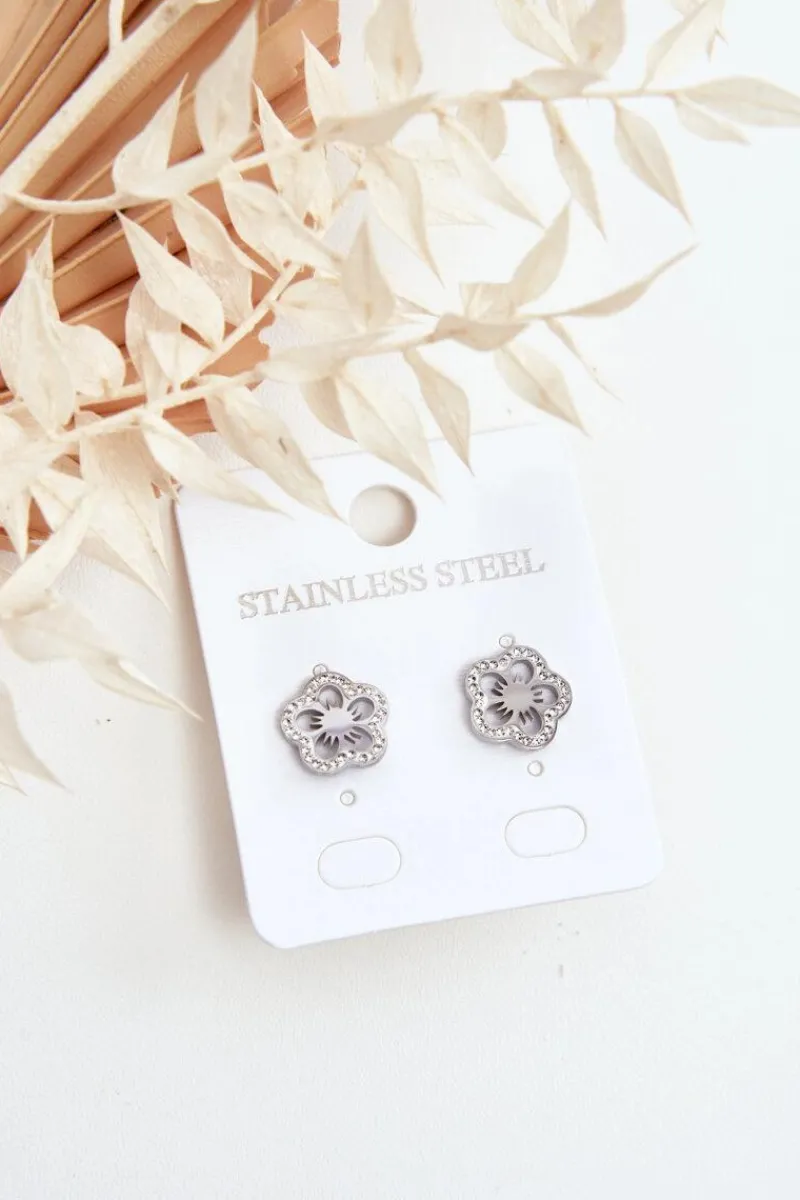 Te cudowne kolczyki w kształcie kwiatków zostały wykonane ze stali nierdzewnej. Model ten jest zapinany na sztyft. Dodatkowo ozdobiono je malutkimi dżetami imitującymi cyrkonie. Ten model świetnie sprawdzi się zarówno do eleganckich, jak i casualowych stylizacji!