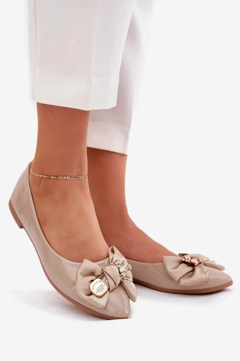 Baleriny damskie wykonane z eko skóry, łączące stylowy wygląd z komfortem. Model wyróżnia się migdałowymi noskami oraz uroczą kokardką ozdobioną złotą broszką, która dodaje im wyjątkowego uroku. Idealne do codziennych stylizacji, zapewniają wygodę i modny wygląd na każdą okazję. Przy wyborze rozmiaru prosimy sugerować się tabelą rozmiarów.