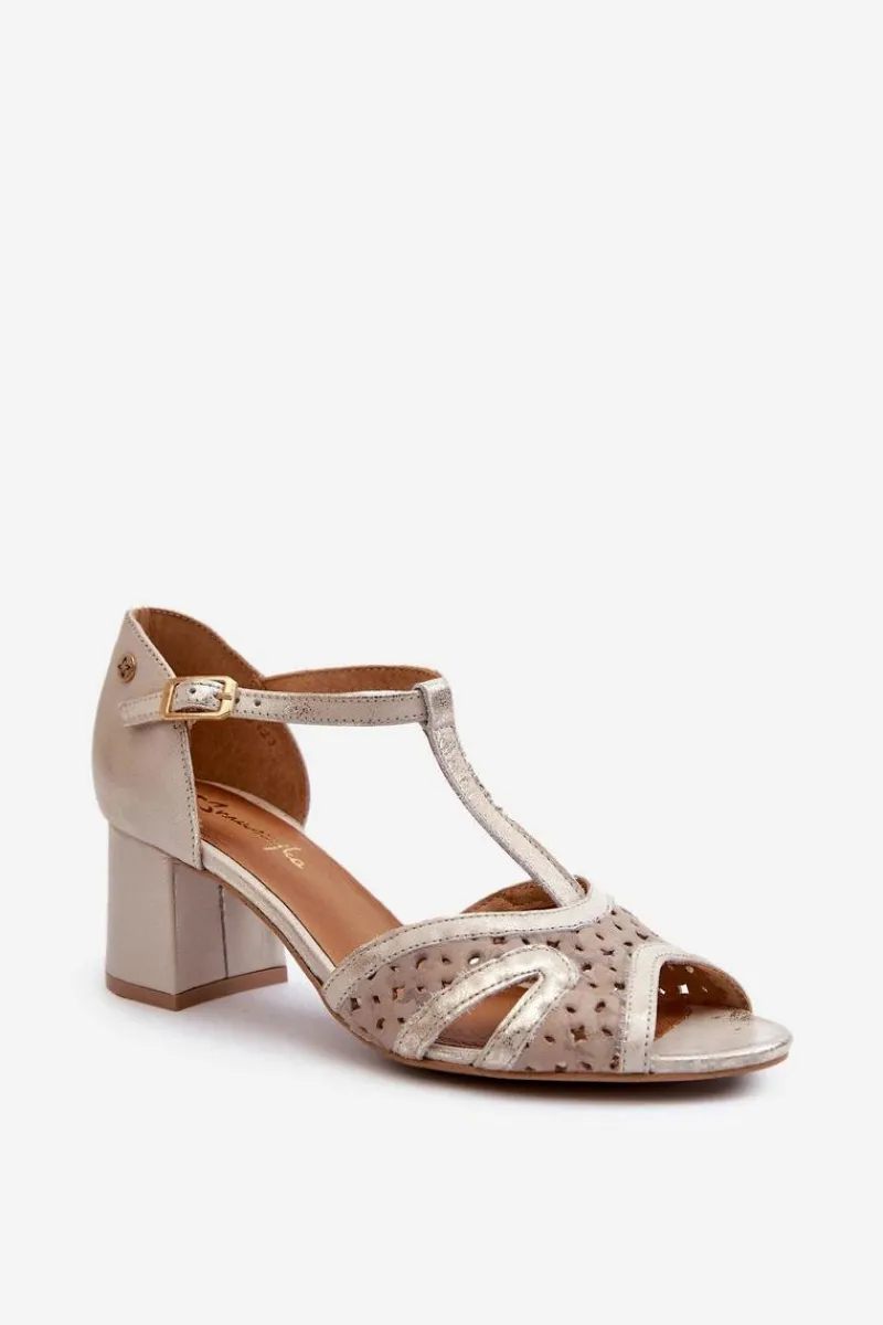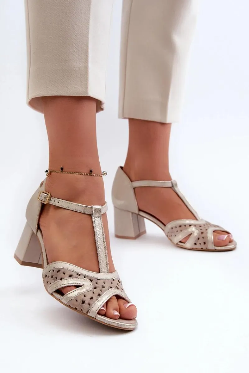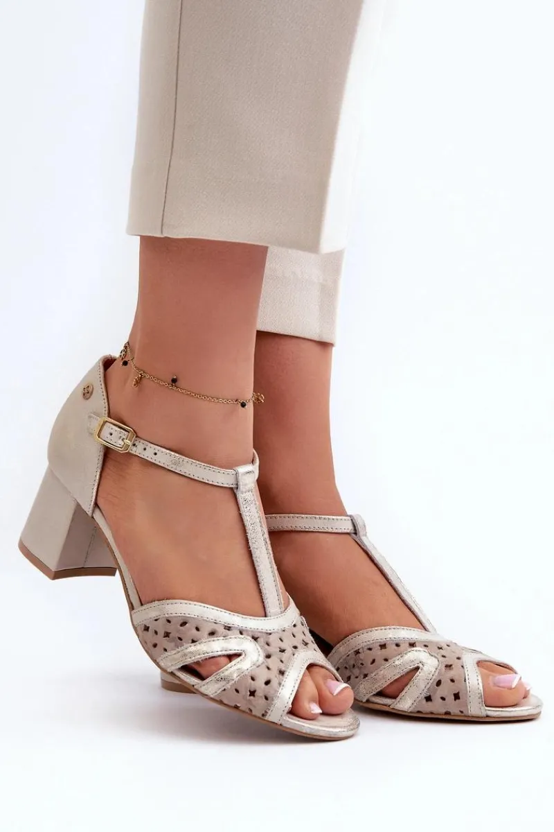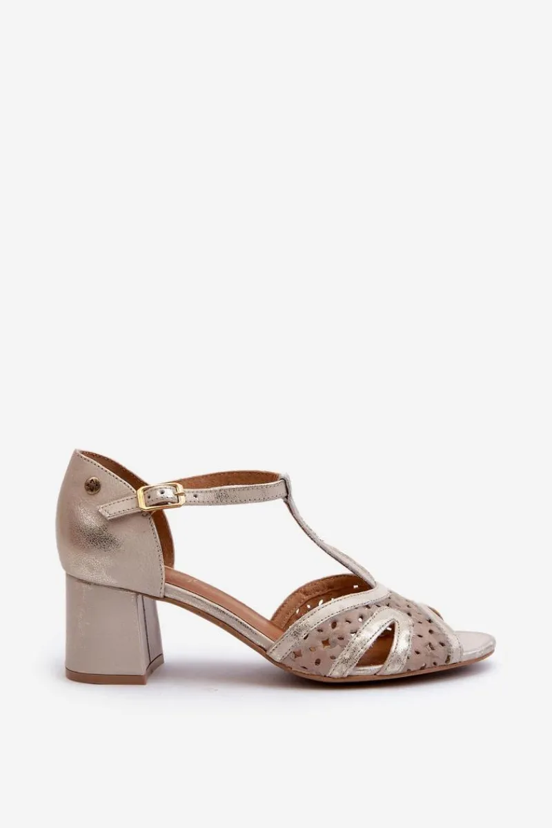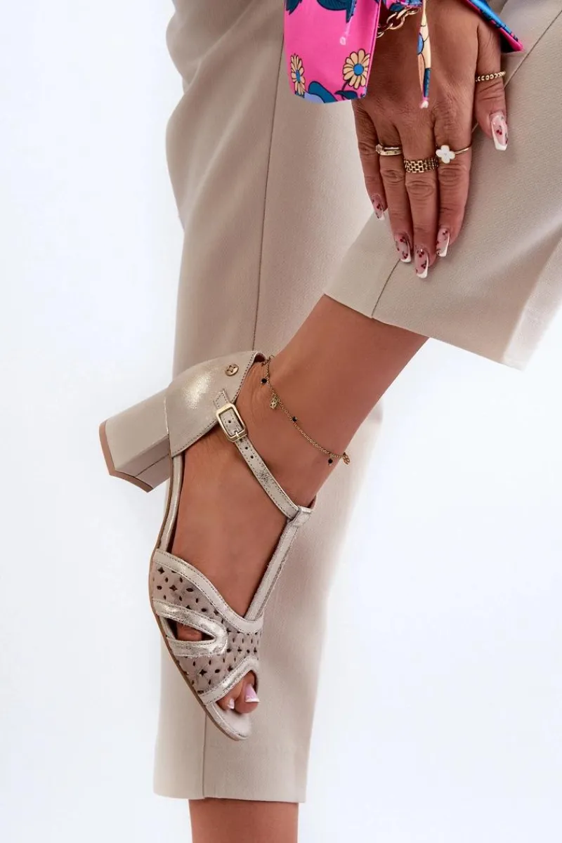 Best Maciejka Sandały Skórzane Damskie Na Obcasie 06551-04 Beżowo-Złote