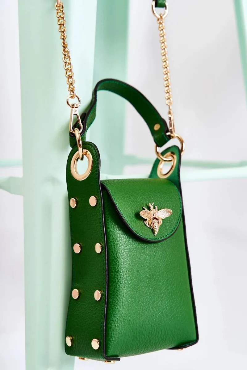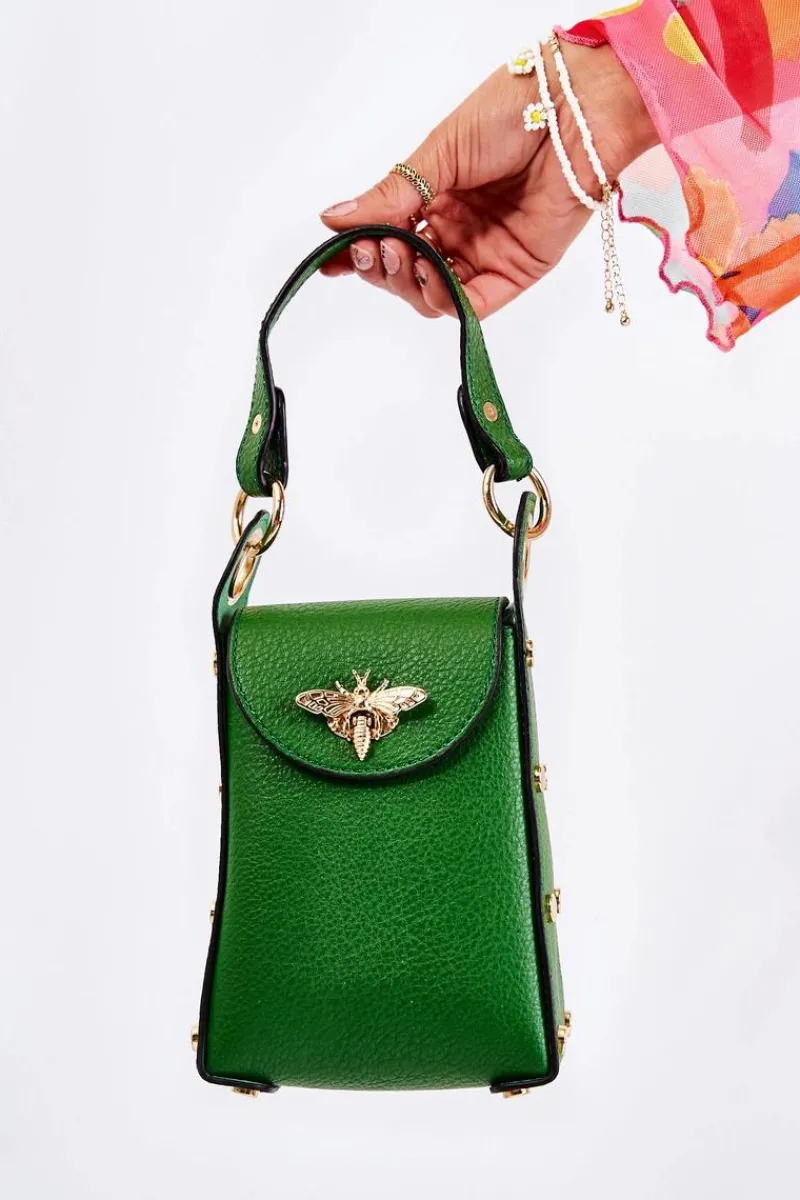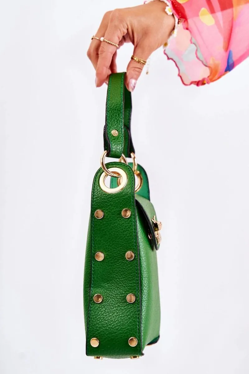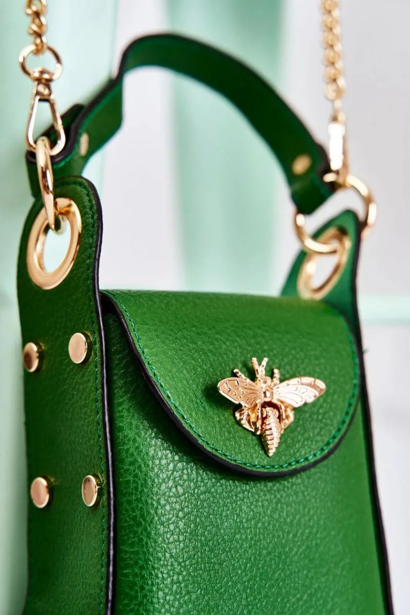 Mała torebka damska wykonana z eko skóry. Posiada nieodpinany, nieregulowany uchwyt. Komora zamykana na klapę z zatrzaskiem. Z przodu znajduje się ozdobny emblemat w postaci owada. Po bokach torebki umieszczono ozdobne ćwieki. Dodatkowo do torebki jest dołączony regulowany, odpinany pasek z łańcuszkiem. Ta torebka to hit sezonu, więc nie czekaj dłużej i kup już dziś! Sprawdź także pozostałe modele torebek dostępnych w naszej ofercie!