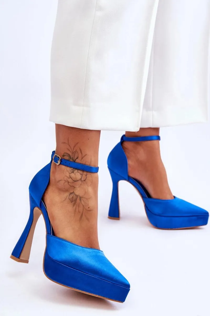 Modne czółenka na obcasie w postaci rozszerzonej ku dołowi szpilce oraz masywnej platformie z pewnością przypadną do gustu kobietom kochającym wysokie obcasy! Wierzch obuwia został wykonany z materiału tekstylnego imitującego satynę. Miękka wkładka z eko skóry pozwoli na komfortowe użytkowanie. Czółenka są zapinane wokół kostki na sprzączkę z regulowanym paskiem. Przy wyborze rozmiaru prosimy kierować się tabelą rozmiarów
