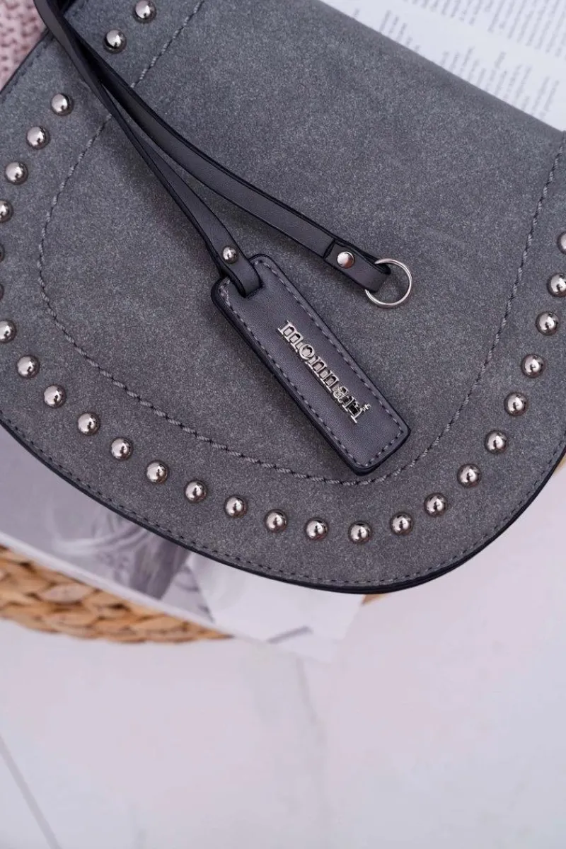 Torebka damska na co dzień małej wielkości z ozdobnymi nitami wokół klapy (23, 20, 10cm), zawieszona na regulowanym pasku, jednokomorowa, z jasną podszewką w środku. Polecamy ten model do codziennych stylizacji.