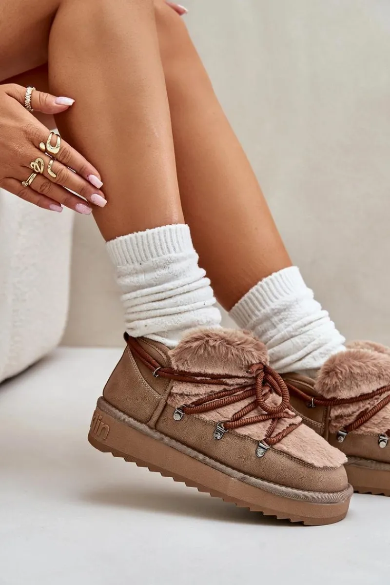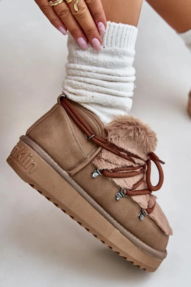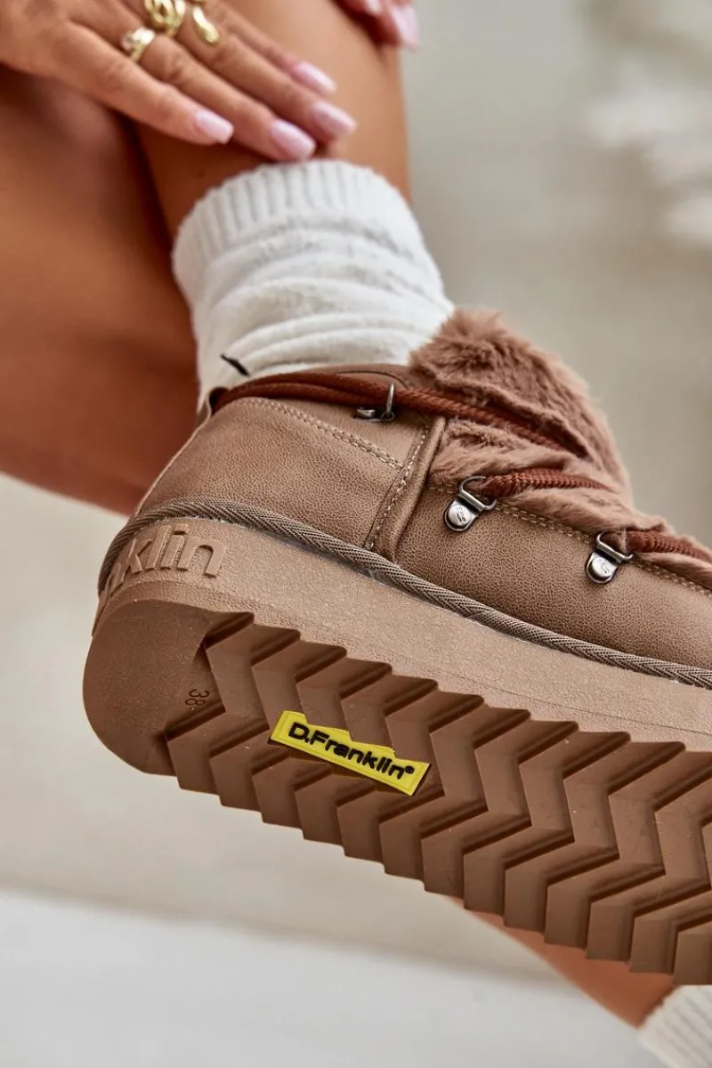Śniegowce damskie D.Franklin wykonane z eko skóry. Osadzone na podeszwie z gumowego tworzywa. Przód ozdobiony miłym w dotyku futerkiem. Wielopozycyjne sznurowadła zapewnią doskonałe dopasowanie do stopy. Syntetyczna wyściółka w środku. Cholewka do kostki. Śliczny model, który powinnaś mieć w swojej zimowej garderobie! Przy wyborze rozmiaru prosimy sugerować się tabelą rozmiarów.