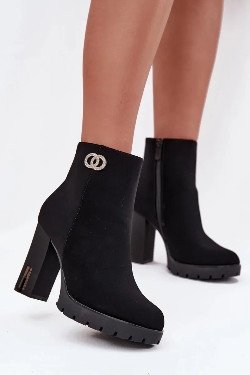 Damskie botki z wysokim obcasem typu słupek to połączenie elegancji i wygody. Charakteryzują się ozdobnym detalem, który nadaje im modnego, wyrazistego charakteru. Zamek błyskawiczny ułatwia zakładanie, a wnętrze ocieplane kocem obuwniczym zapewnia ciepło i komfort w chłodniejsze dni. Te botki to idealny wybór do stylizacji, które wymagają zarówno klasycznego, jak i nowoczesnego akcentu! Przy wyborze rozmiaru prosimy sugerować się tabelą rozmiarów.