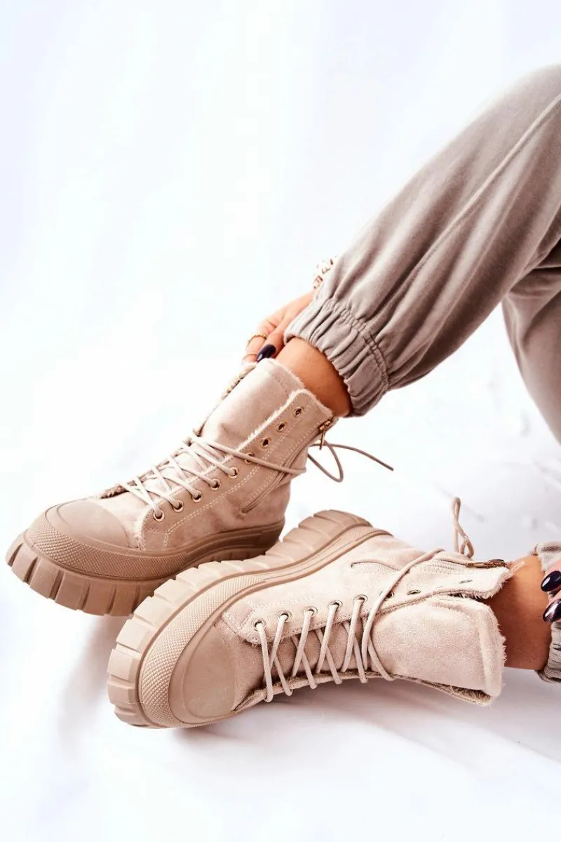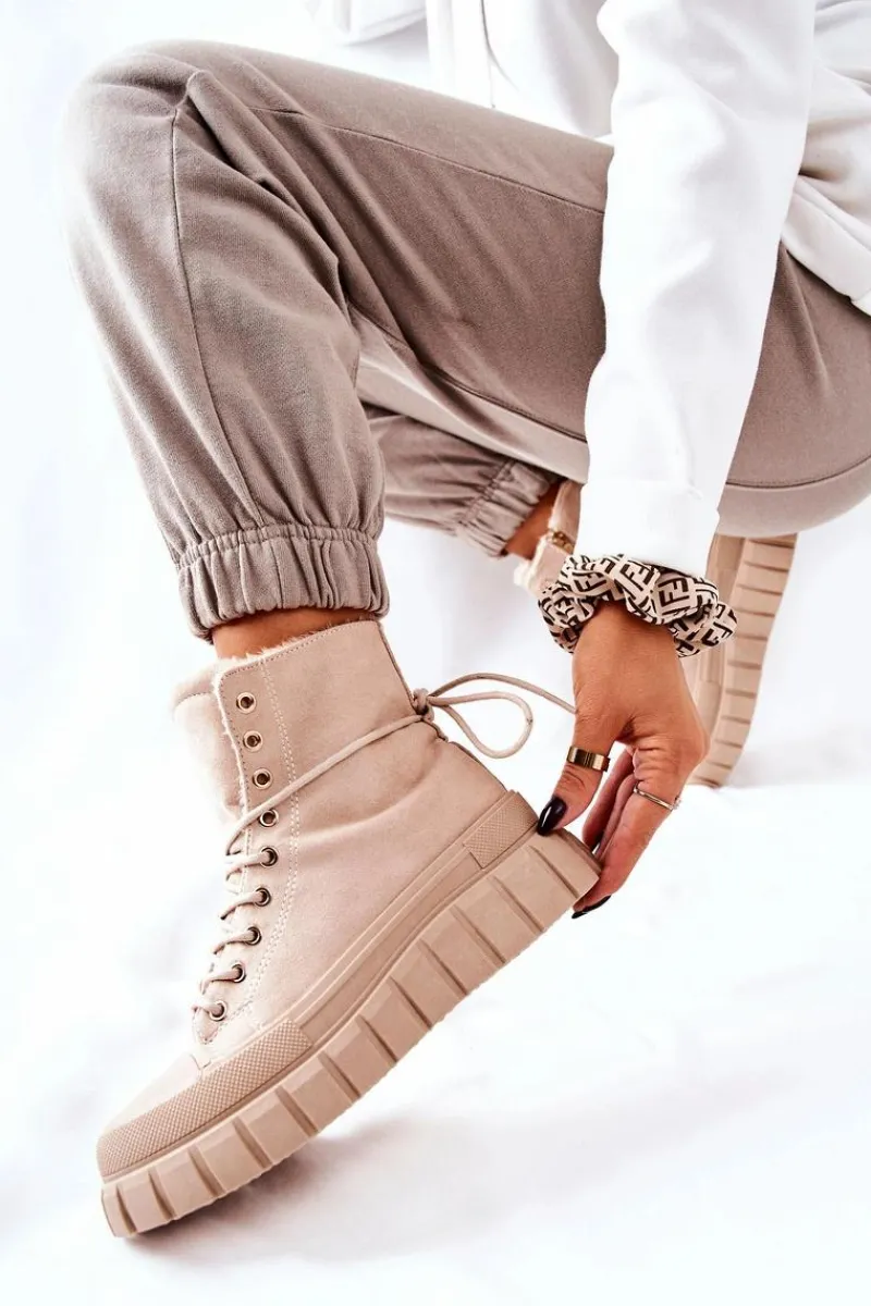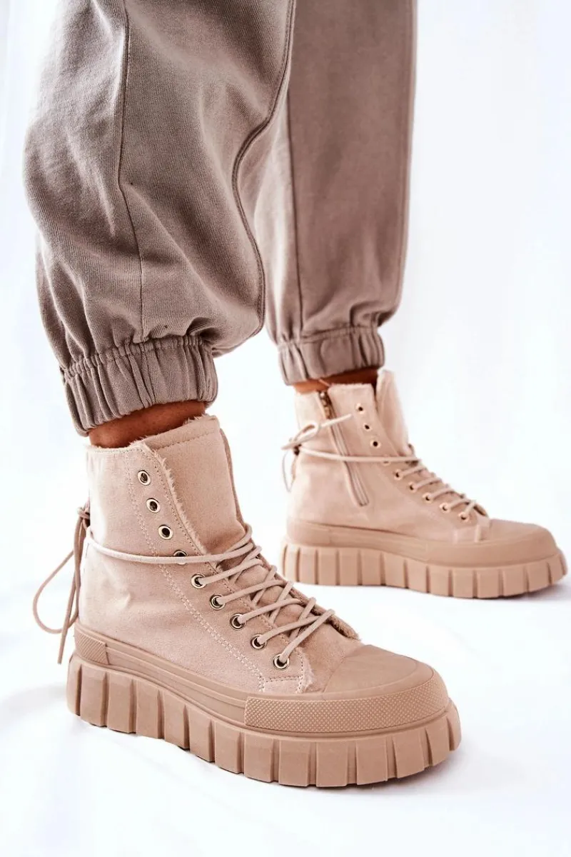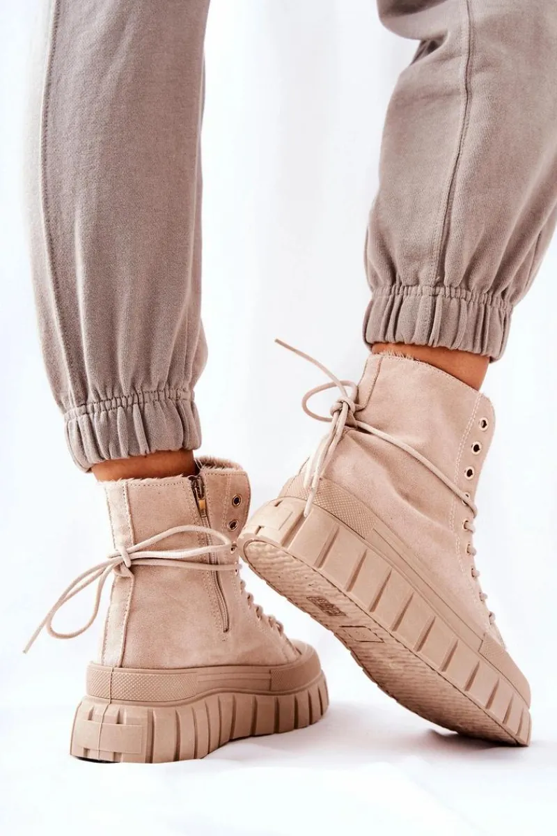 Wysokie trampki zostały wykonane z eko zamszu. Posiadają masywną platformę. Posiadają wiązanie, które można dopasować do tęgości nogi. Długie sznurówki sprawiają, że można je modnie owinąć wokół cholewki i zawiązać. Z boku są zapinane na suwak. Trampki w środku posiadają ocieplenie w postaci delikatnego futerka. Przy wyborze rozmiaru prosimy sugerować się tabelą rozmiarów.
