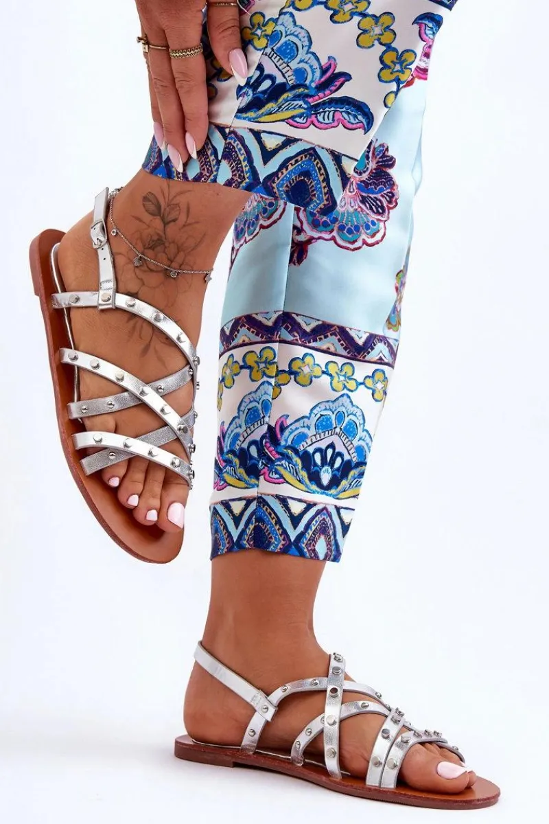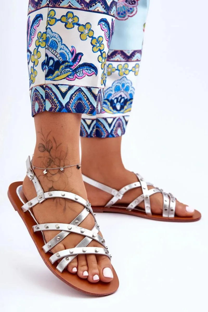 Best Sandały Damskie z Ozdobami Srebrne Alemona Damskie Sandały Płaskie