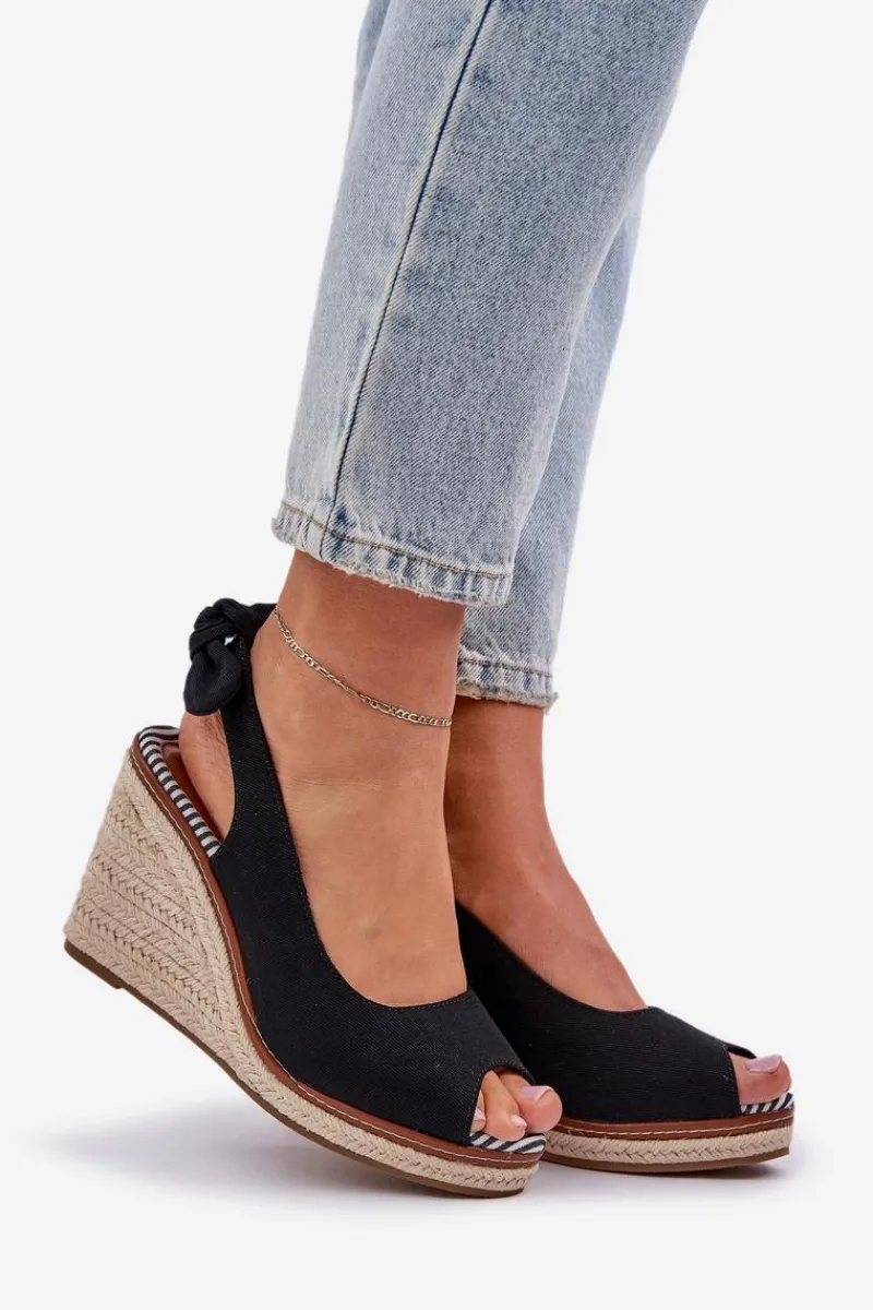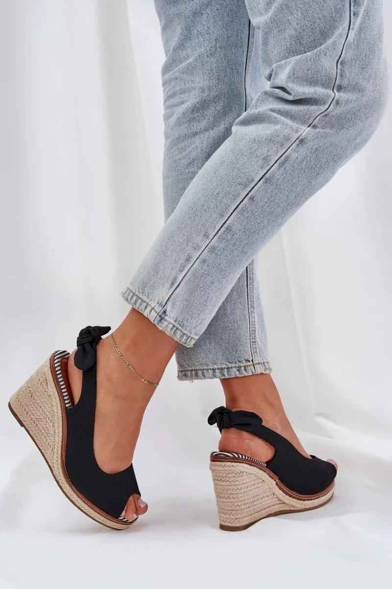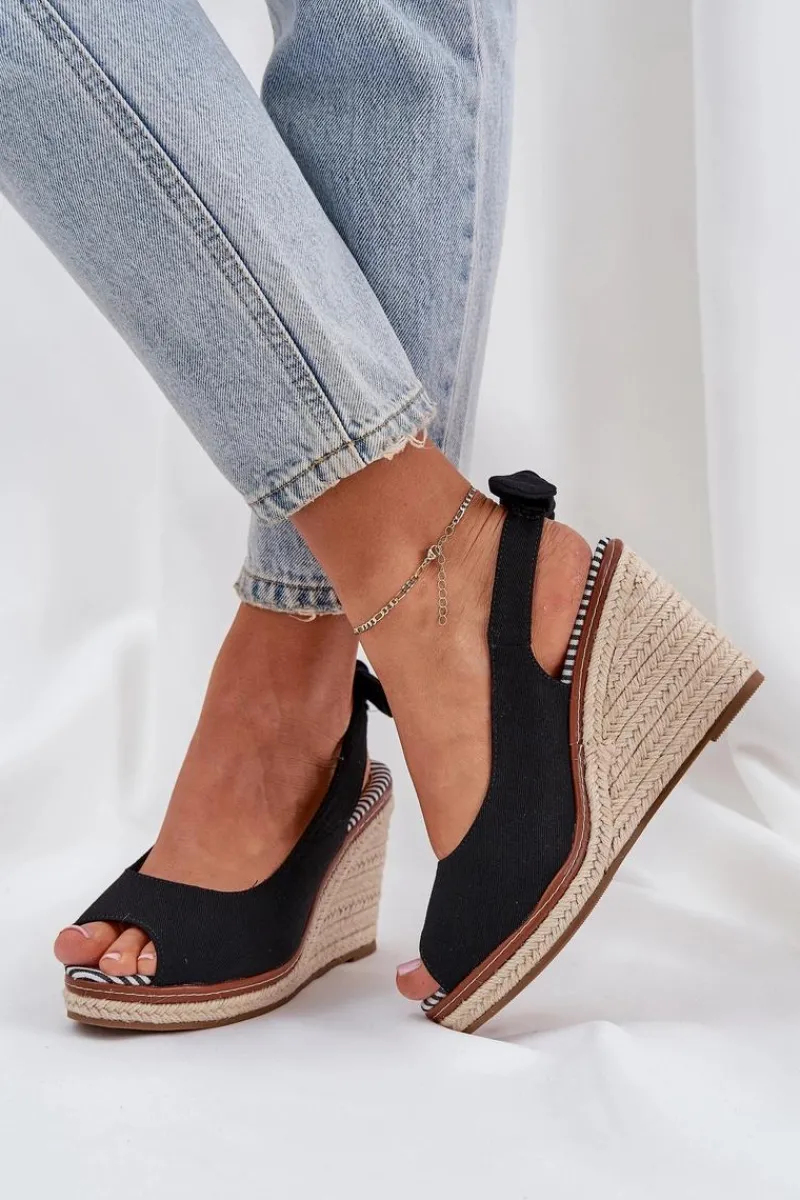 Sandały damskie z materiału tekstylnego to lekka i wygodna propozycja na ciepłe dni. Osadzone na koturnie z plecionką. Z tyłu znajduje się pętelka. Te sandały świetnie komponują się w letnich stylizacjach, łącząc komfort z modnym, naturalnym wyglądem. Idealne na wakacyjne spacery czy codzienne wyjścia. Przy wyborze rozmiaru prosimy sugerować się tabelą rozmiarów.