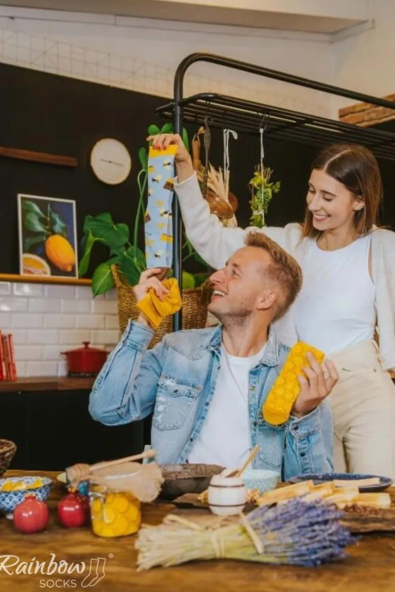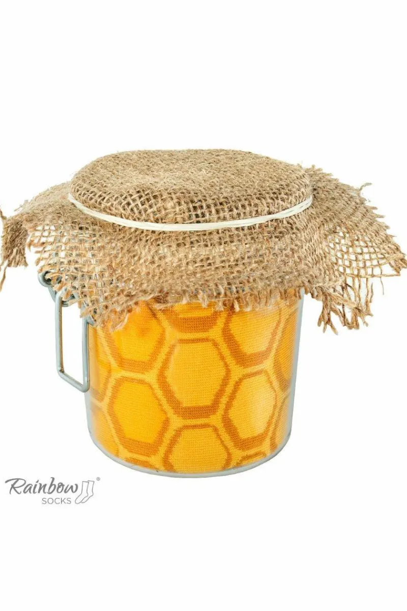 Prawdziwi miłośnicy miodu wiedzą, że to nie tylko zdrowy dodatek do herbaty, ale także sprawdza się jako pyszna polewa gofrów, lodów czy ciast. W słoiku z klipsem, ozdobionym jutową tkaniną zamknęliśmy dwie pary skarpetek, które wyglądają jak prawdziwy miód! Błękitna para ze wzorem pszczółek i baryłek oraz żółta para we wzór plastrów miodu ucieszą każdego, kto miód dodałby nawet do zupy!
