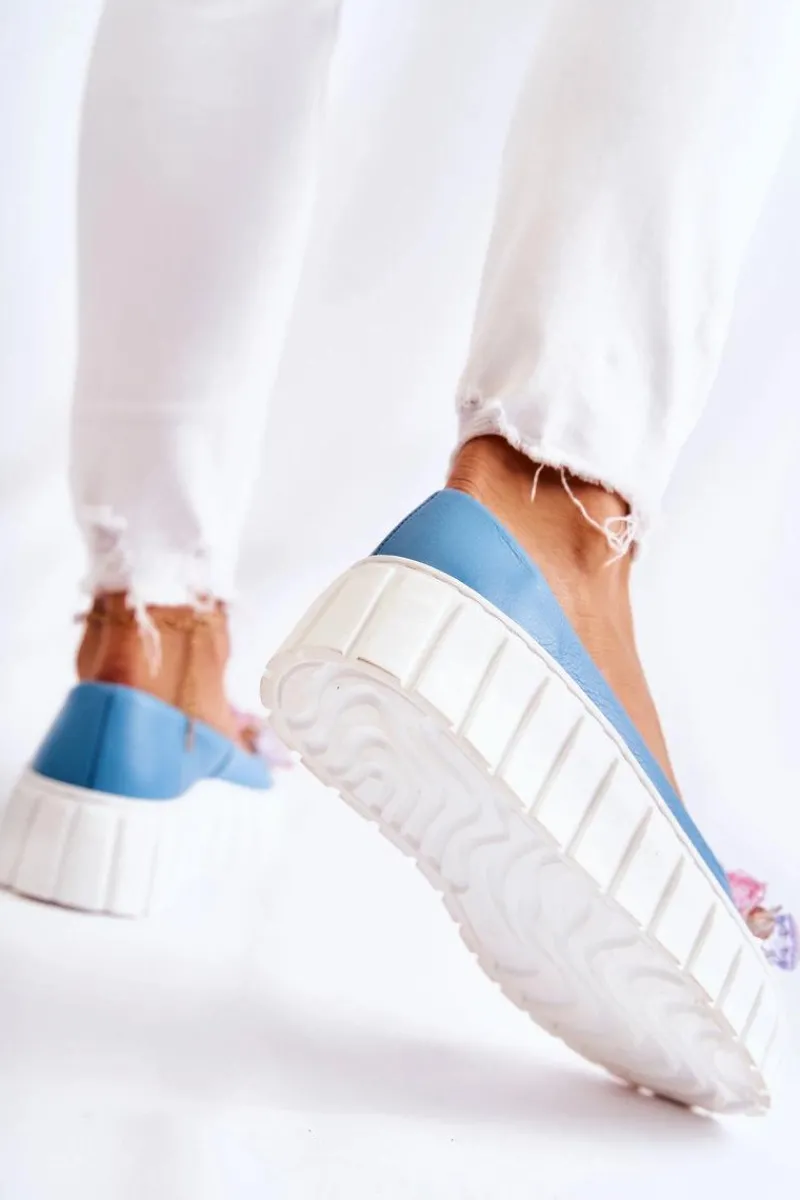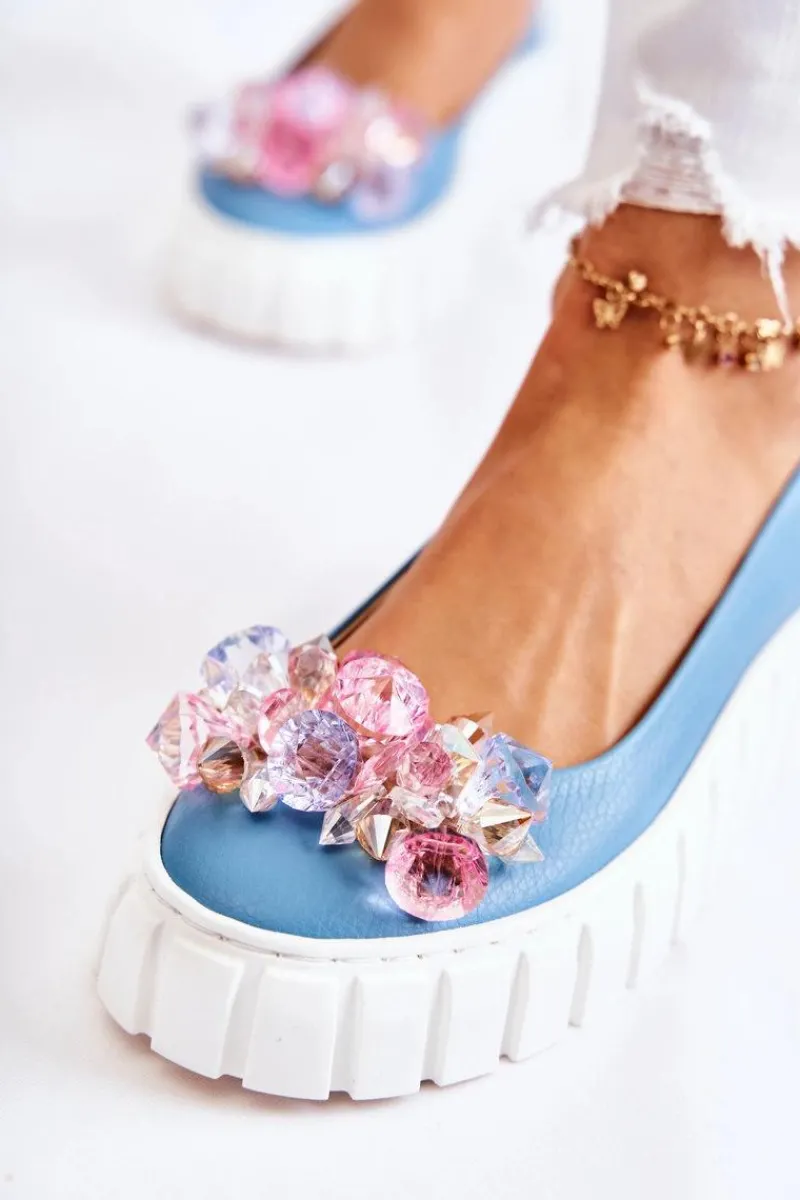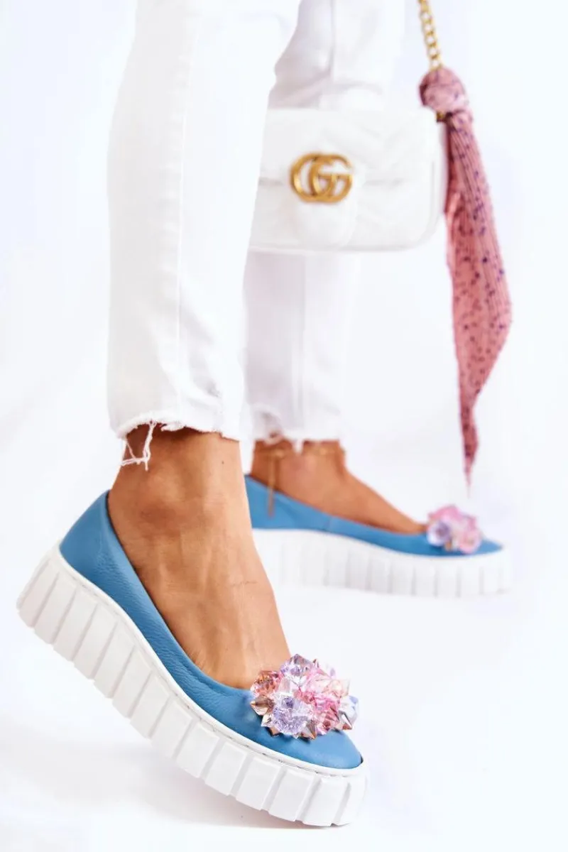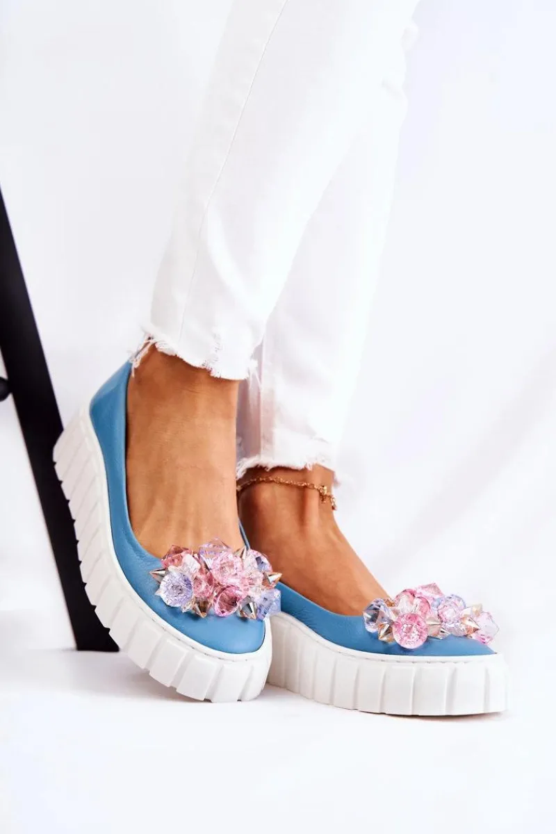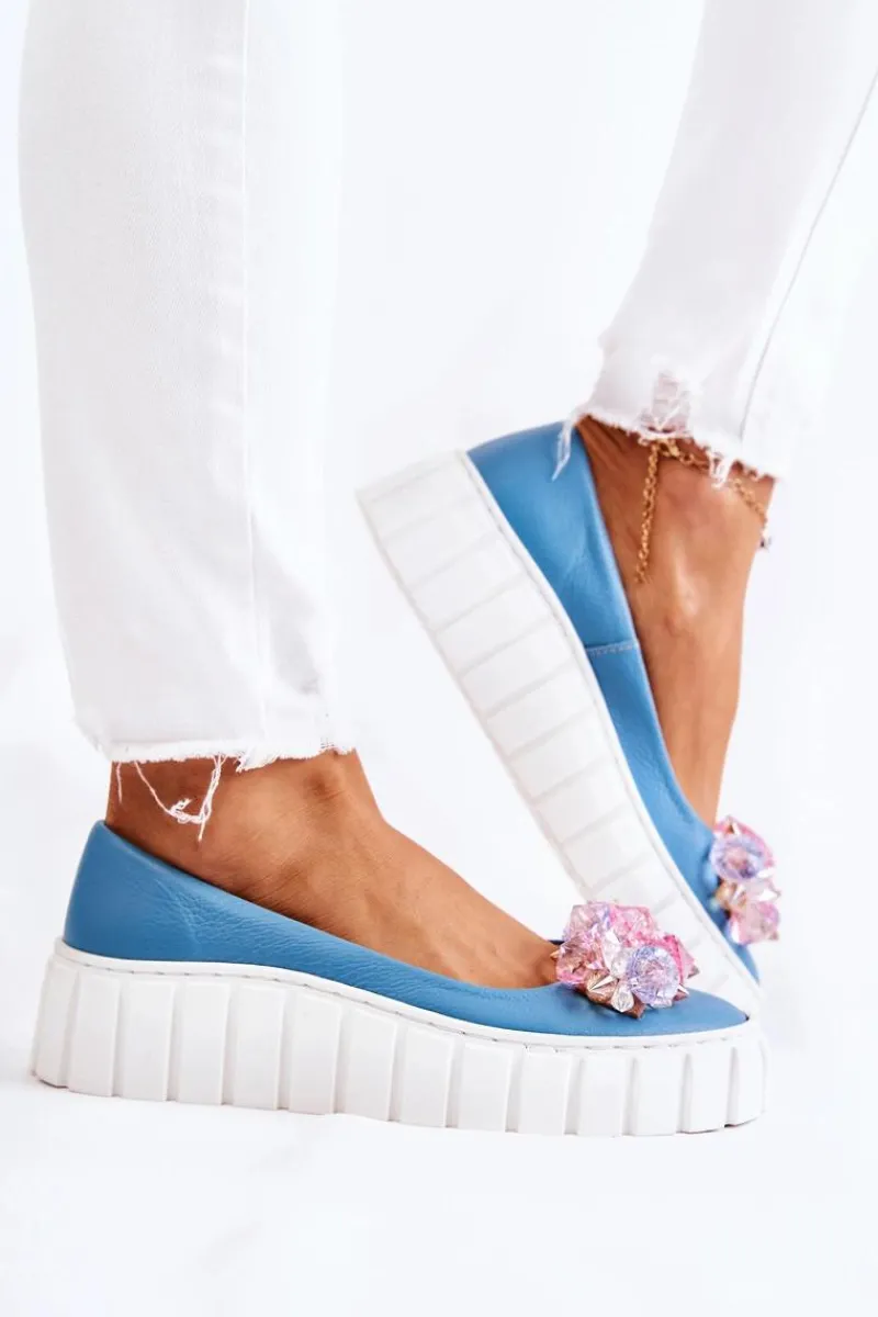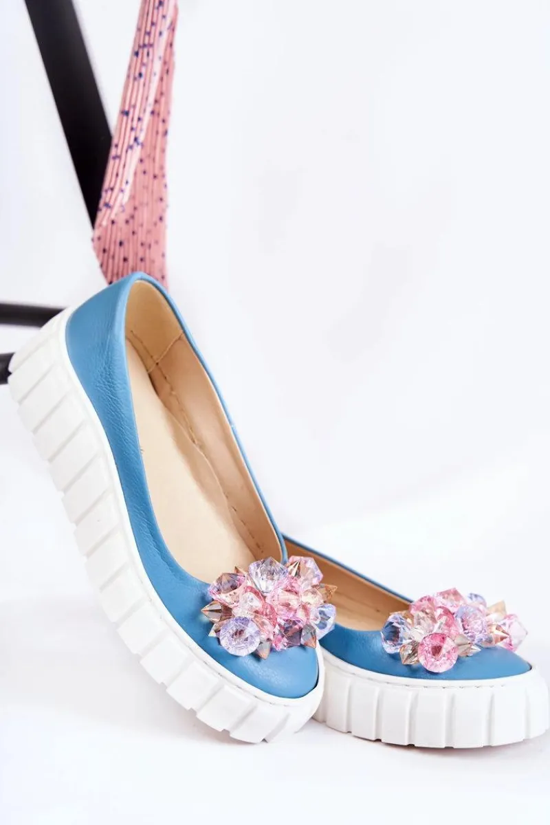 Damskie baleriny wykonane z naturalnej skóry z dbałością o każdy detal. O komfort zadba miękka, skórzana wkładka. Podeszwa wykonana z gumowego tworzywa ze żłobieniami po bokach. Dodatkowo jest antypoślizgowa. Zapiętek jest usztywniany. Z przodu elegancka ozdoba w postaci imitacji kryształków doda tym butom uroku. Nosek zaokrąglony. Baleriny dopełnią wiele Twoich stylizacji. Przy wyborze rozmiaru prosimy sugerować się tabelą rozmiarów.