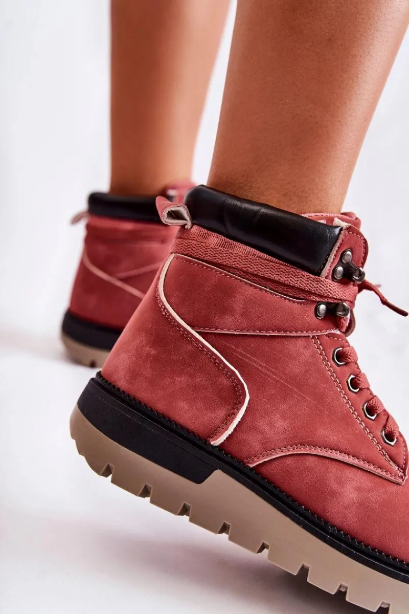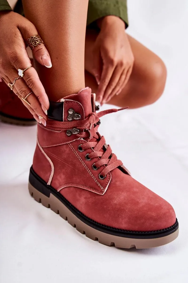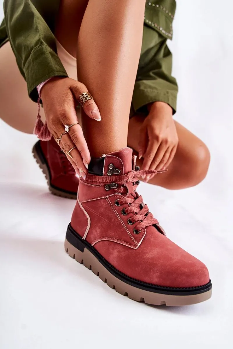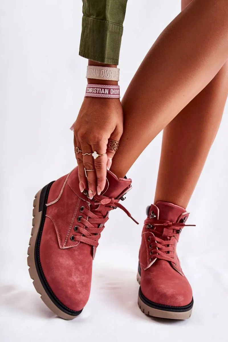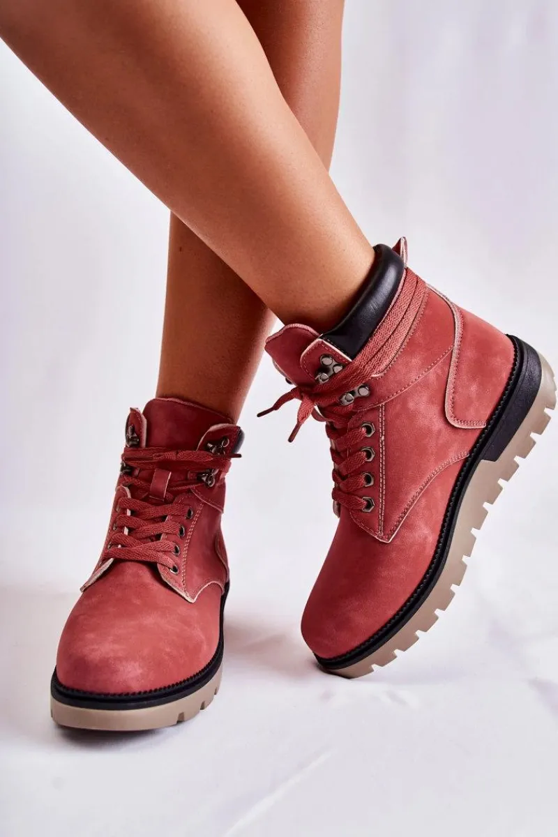 Botki damskie zostały wykonane z eko skóry. Model osadzony jest na platformie z charakterystycznymi żłobieniami. Posiadają zaokrąglony nosek. Cholewka zakrywająca kostkę z małą pętelką z tyłu ułatwiającą zakładanie obuwia. Wkładka oraz wyściółka ocieplone kocem obuwniczym. Klasyczne wiązanie na płaskie sznurowadła pozwoli na odpowiednie dopasowanie obuwia do tęgości nogi. Przy wyborze rozmiaru prosimy sugerować się tabelą rozmiarów.