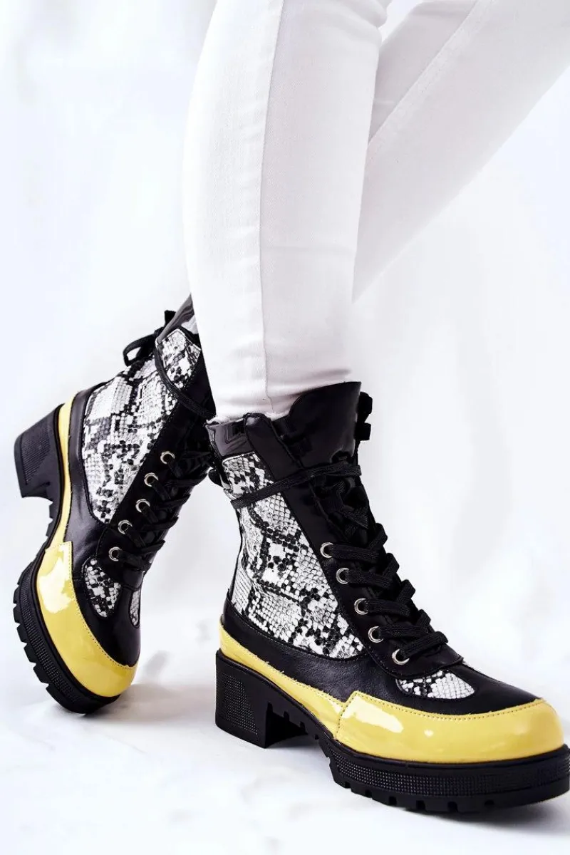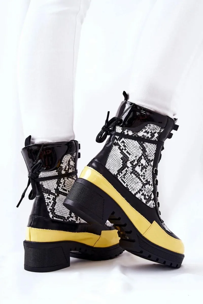 Botki wykonane z eko skóry, natomiast na górze cholewki oraz przy podeszwie są wykonane z lakierowanej eko skóry. Posiadają wiązanie. Delikatny obcas w postaci słupka subtelnie uniesie sylwetkę. Świetny model, który doda Twoim stylizacjom charakteru! Musisz je mieć! Przy wyborze rozmiaru prosimy sugerować się tabelą rozmiarów.
