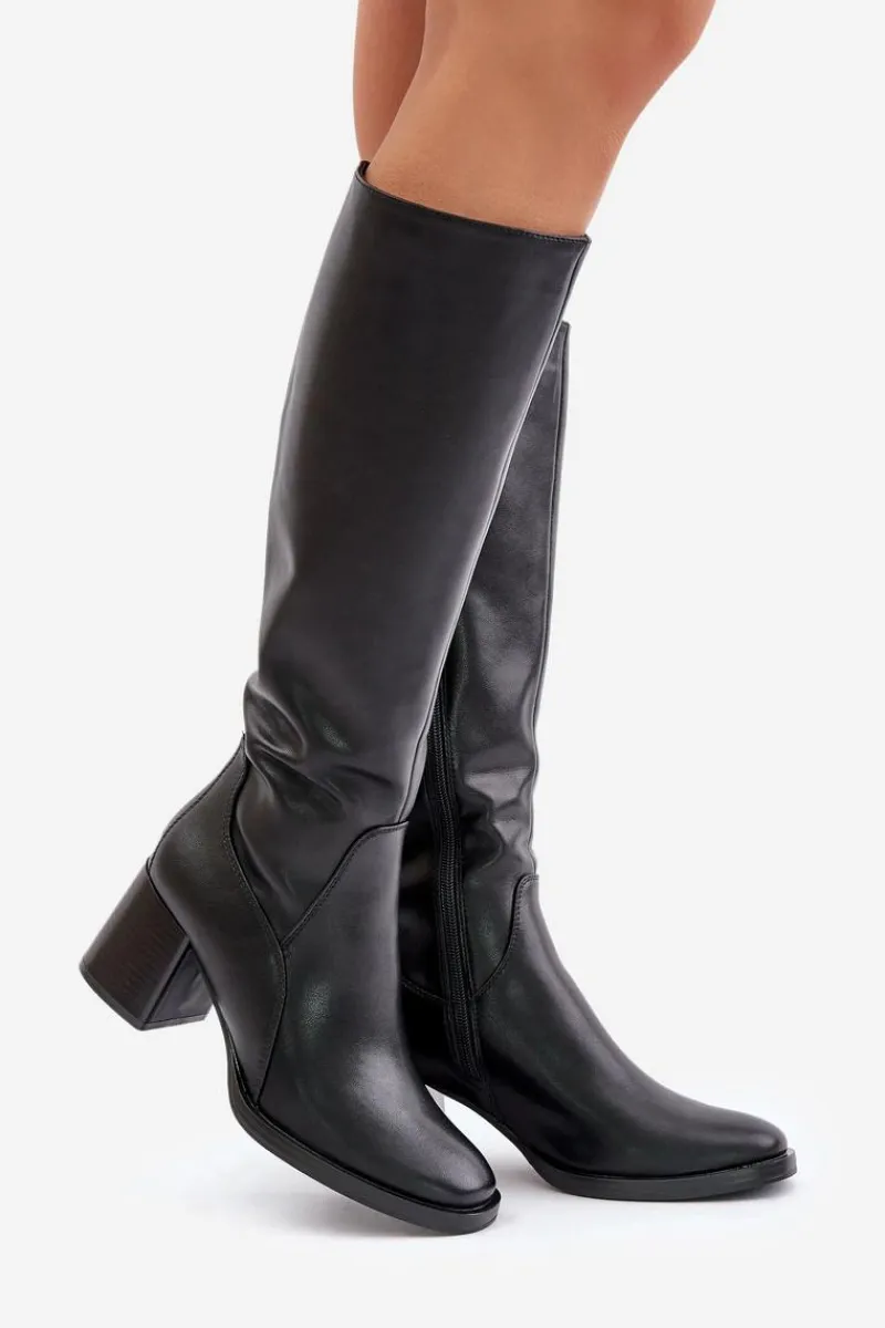 Eleganckie skórzane kozaki przed kolano to doskonała propozycja na chłodniejsze dni. Wykonane z wysokiej jakości skóry, ocieplane wnętrze zapewnia ciepło i komfort. Model zapinany na zamek dla wygody zakładania, a stabilny obcas typu słupek dodaje stylowego podkreślenia sylwetki. Zaokrąglone noski. Model ten idealnie pasuje do eleganckich stylizacji. Przy wyborze rozmiaru prosimy sugerować się tabelą rozmiarów.