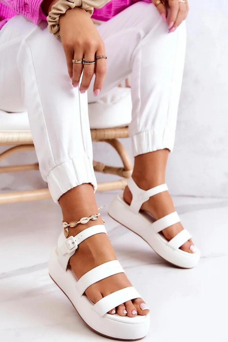 Wspaniałe sandałki z regulowanym paskiem zapinanym na sprzączkę. Możesz dopasować je do tęgości nogi. Wykonane z eko skóry. Posiadają platformę oraz koturn. Miękka wkładka zapewni wygodę przez cały dzień. Sandały to idealne buty na lato! Koniecznie powinnaś je mieć! Przy wyborze rozmiaru prosimy kierować się tabelą rozmiarów.