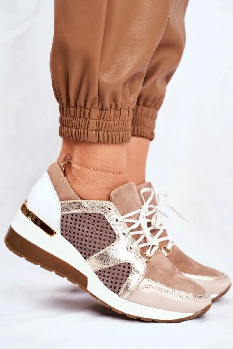 Best Skórzane Sneakersy Na Koturnie Beżowe Nicole 2562 Damskie Sneakersy Damskie