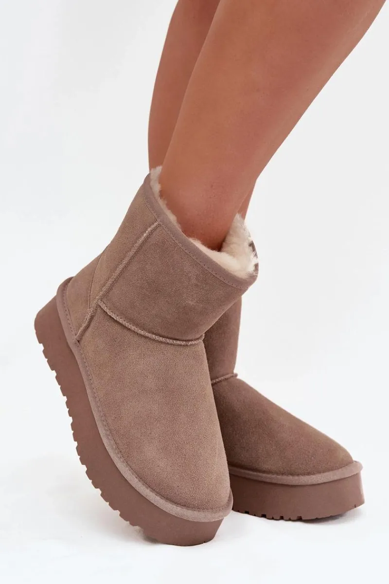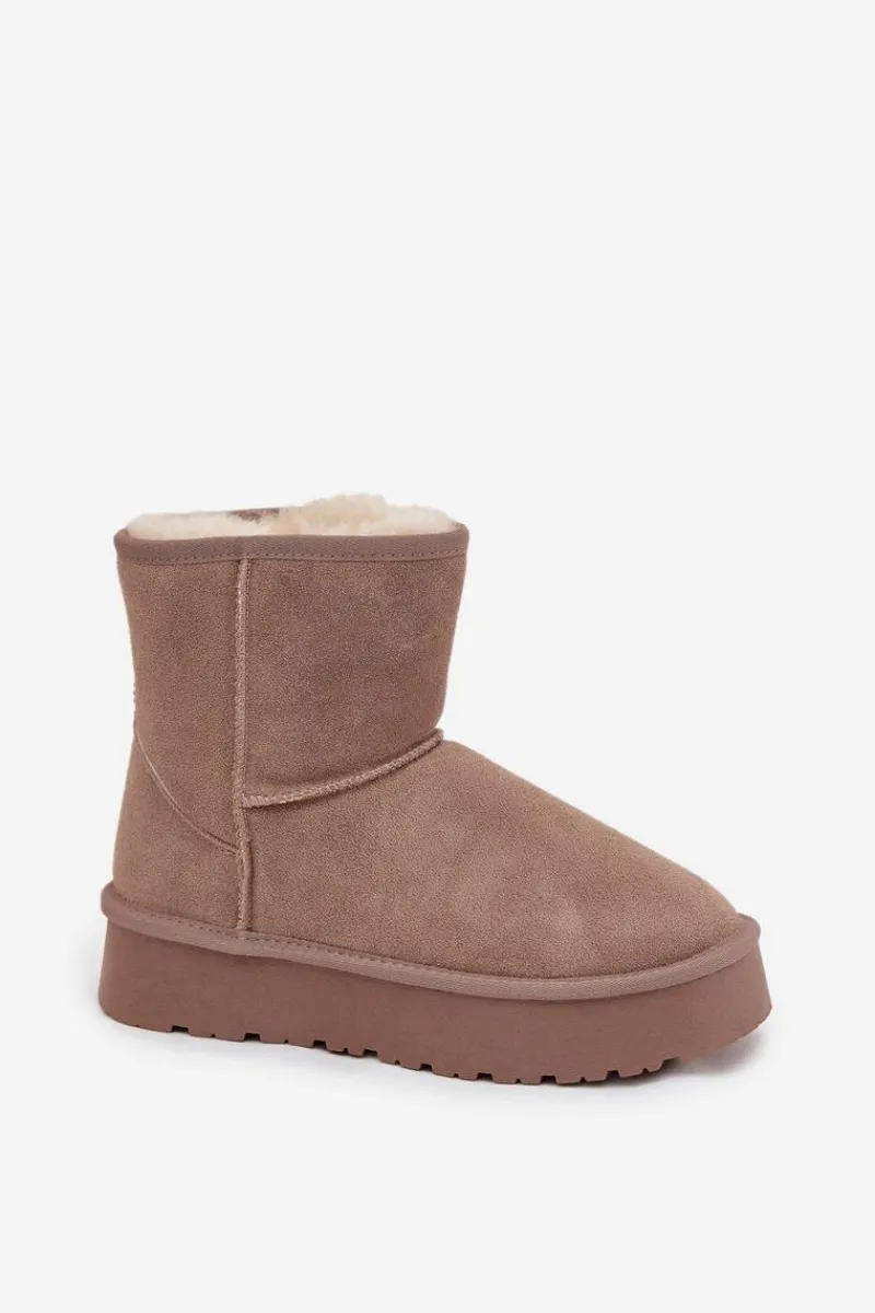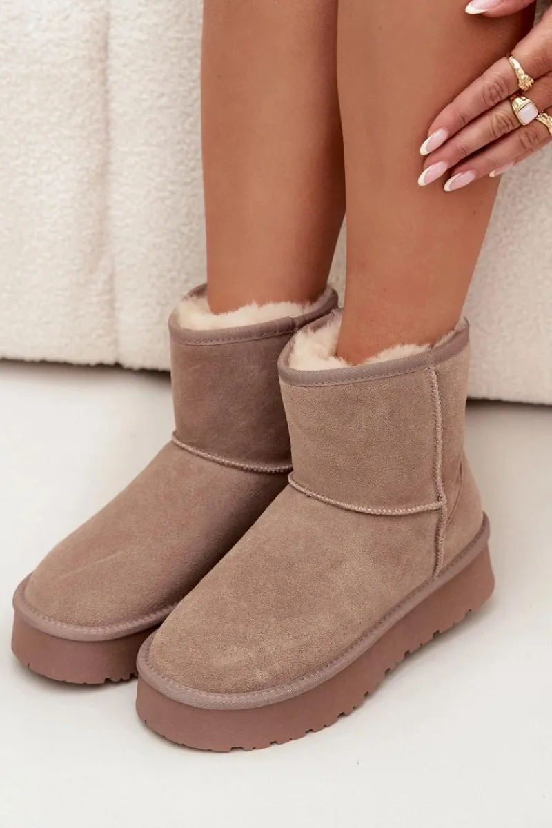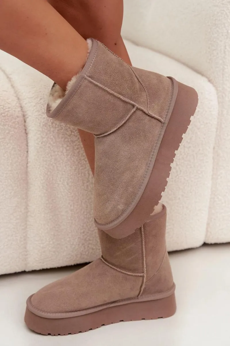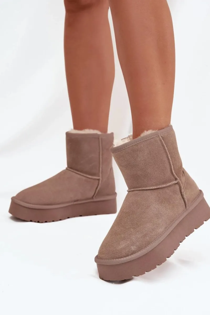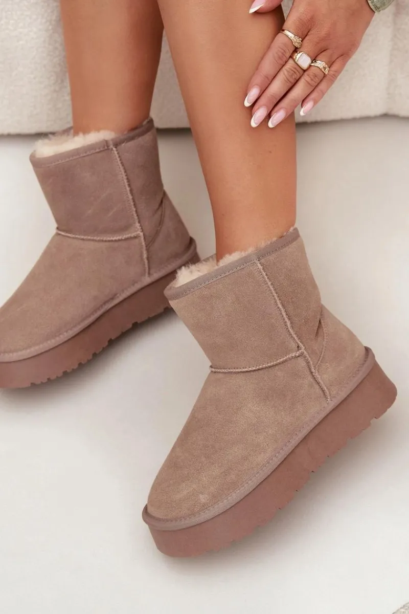 Śniegowce damskie wykonane z naturalnego zamszu. Wnętrze ocieplone miękkim futerkiem gwarantuje komfort i ciepło nawet w mroźne dni. Osadzone na platformie z gumowego tworzywa skutecznie izolują od chłodnego podłoża, zapewniając wygodę podczas codziennego użytkowania. To idealny wybór na zimowe wyjścia – praktyczne, modne i komfortowe. Przy wyborze rozmiaru prosimy sugerować się tabelą rozmiarów.