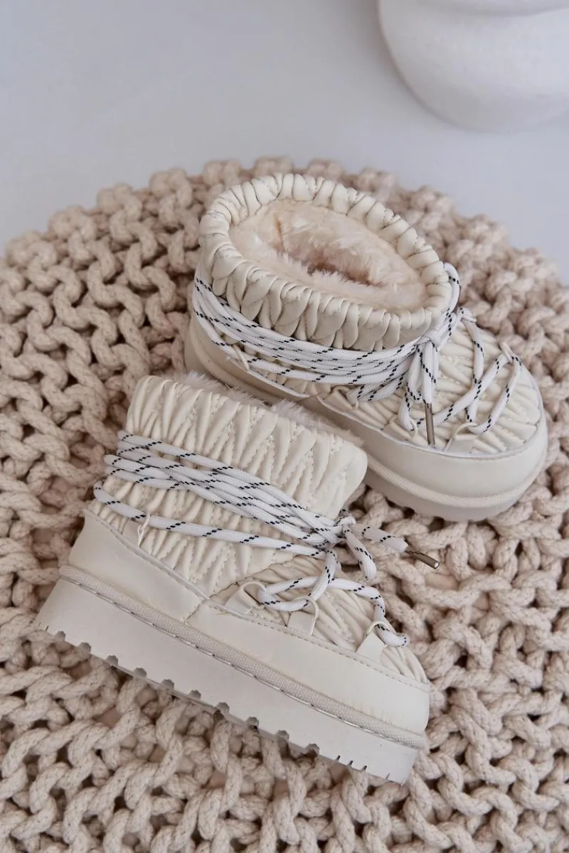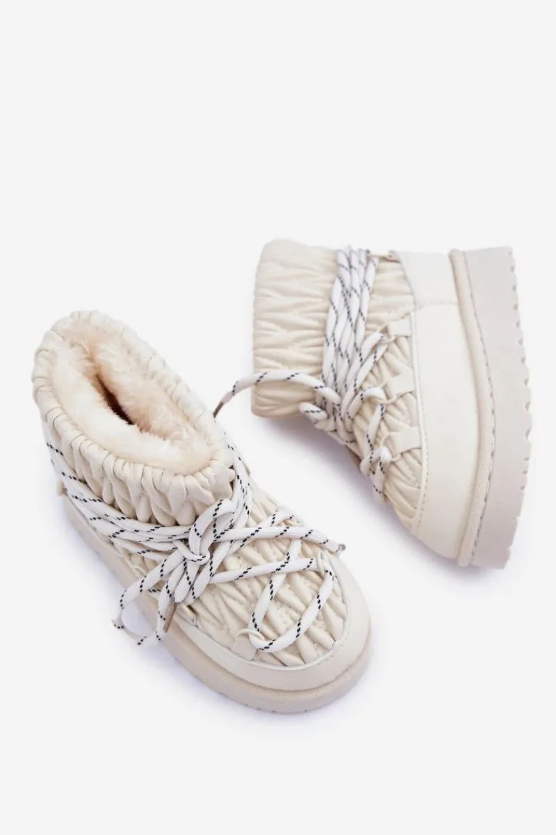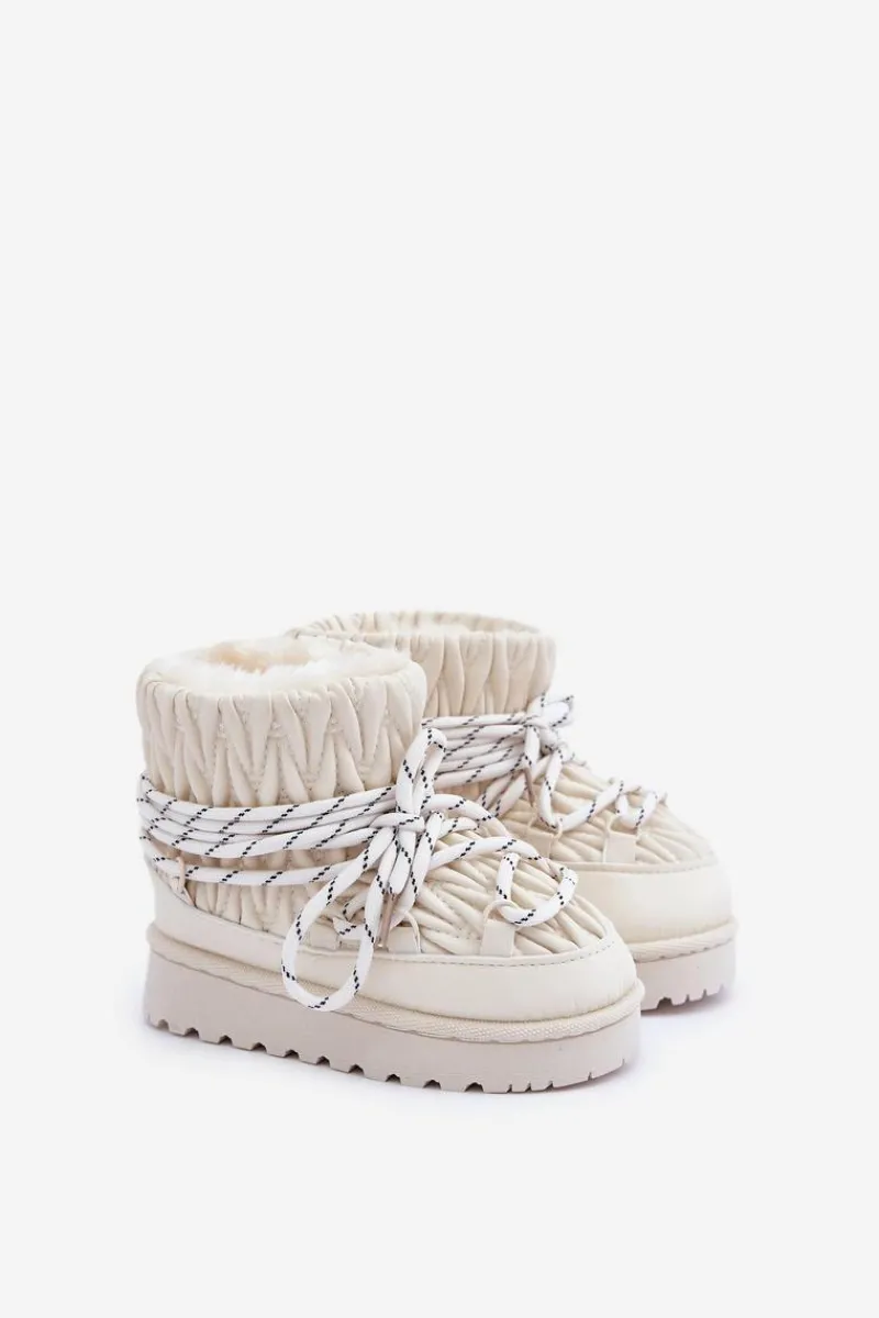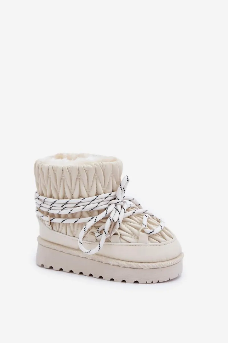Śniegowce dziecięce wykonane z eko skóry to idealny wybór na mroźne dni i zimowe zabawy na świeżym powietrzu. Ocieplane grubym, miękkim futerkiem, zapewniają doskonałą izolację termiczną i komfort noszenia. Stylowa cholewka z efektownymi marszczeniami i dekoracyjnym wiązaniem dodaje im uroku. Podeszwa z gumowego tworzywa zapewni stabilność. Funkcjonalne i modne, sprawdzą się w każdej zimowej stylizacji! Przy wyborze rozmiaru prosimy kierować tabelą rozmiarów.
