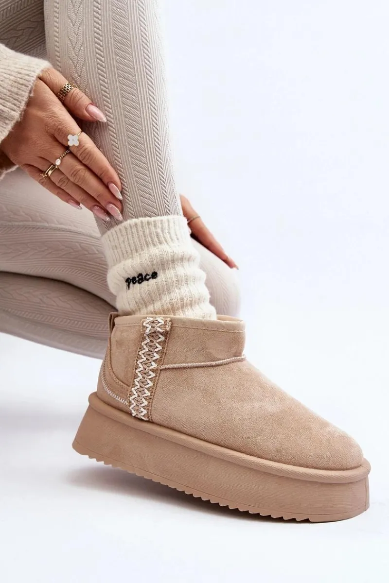 Śniegowce na platformie to najmodniejszy fason tego sezonu! Model ten wykonany został z eko zamszu. Gruba podeszwa z gumowego tworzywa świetnie odizoluje od zimnego podłoża. Cholewka do kostki ozdobiona azteckim wzorem. Środek ocieplony futerkiem. Koniecznie musisz je mieć! Przy wyborze rozmiaru prosimy sugerować się tabelą rozmiarów.