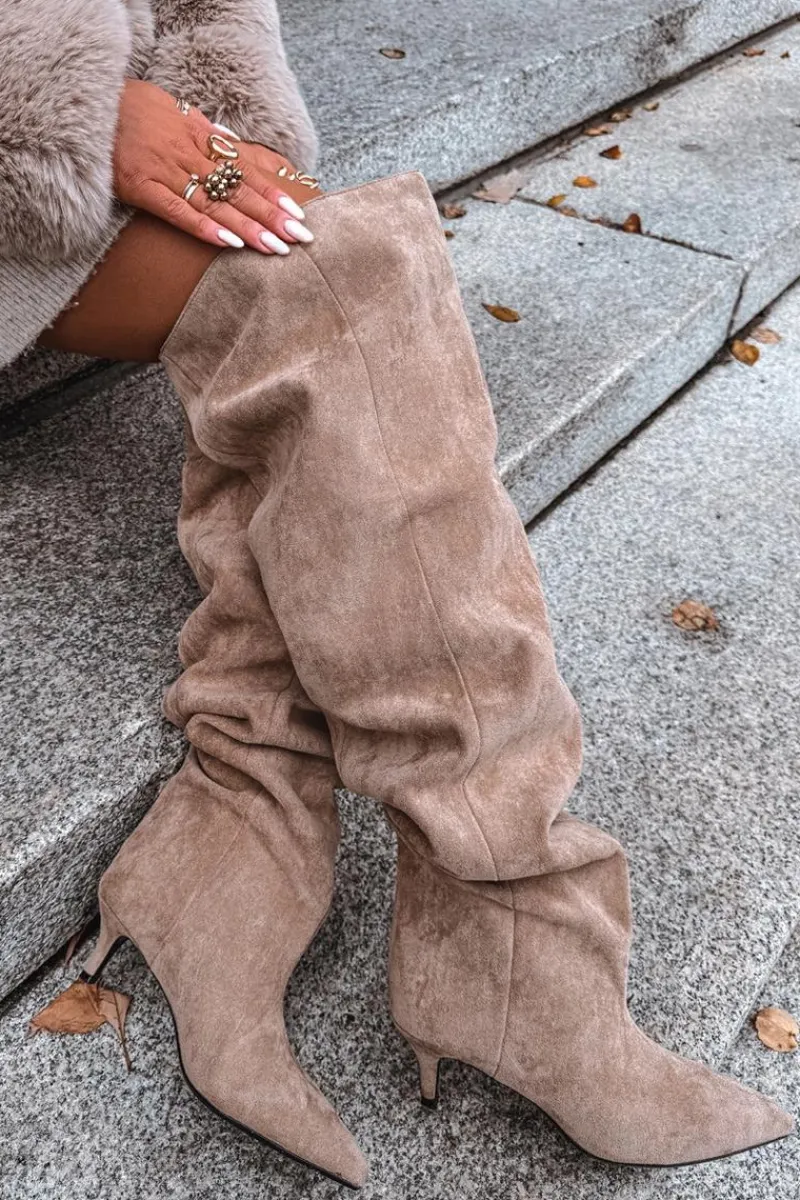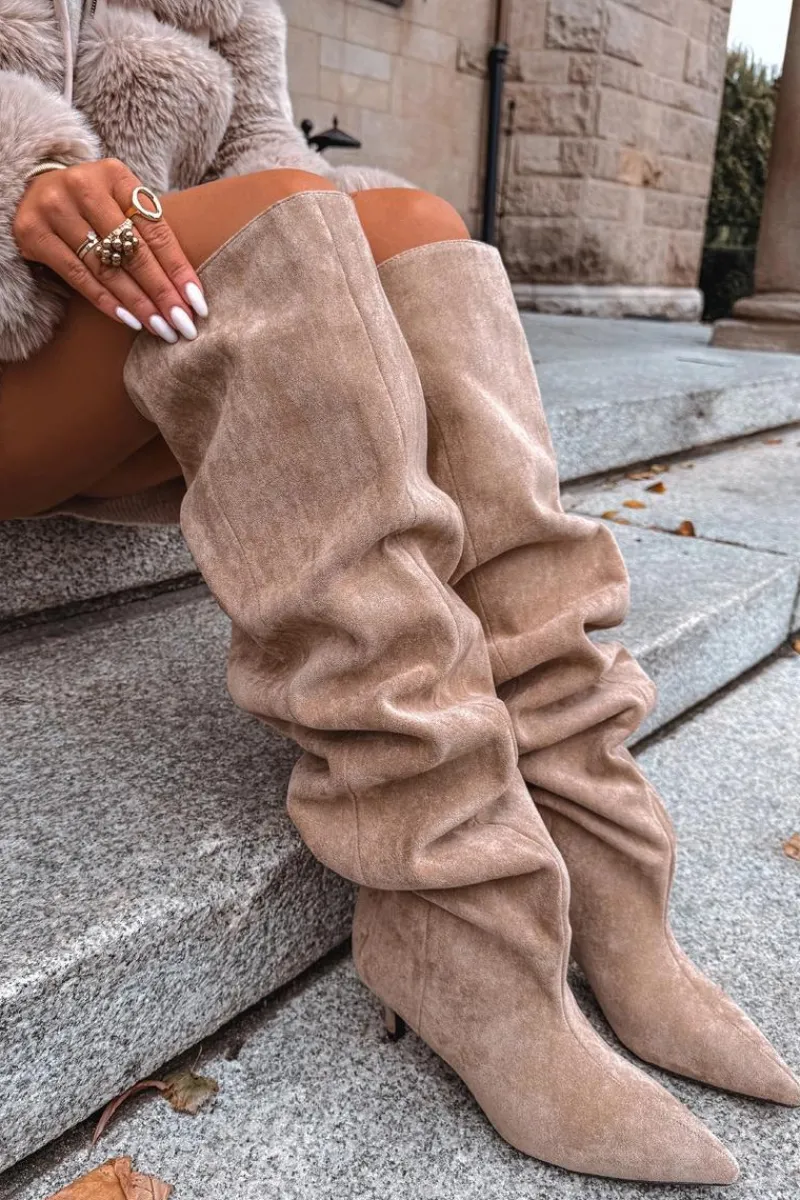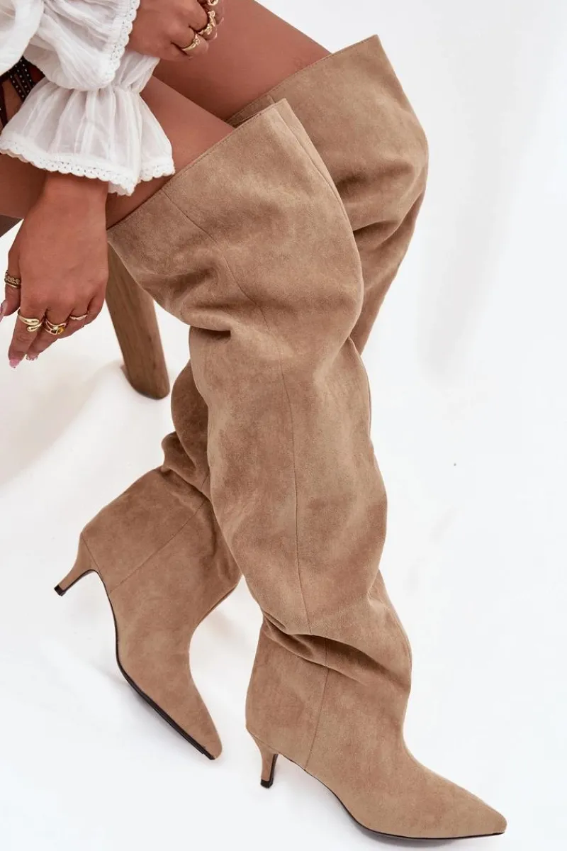 Kozaki damskie wykonane z eko zamszu. Model został osadzony na niskiej szpilce. Charakterystyczną cechą butów jest szeroka cholewka, która nie tylko nadaje im modnego wyglądu, ale również sprawia, że kozaki są wygodne w noszeniu i łatwe do dopasowania do każdej nogi. Wsuwany fason ułatwia szybkie zakładanie i zdejmowanie, czyniąc obuwie praktycznym w codziennym użytkowaniu. To kozaki, które doskonale sprawdzą się zarówno w zestawieniach casualowych, jak i bardziej eleganckich stylizacjach, dodając im wyrafinowanego charakteru. Przy wyborze rozmiaru prosimy kierować tabelą rozmiarów.