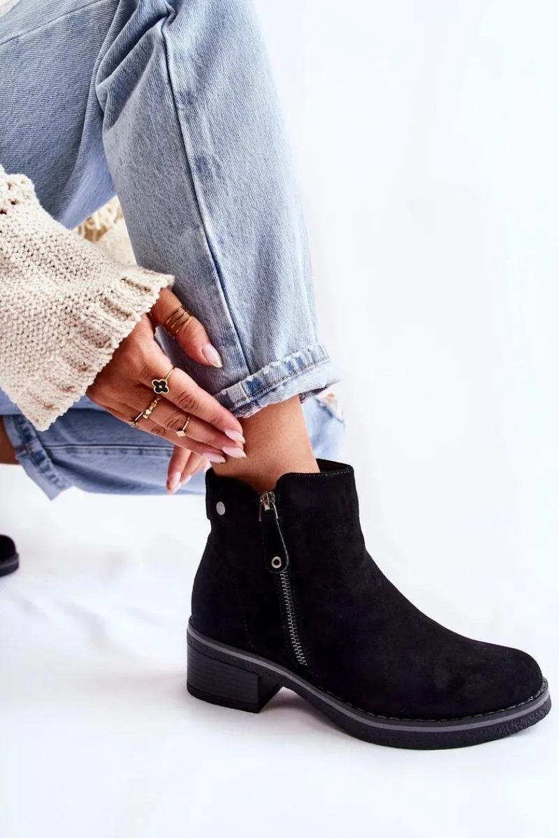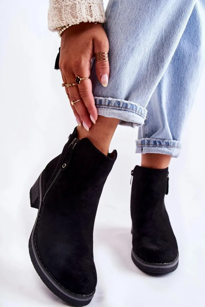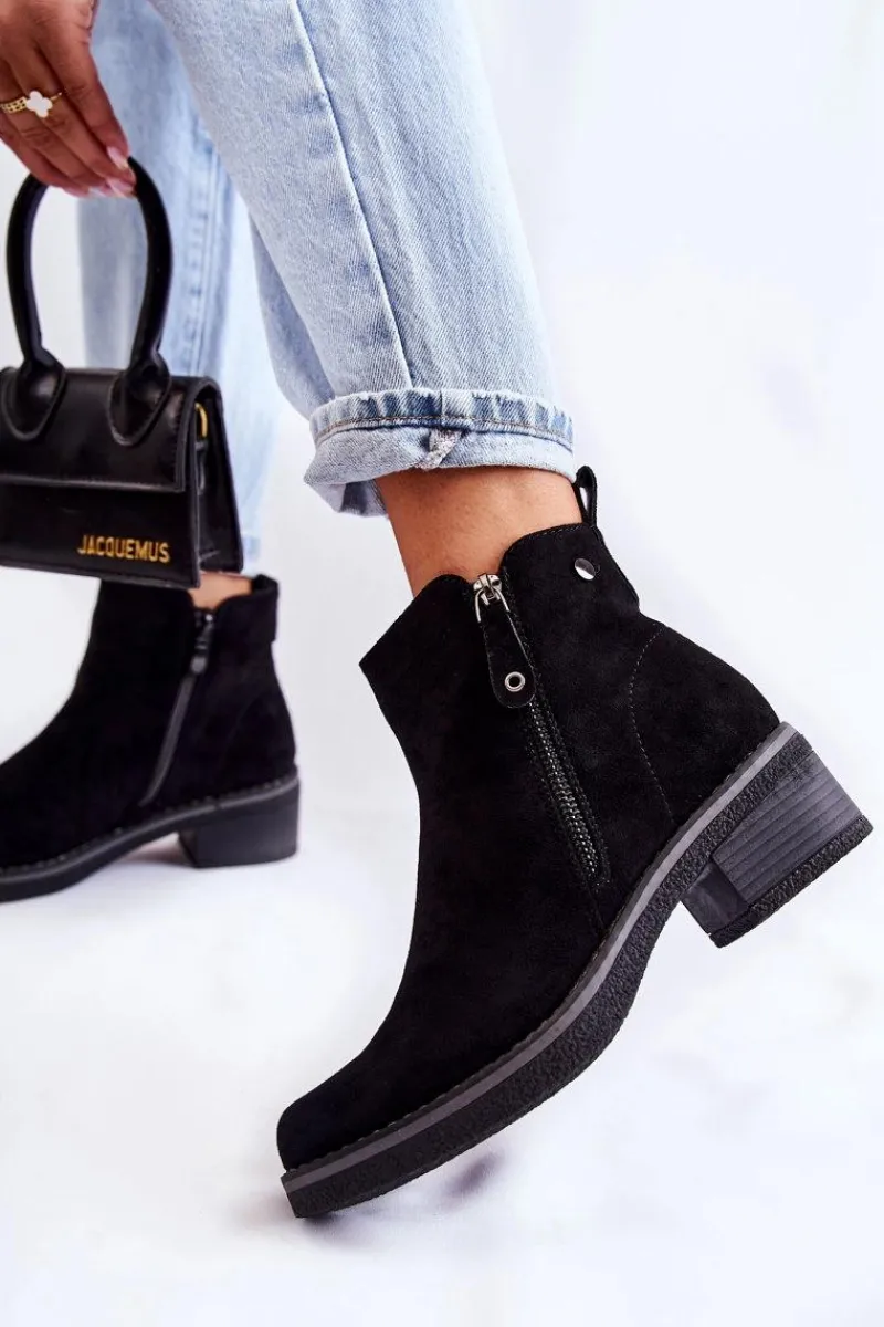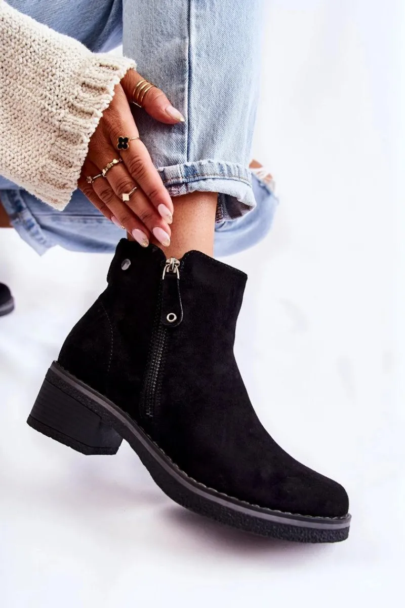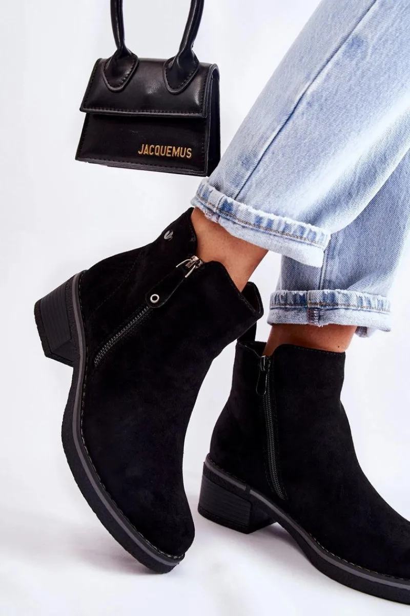 Klasyczne botki damskie osadzone na obcasie w postaci niskiego słupka. Podeszwa wykonana z gumowego tworzywa jest dodatkowo antypoślizgowa. Model posiada dwa suwaki – jeden z nich jest ozdobny. Buty zostały wykonane z eko zamszu z cholewką za kostkę. Posiadają usztywniany zapiętek. W środku ocieplane miłym w dotyku kocem obuwniczym. Świetny model na chłodniejsze dni! Przy wyborze rozmiaru prosimy sugerować się tabelą rozmiarów.