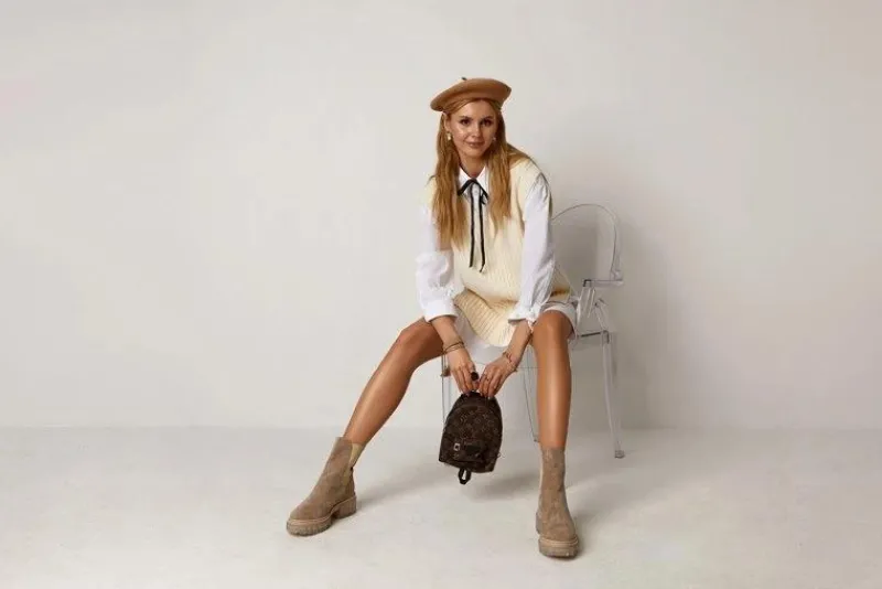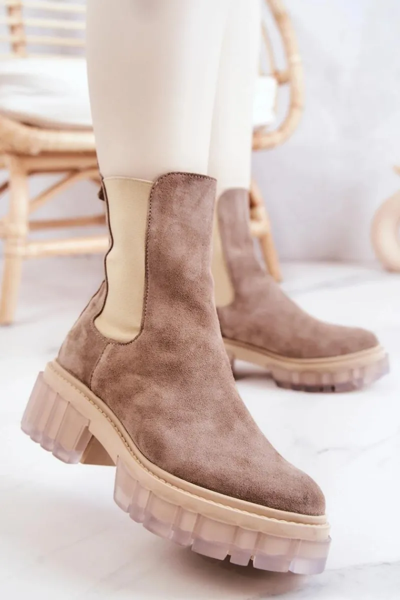 Botki na masywnej platformie z szerokim obcasem w stylu sztybletów. Posiadają wysoką, sięgającą ponad kostkę cholewkę. Wykonane z naturalnej zamszowej skóry. Posiadają dodatkową, elastyczną wstawkę, dzięki której cholewka świetnie dopasuje się do tęgości nogi. Boki podeszwy są ozdobione przezroczystym, gumowym tworzywem. Przy wyborze rozmiaru prosimy kierować się tabelą rozmiarów