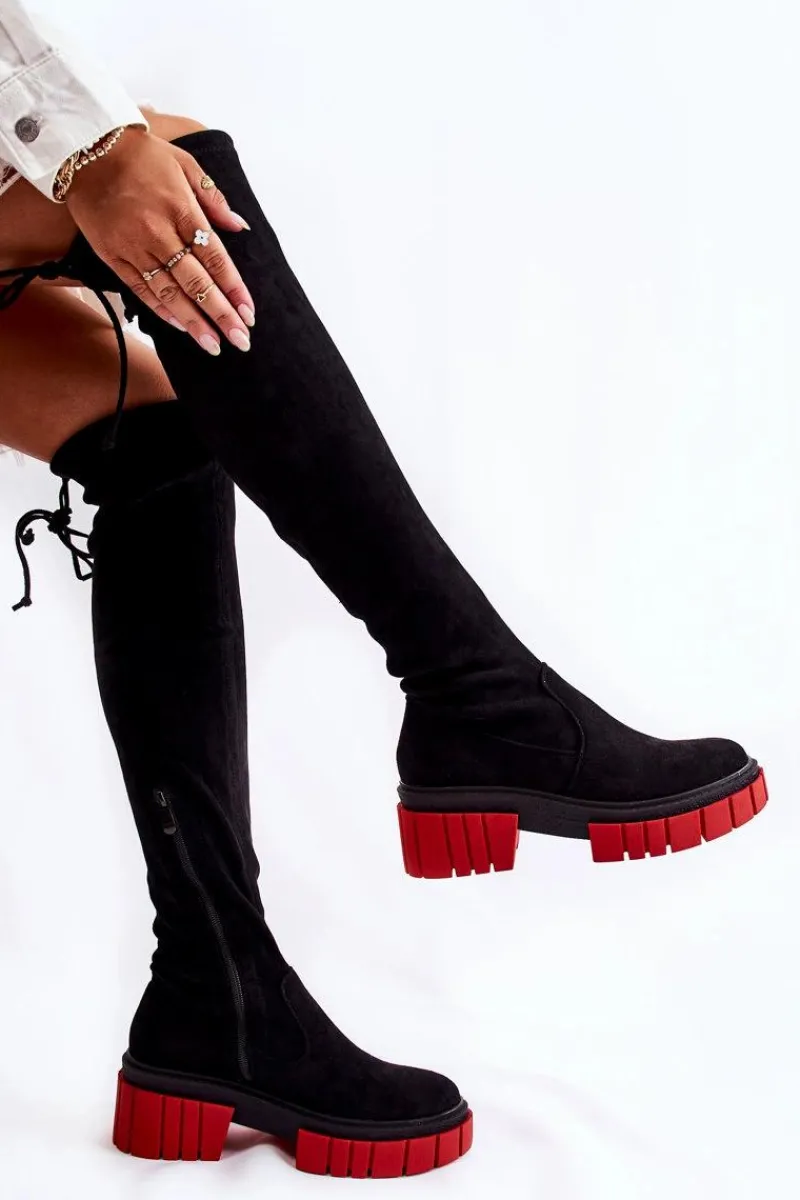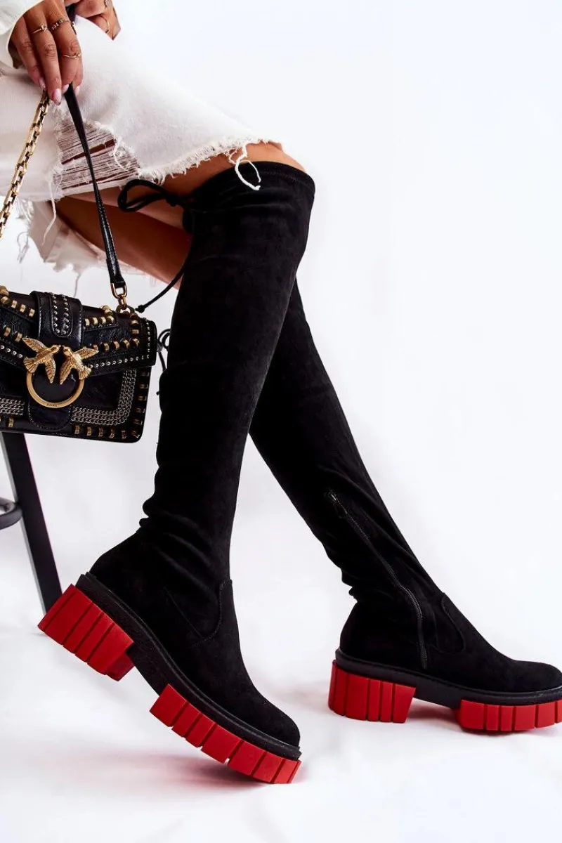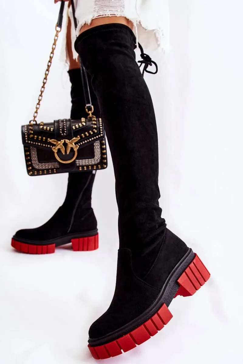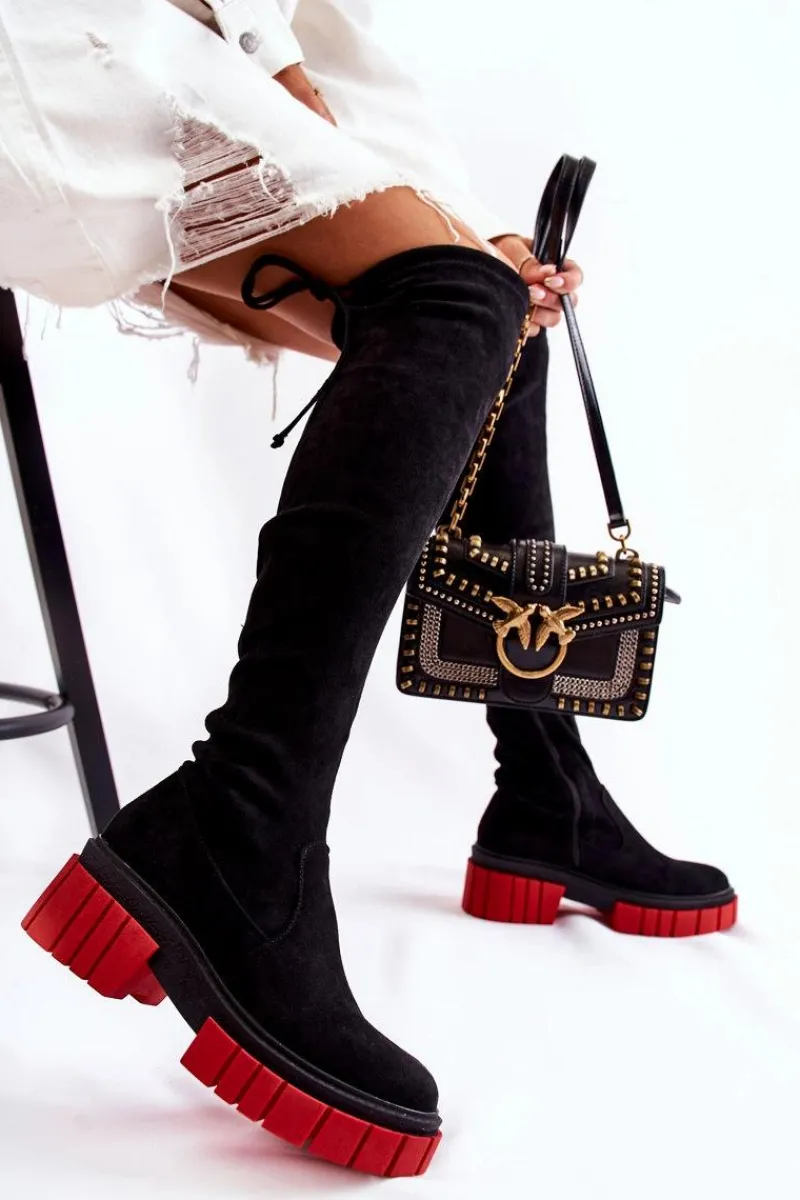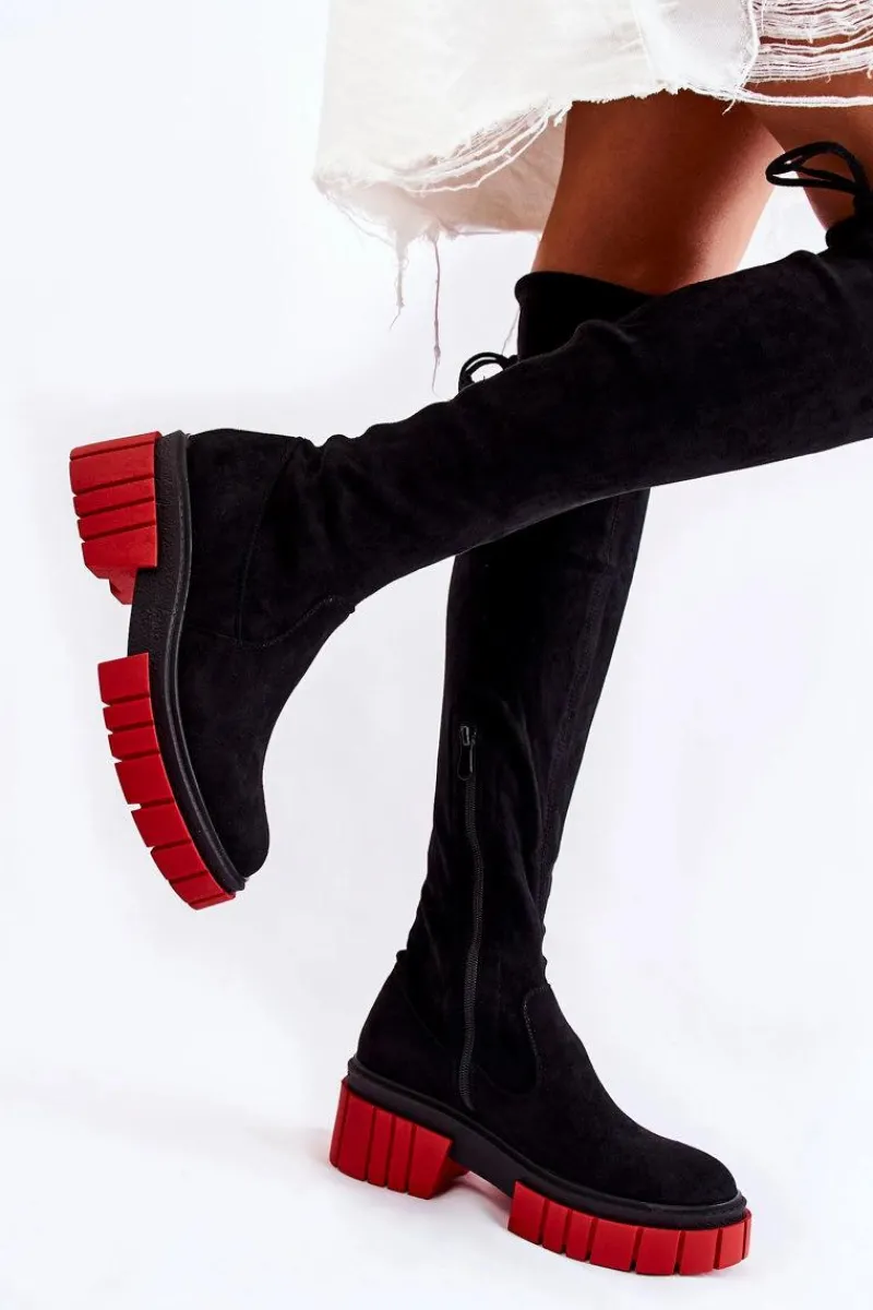 Best Zamszowe Damskie Kozaki Za Kolano Czarno-Czerwone Cheera Damskie Muszkieterki|Kozaki Wiosenne