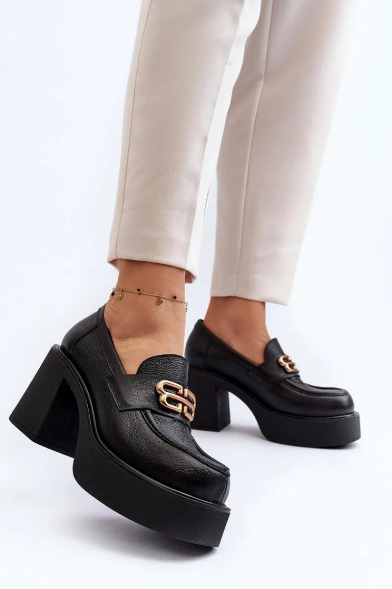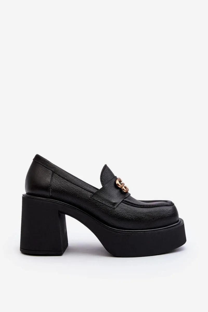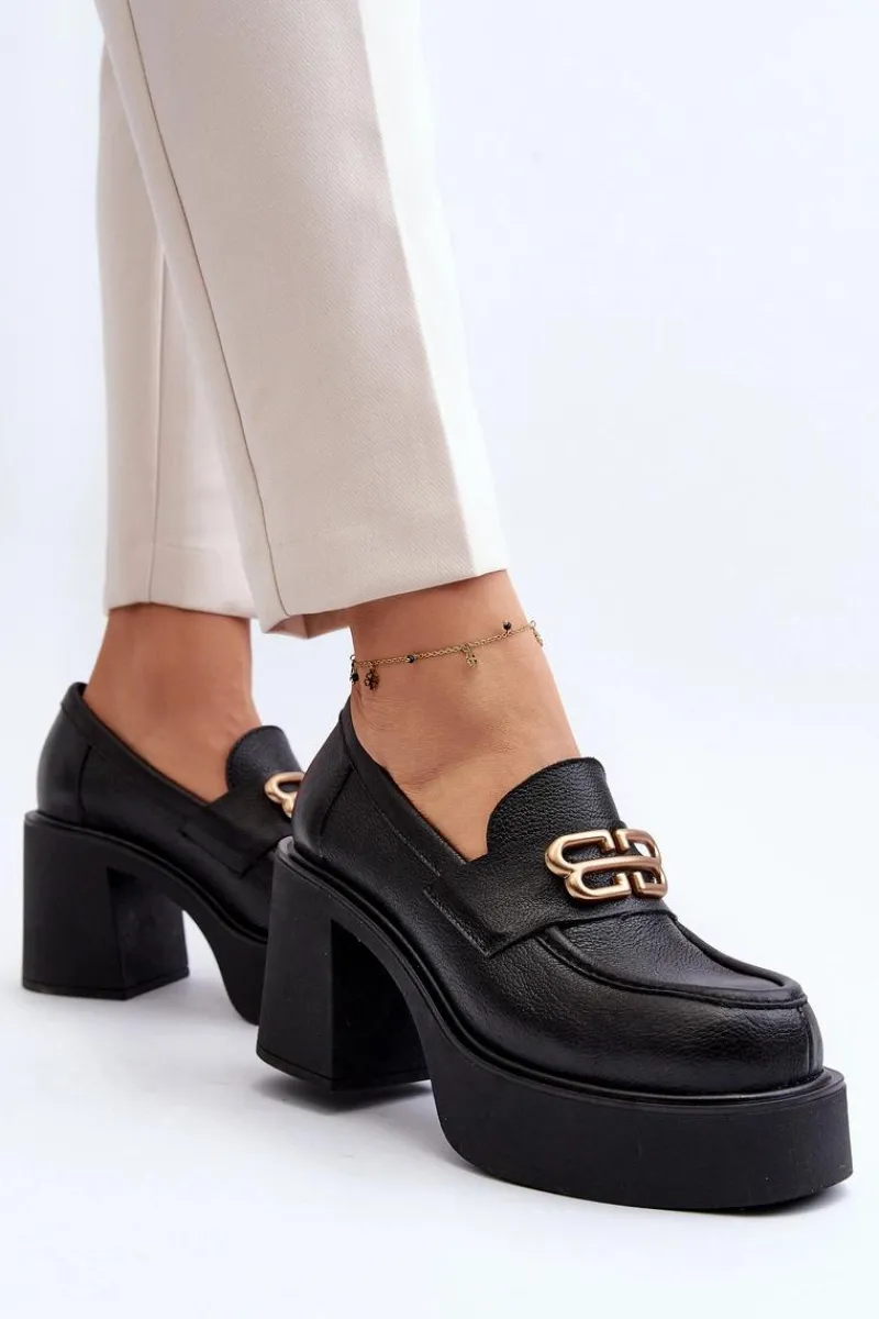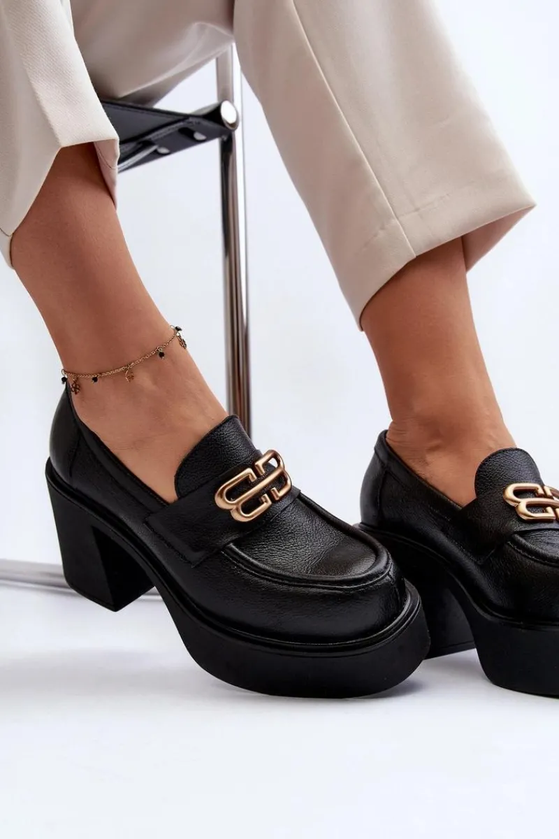 Damskie półbuty na obcasie z cholewką wykonaną ze skóry naturalnej. Osadzone na grubej podeszwie oraz obcasie w postaci masywnego słupka. Model ten posiada zaokrąglone noski. Skórzana wkładka zapewni wygodę podczas użytkowania. Z przodu pasek oraz ozdoba. Przy wyborze rozmiaru prosimy sugerować się tabelą rozmiarów.