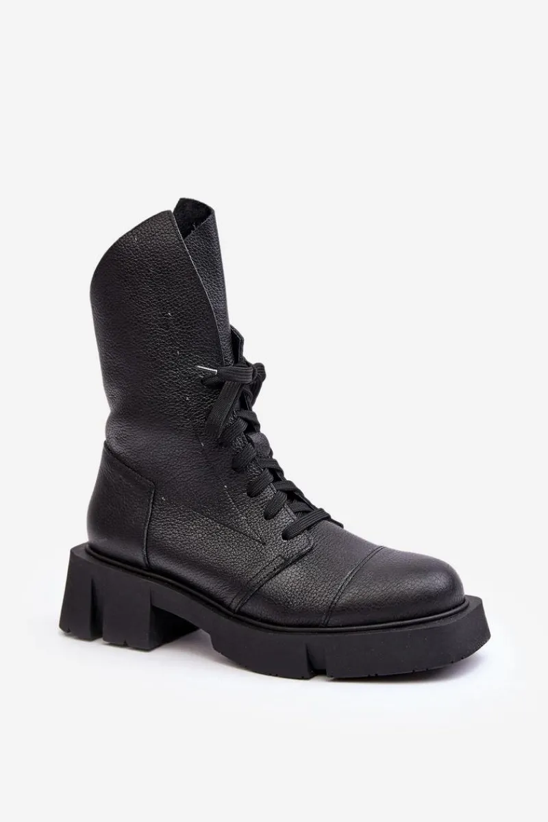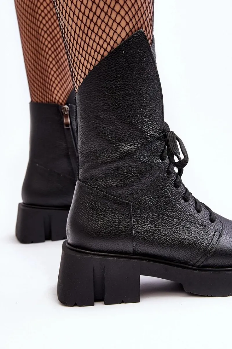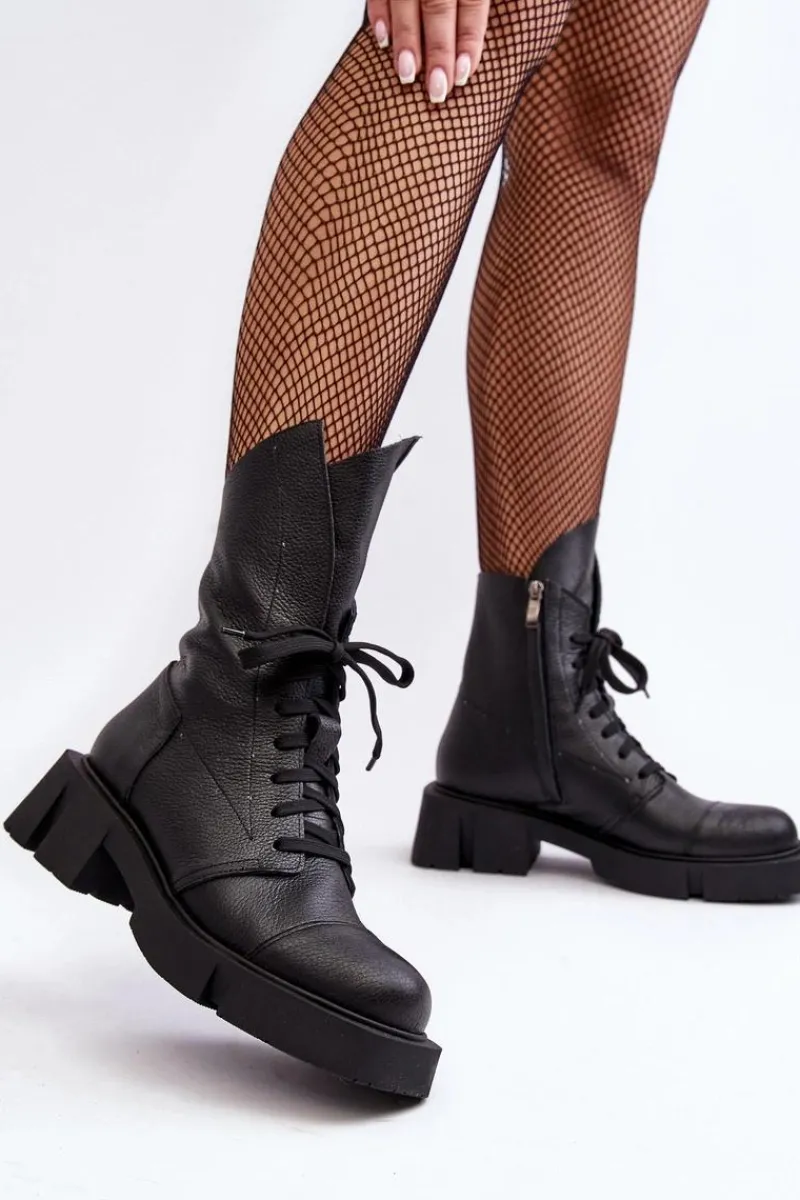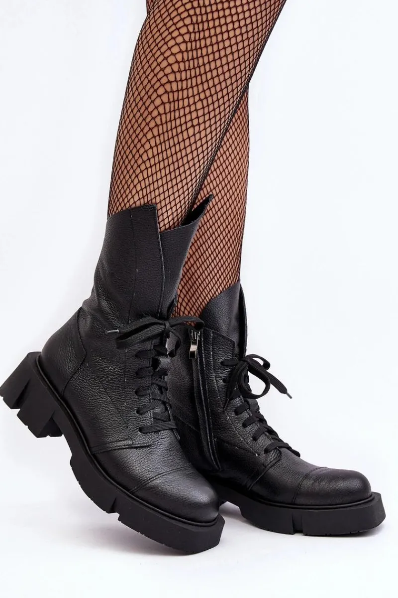 Botki damskie wykonane ze skóry naturalnej. Osadzona na masywnym, płaskim obcasie oraz platformie. Zapinane na suwak. Z przodu sznurowanie. Zapiętek jest usztywniony. Miękka wkładka zapewni komfort podczas użytkowania. Noski zaokrąglone. Ten modny model będzie pasować do wielu jesienno-zimowych stylizacji! Przy wyborze rozmiaru prosimy sugerować się tabelą rozmiarów.