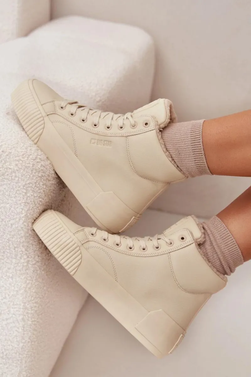 Trampki damskie od marki Big Star. Wykonane z eko skóry, osadzone na platformie z gumowego tworzywa, zapewniają wygodę i stabilność na każdym kroku. Model sznurowany pozwala na idealne dopasowanie do stopy, a ocieplenie kożuszkiem wewnątrz butów gwarantuje ciepło w chłodniejsze dni. Doskonałe na co dzień, te trampki łączą styl z funkcjonalnością, stanowiąc świetny wybór do jesiennych i zimowych stylizacji. Przy wyborze rozmiaru prosimy sugerować się tabelą rozmiarów.
