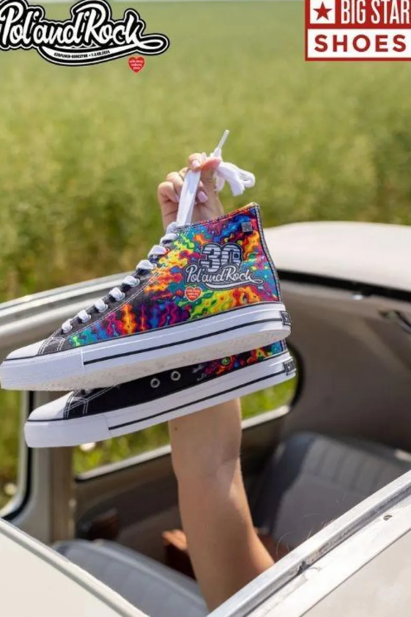 Wykonane z wysokiej jakości materiałów, te buty gwarantują całodzienny komfort. Inspirowany Pol’and’Rock Festival design wyróżnia się żywymi kolorami i wzorami. Logo 30-lecia festiwalu na boku buta podkreśla ich unikalność. Gumowa podeszwa zapewnia trwałość i dobrą przyczepność, idealne na ulice i koncerty. Wkładka z wentylacją utrzymuje świeżość stóp przez wiele godzin. Sznurowanie gwarantuje dopasowanie, a wysoki krój dodaje stylu i chroni kostkę.