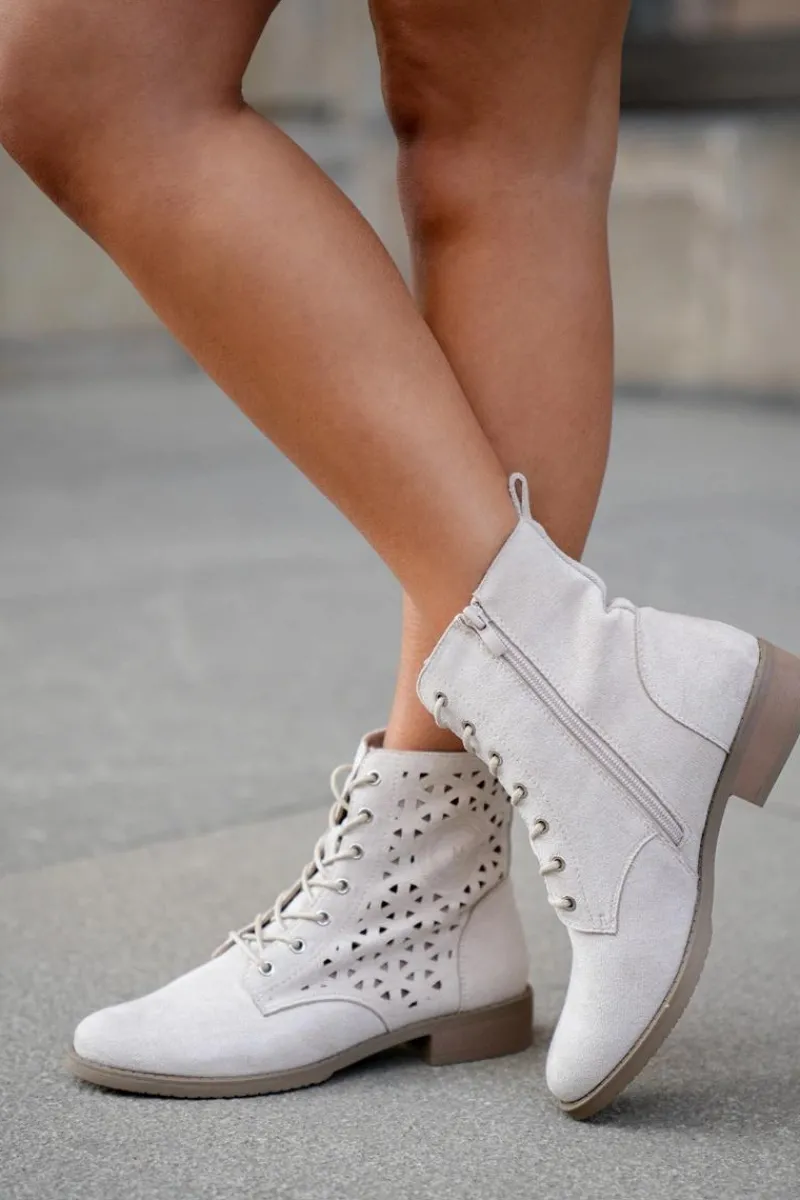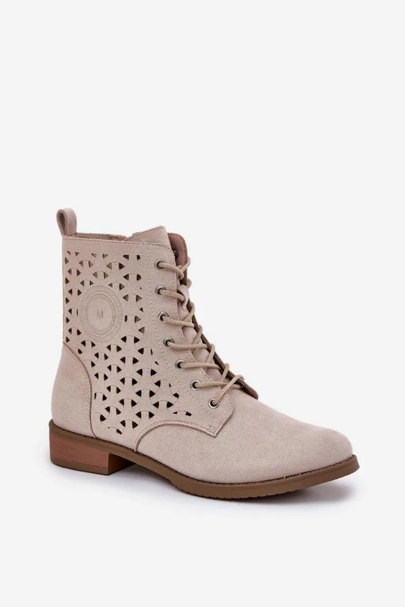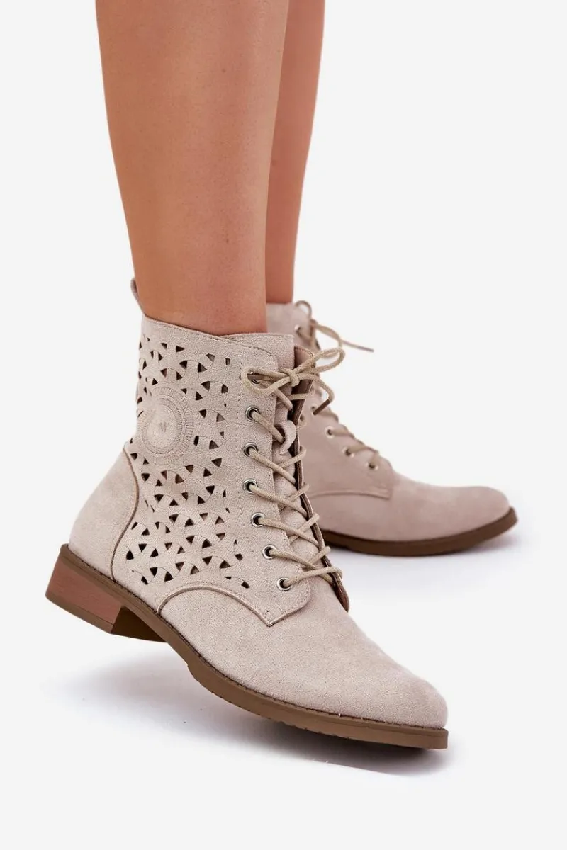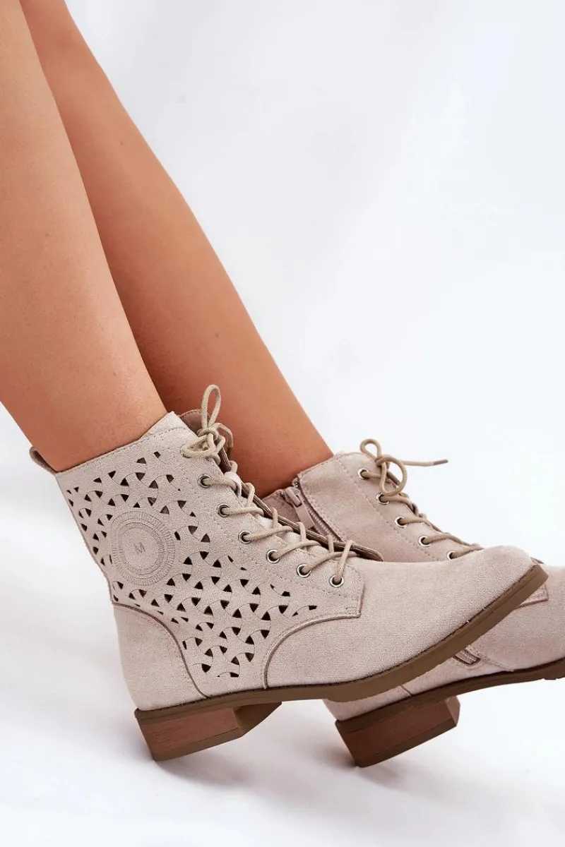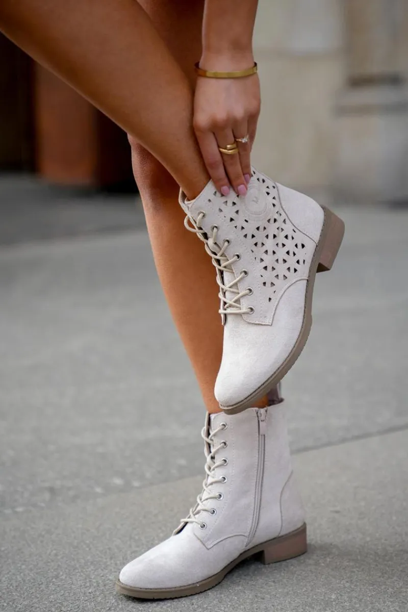 Botki damskie od marki Jezzi. Wykonane z eko zamszu to elegancka i komfortowa propozycja na co dzień. Osadzone na płaskim obcasie, zapewniają stabilność i wygodę przez cały dzień. Zaokrąglone noski dodają im subtelnego charakteru, a ażurowy wzór na cholewce nadaje lekkości i nowoczesnego wyglądu. Zapinane na zamek, co ułatwia zakładanie, a skórzana wkładka gwarantuje wygodę i komfort. Te botki doskonale komponują się w casualowych stylizacjach! Przy wyborze rozmiaru prosimy sugerować się tabelą rozmiarów.