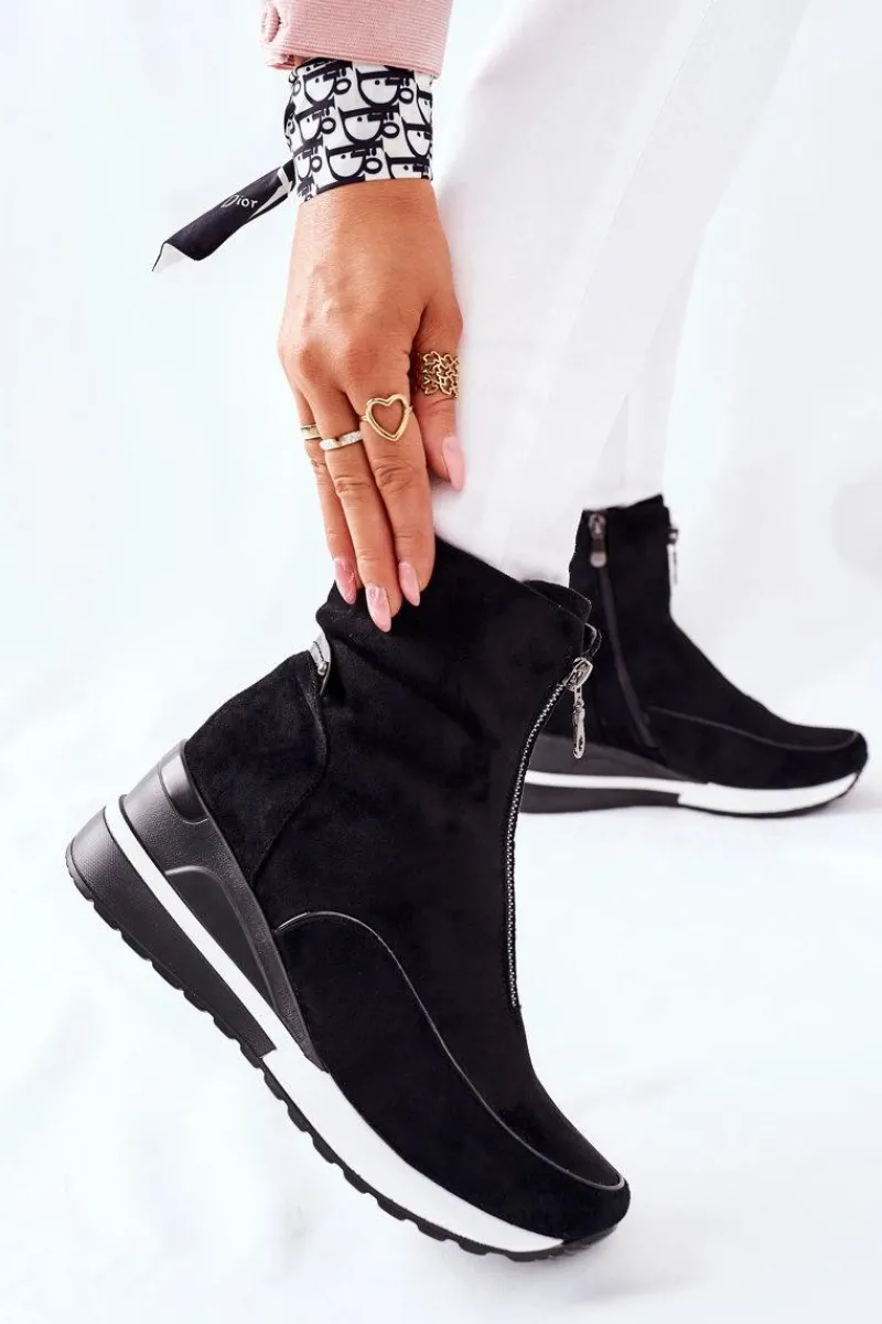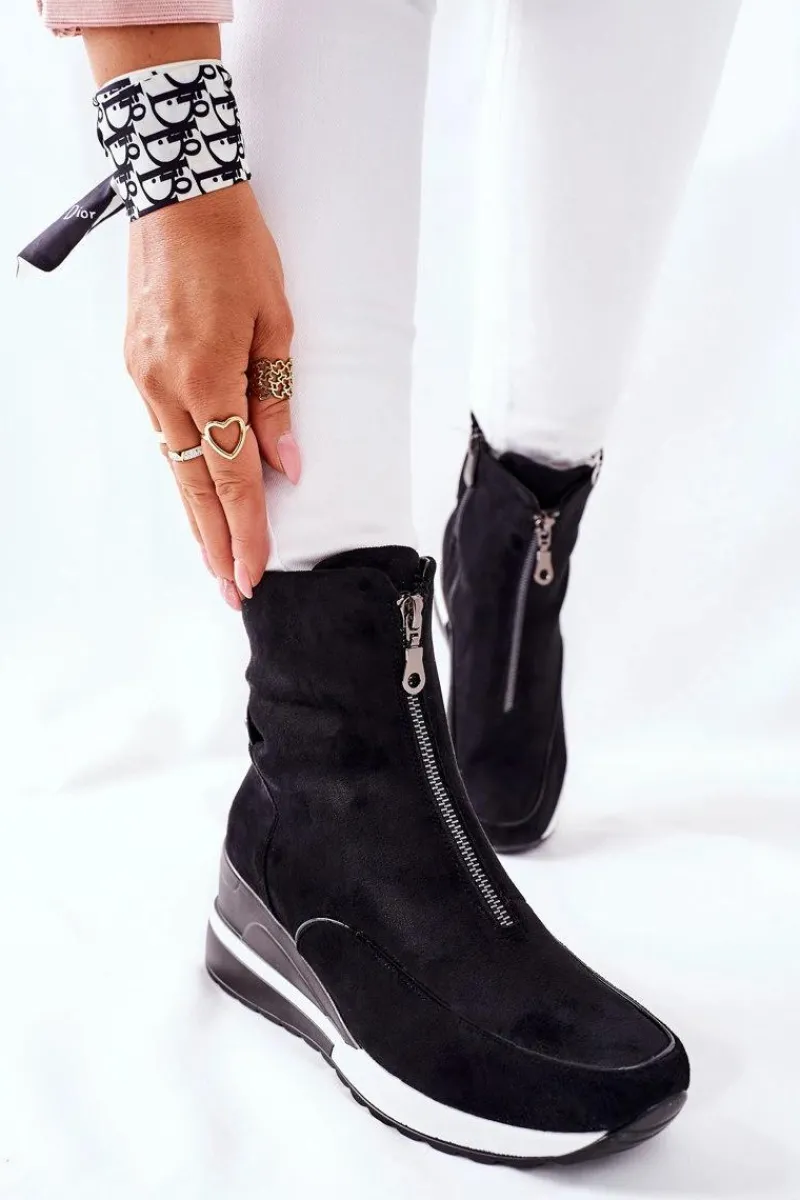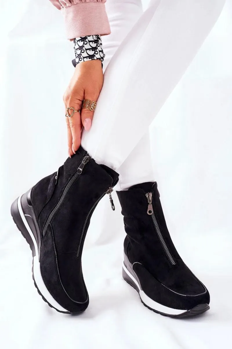 Botki sadzone na podeszwie z ukrytym koturnem. W środku ocieplenie w postaci koca obuwniczego. Z przodu cholewki ozdobny zamek. Przy wyborze rozmiaru prosimy sugerować się tabelą rozmiarów.