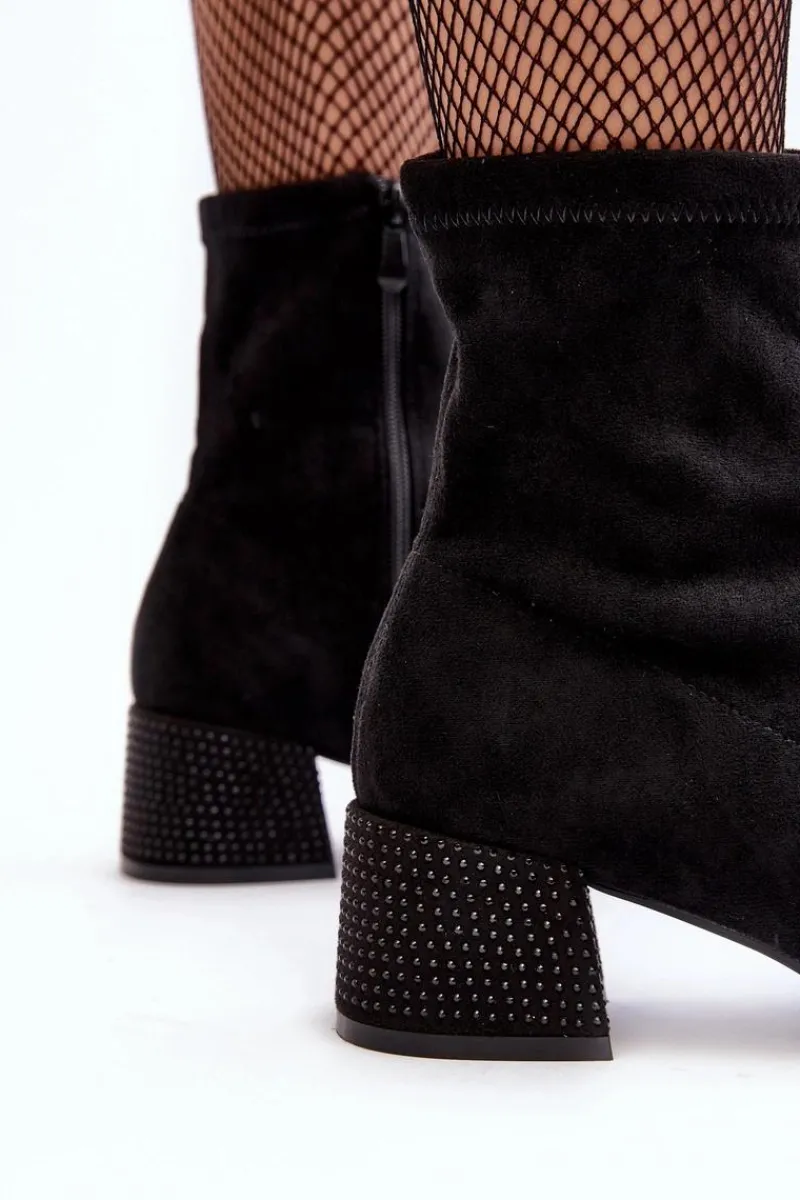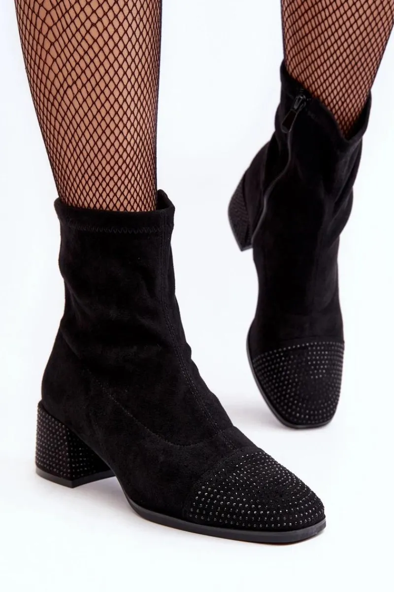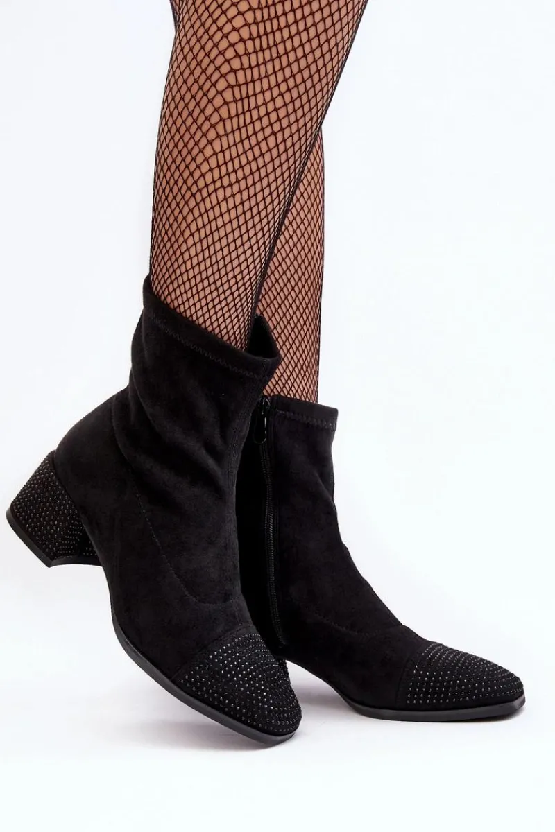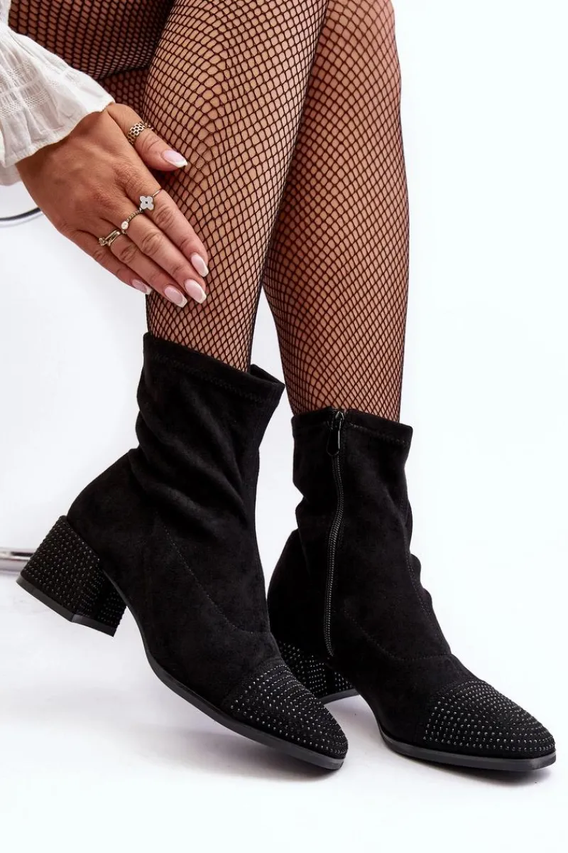 Botki damskie z cholewką za kostkę. Wykonane z eko zamszu. Osadzone na niskim, ozdobionym dżetami obcasie. Zapinane na zamek. Noski zaokrąglone. Środek ocieplony kocem obuwniczym wyłącznie na wysokości stopy. Klasyczny model, idealny do wielu jesiennych stylizacji! Przy wyborze rozmiaru prosimy sugerować się tabelą rozmiarów.