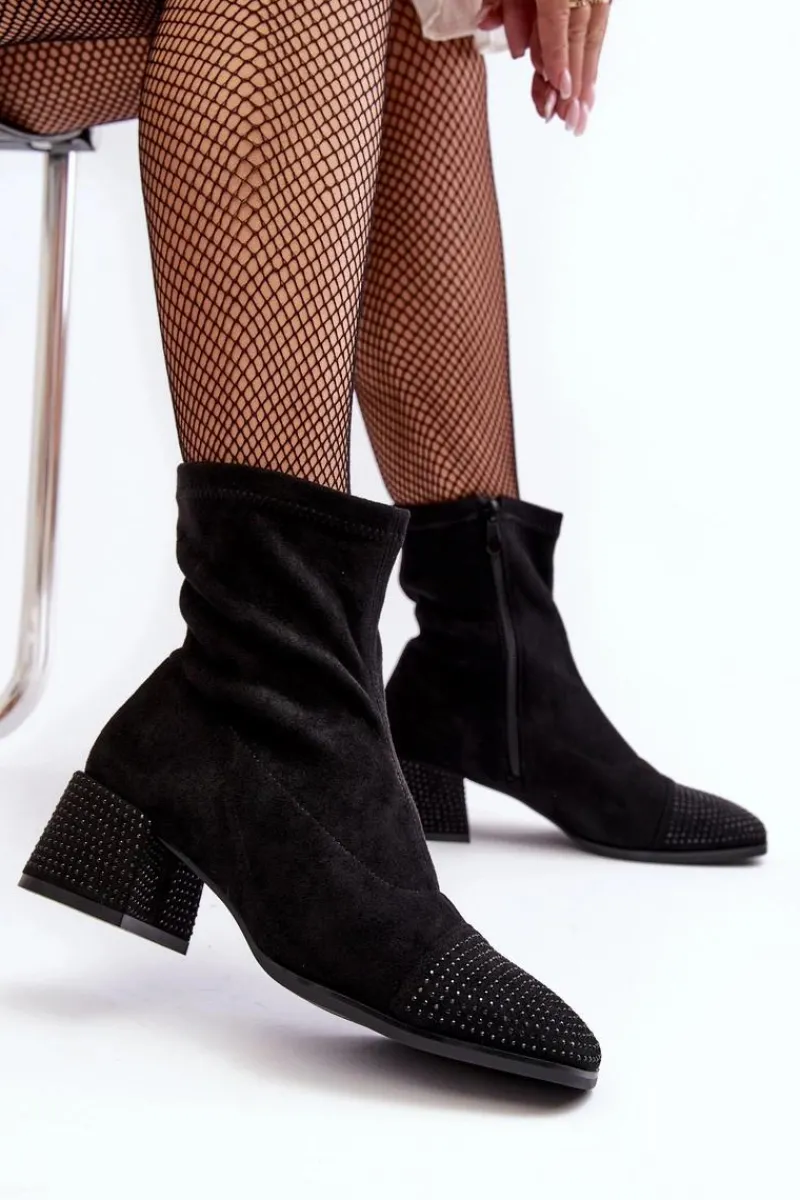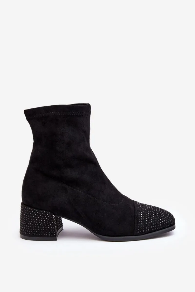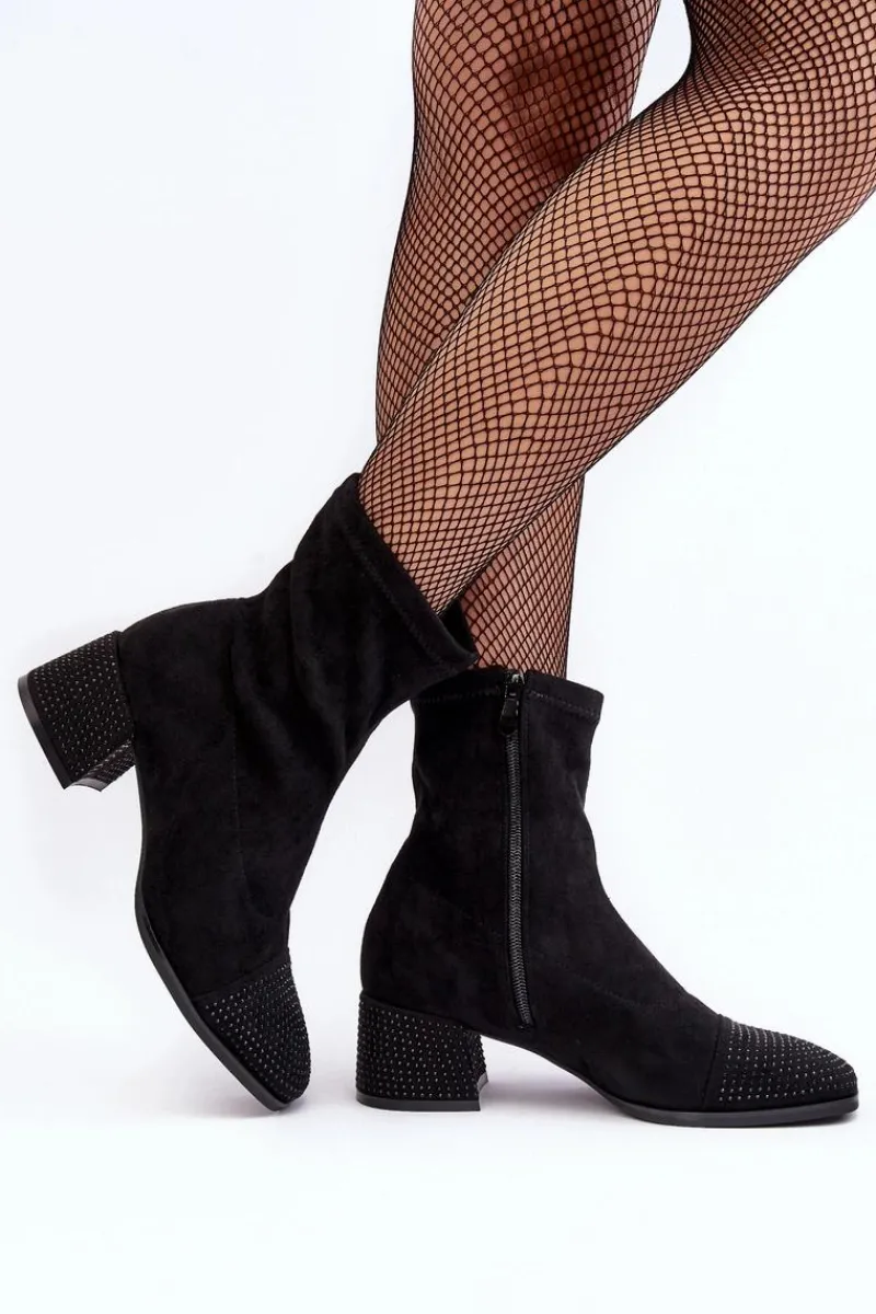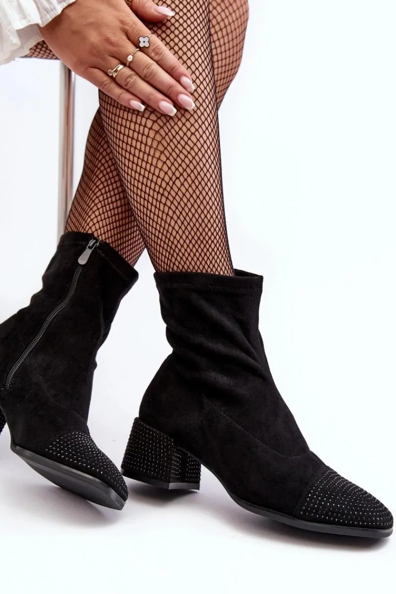 Botki damskie z cholewką za kostkę. Wykonane z eko zamszu. Osadzone na niskim, ozdobionym dżetami obcasie. Zapinane na zamek. Noski zaokrąglone. Środek ocieplony kocem obuwniczym wyłącznie na wysokości stopy. Klasyczny model, idealny do wielu jesiennych stylizacji! Przy wyborze rozmiaru prosimy sugerować się tabelą rozmiarów.