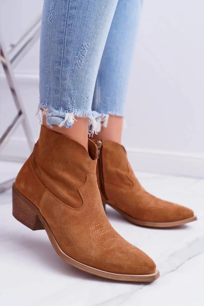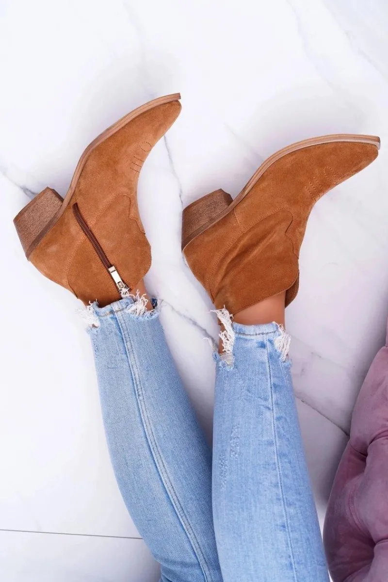 Botki Damskie Płaski Obcas Wiosenne Skórzane Kowbojki Camel Batty Damskie Botki Wiosenne|Brązowe I Beżowe Botki