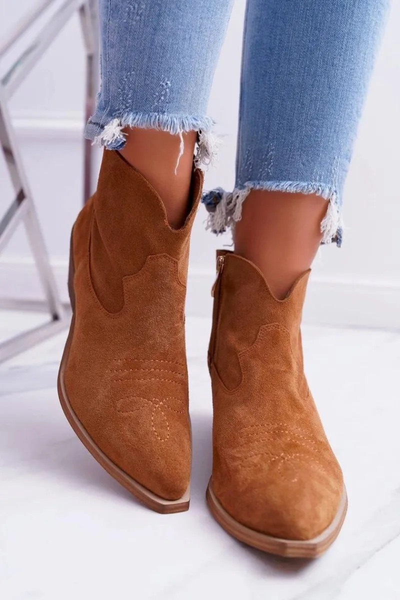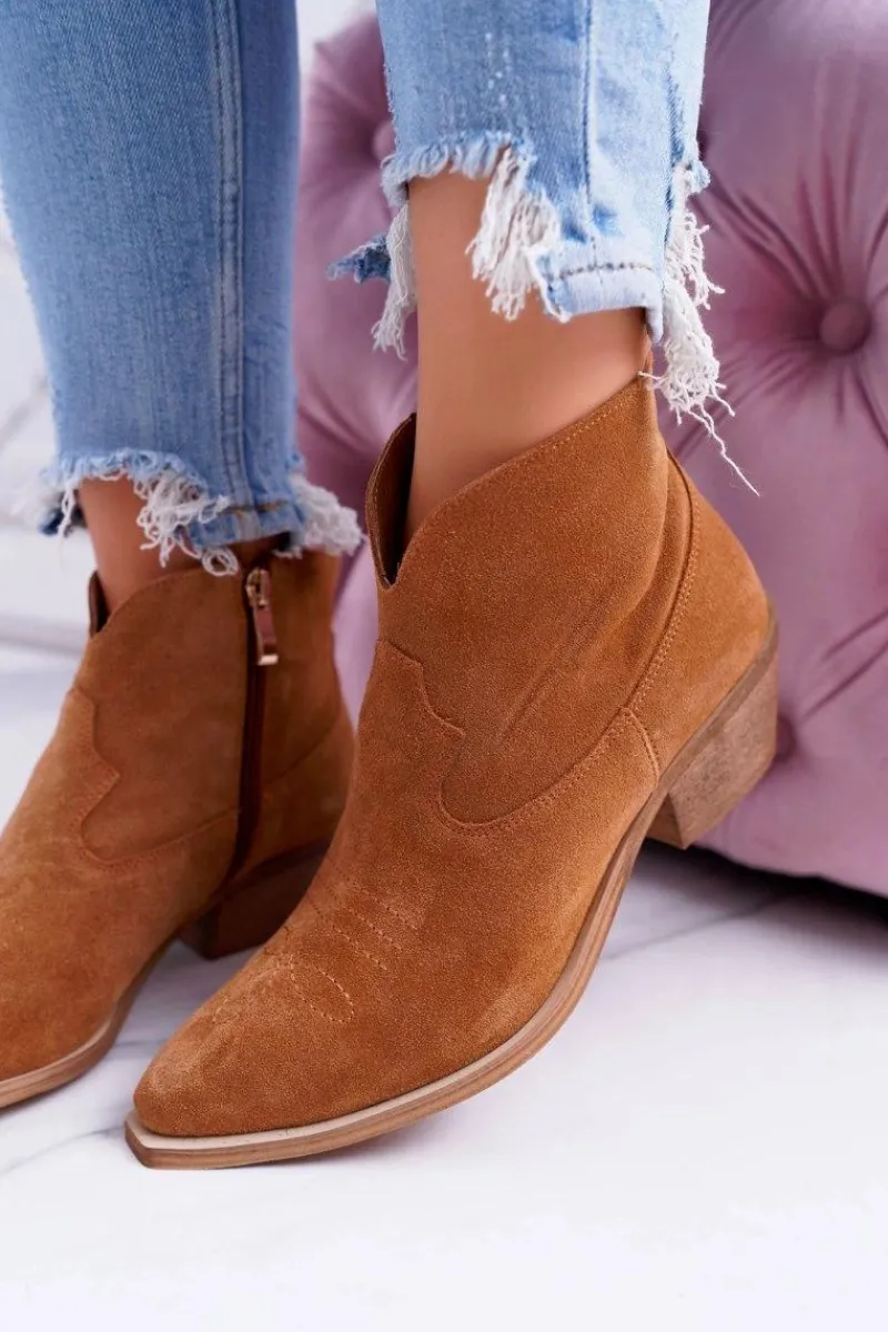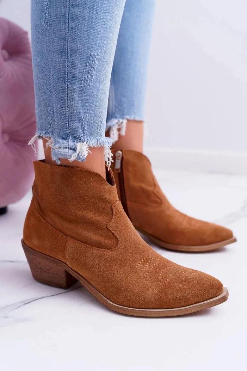 Botki to nie tylko buty na chłodne dni. Świetnie sprawdzą się również podczas tworzenia wiosennych stylizacji. Produkt polski, wykonany w całości ze skóry zamszowej. Delikatny, 5cm płaski obcas uniesie Twoją sylwetkę i podkreśli stylizacje. Styl kowbojek nigdy nie wyjdzie z mody. Idealne do zwiewnych sukienek oraz jeansowych spodni. Przy wyborze rozmiaru prosimy sugerować się tabelą rozmiarów.