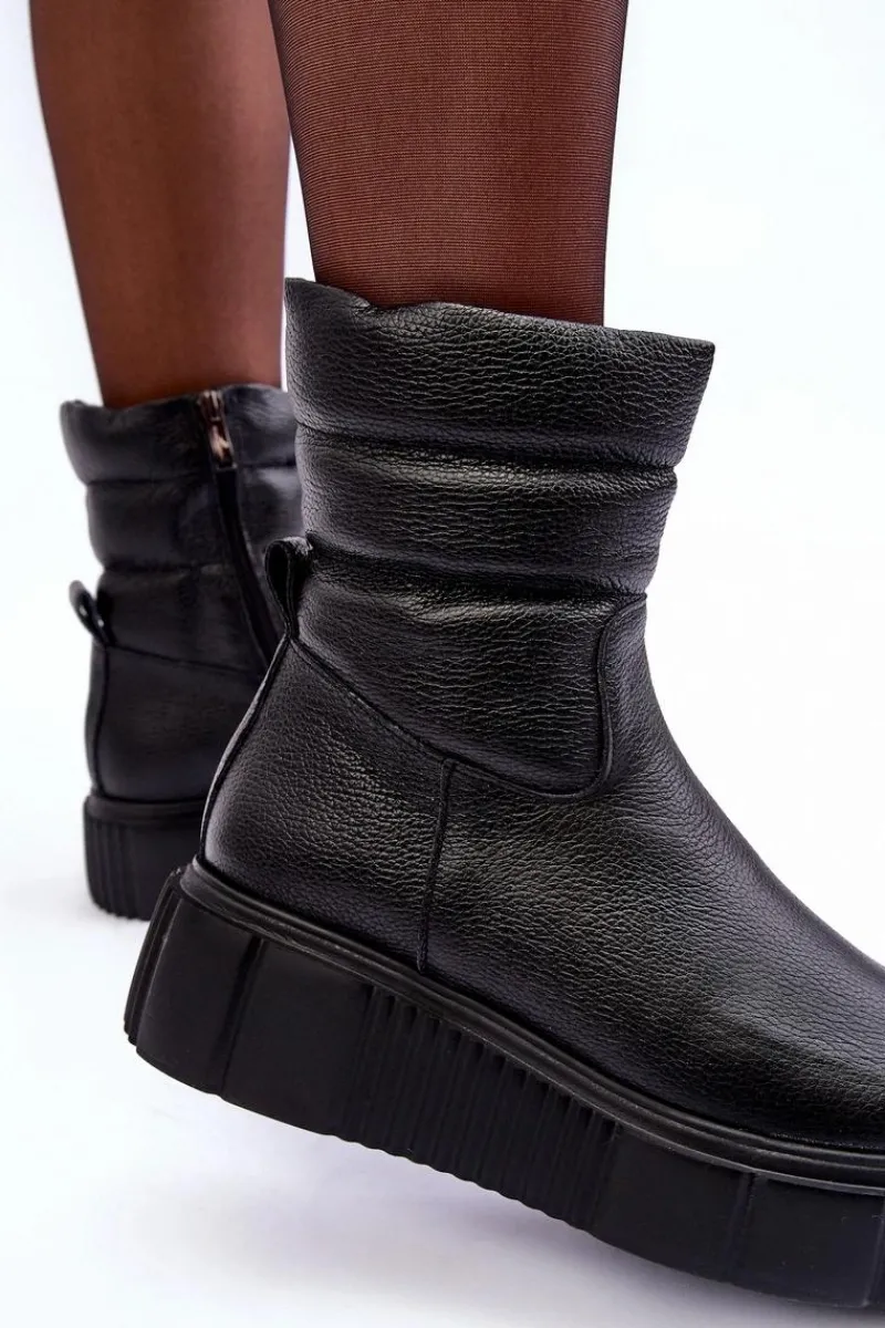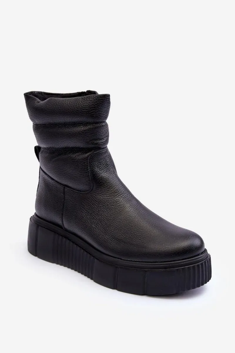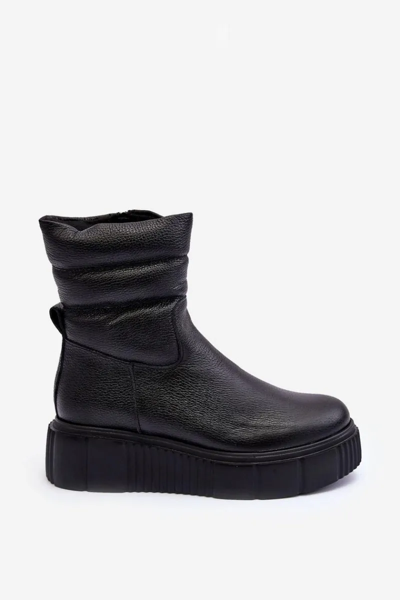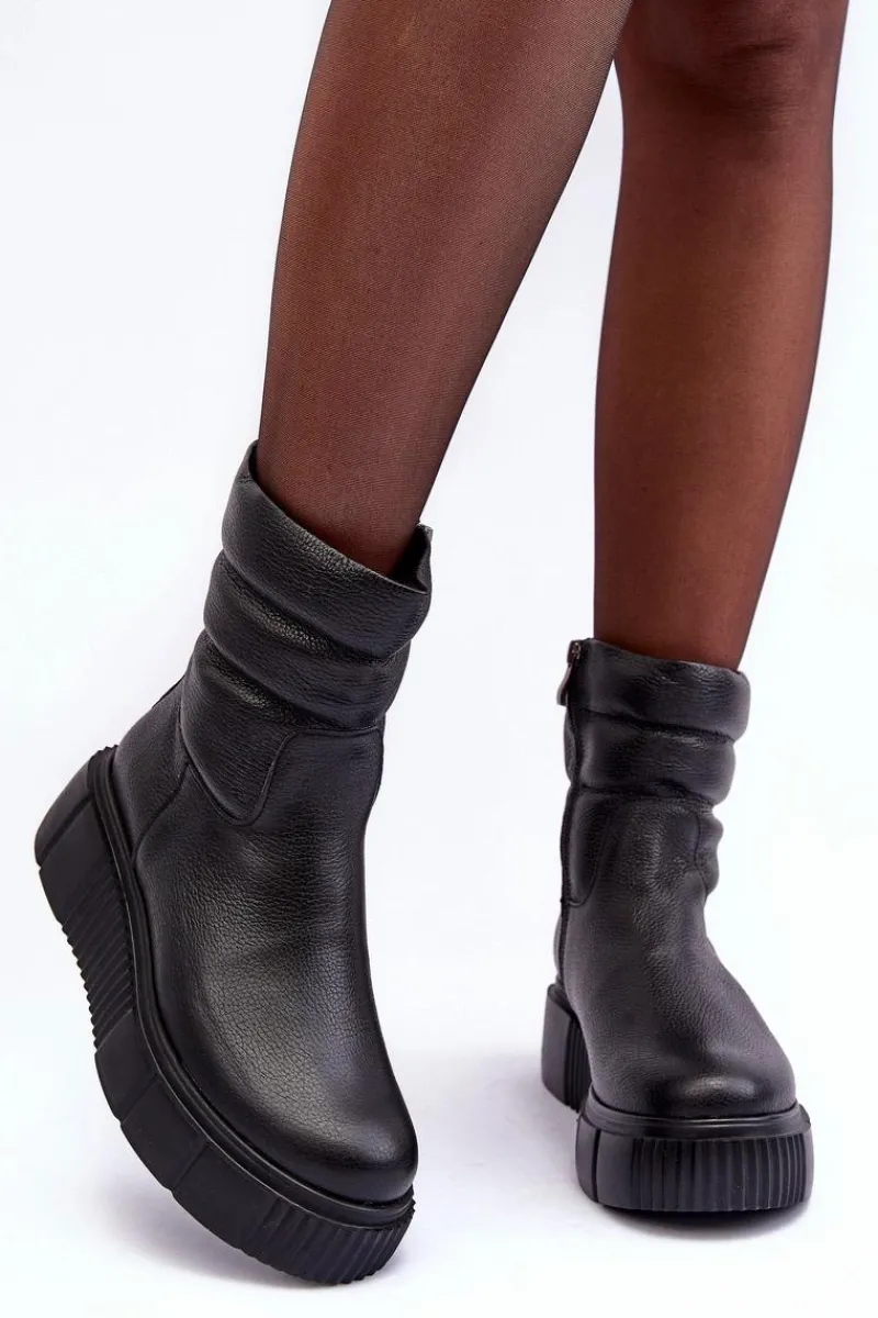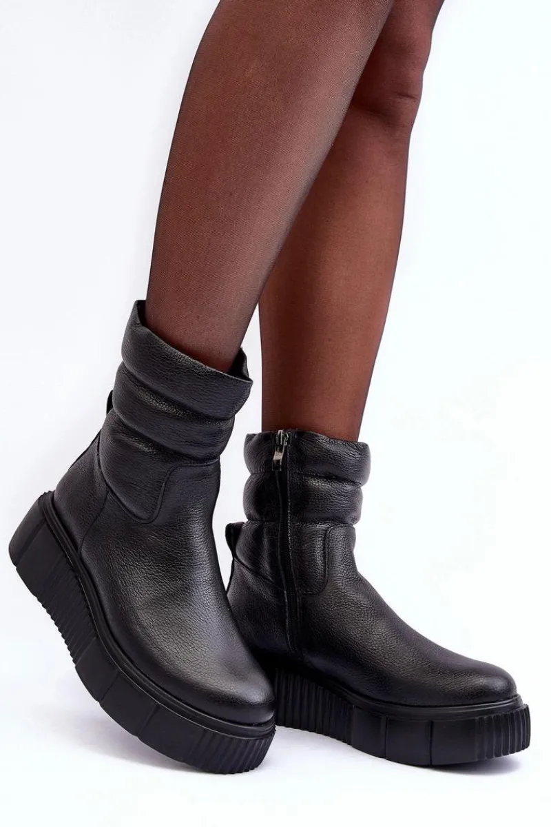 Botki damskie zostały wykonane z wysokiej jakości naturalnych skór. Zapinane z boku cholewki na suwak. Osadzone na masywnej platformie z delikatnym koturnem. Ocieplone w środku kocem obuwniczym. Noski zaokrąglone. Model ten na pewno sprawdzi się w wielu jesiennych stylizacjach! Przy wyborze rozmiaru prosimy kierować się tabelą rozmiarów