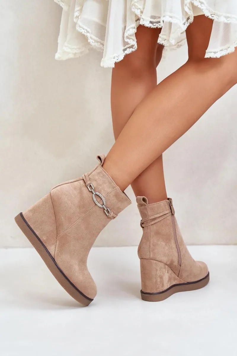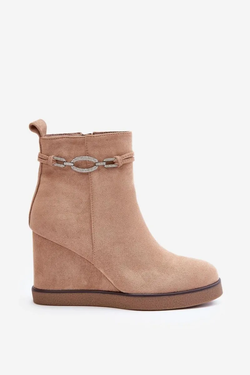 Botki damskie wykonane z eko zamszu, prezentują się niezwykle elegancko. Zapinanie na zamek ułatwia szybkie i wygodne zakładanie oraz zdejmowanie. Osadzone na koturnie. Zapiętek został usztywniony dla dodatkowego wsparcia, a zaokrąglone noski dodają klasycznego uroku. Na cholewce ozdobny paseczek. Wnętrze jest ocieplone kocem obuwniczym, co gwarantuje ciepło i komfort nawet w najchłodniejsze dni. Przy wyborze rozmiaru prosimy sugerować się tabelą rozmiarów.