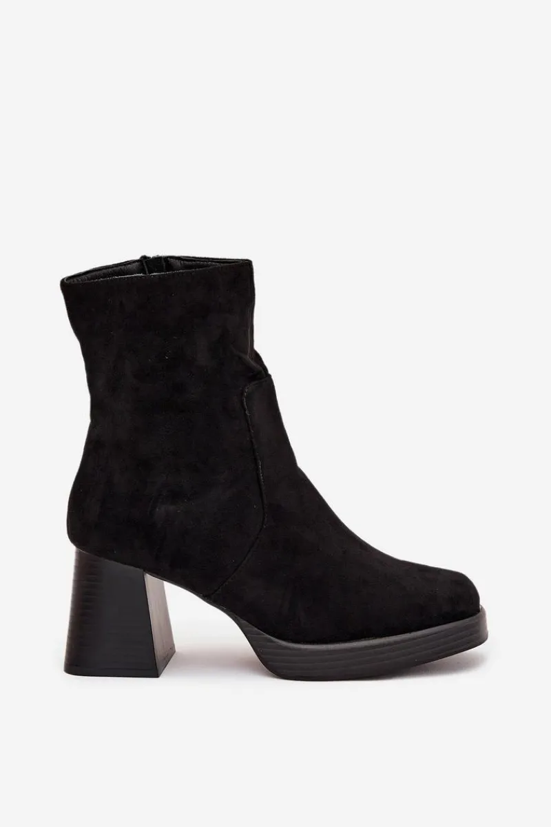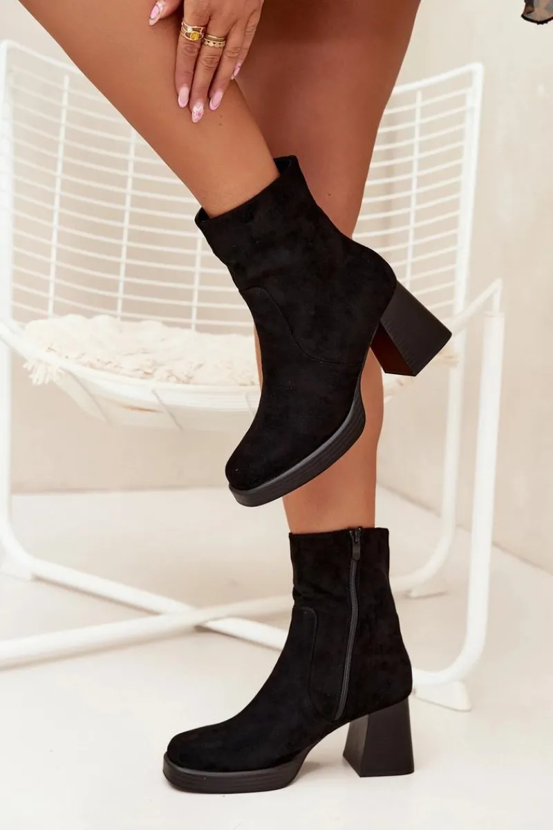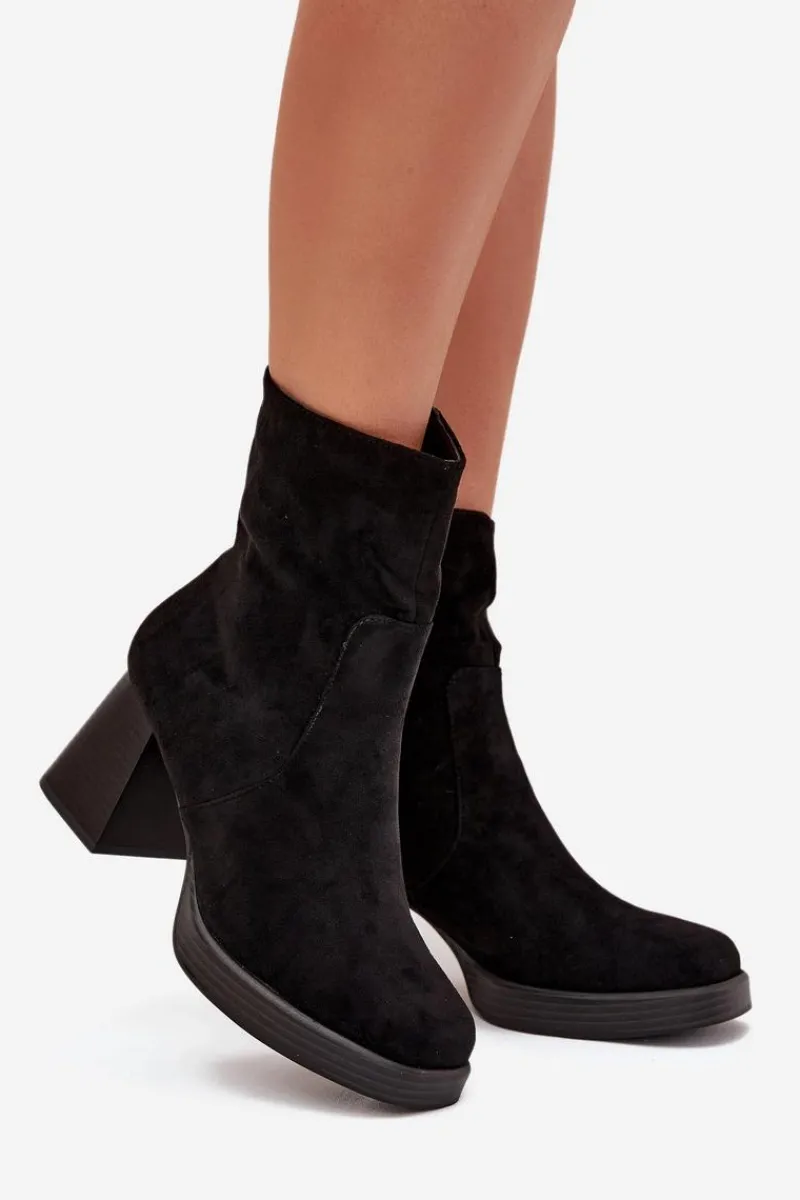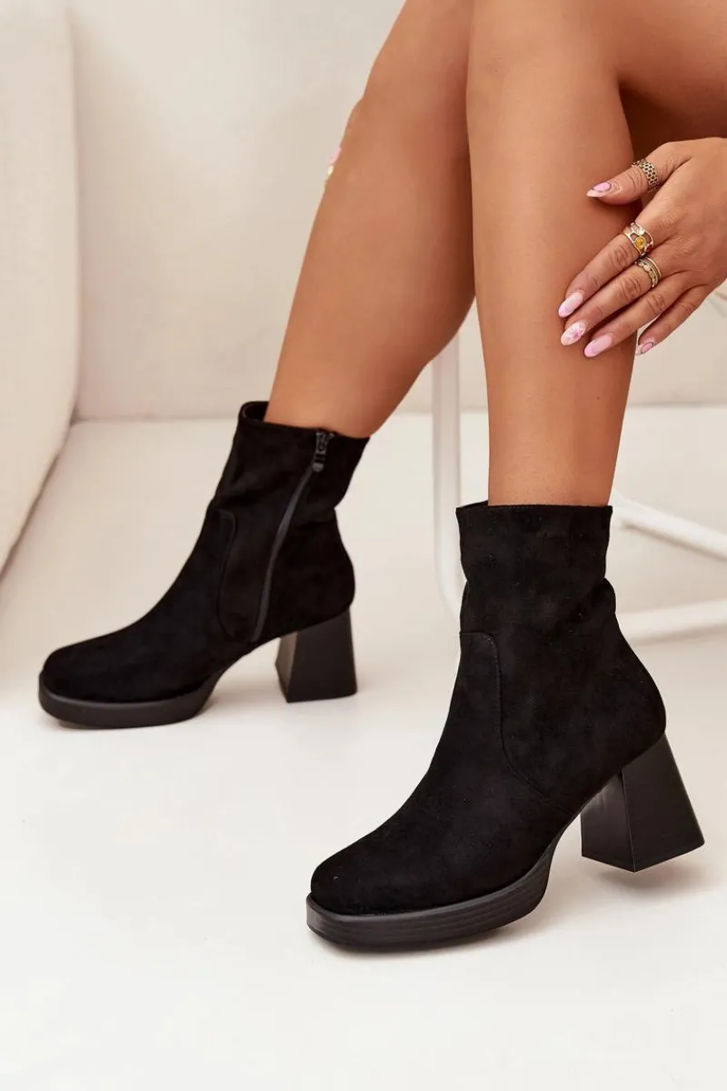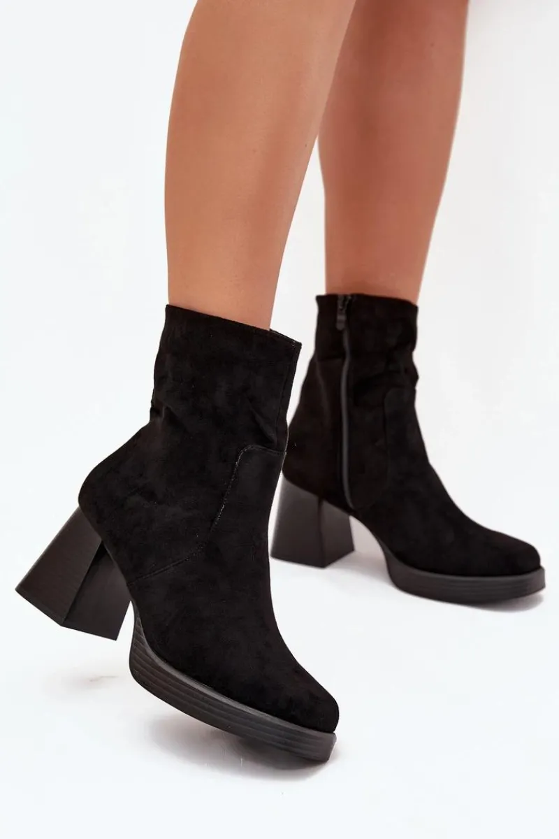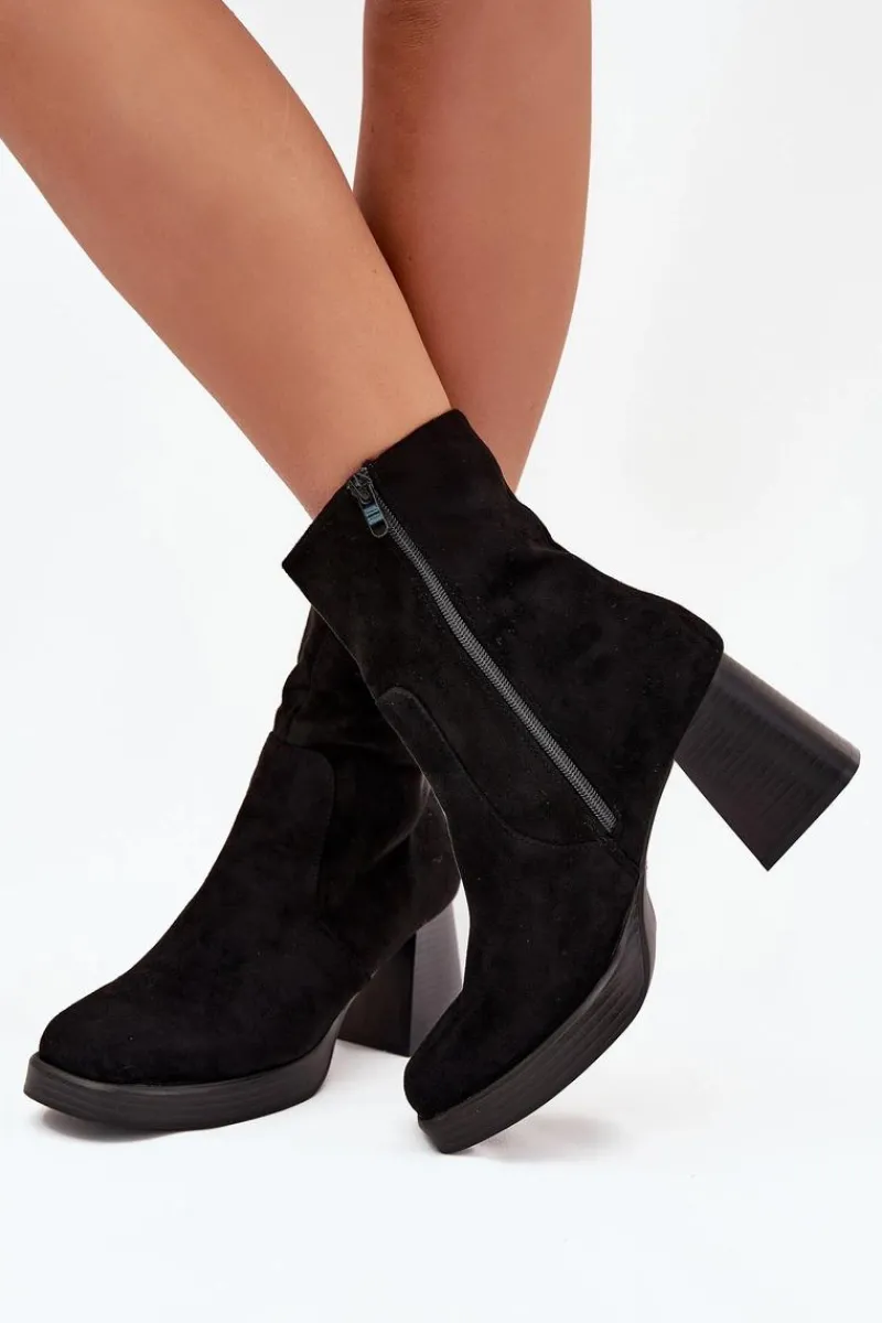 Botki damskie z eko zamszu na słupkowym obcasie to elegancki wybór na chłodniejsze dni. Cholewka sięga za kostkę. Zapinane na zamek, co zapewnia szybkie zakładanie i zdejmowanie obuwia. Noski delikatnie zaokrąglone. Stylowy fason sprawia, że te botki doskonale komponują się zarówno z sukienkami, jak i spódnicami, tworząc eleganckie i kobiece stylizacje. Przy wyborze rozmiaru prosimy sugerować się tabelą rozmiarów.