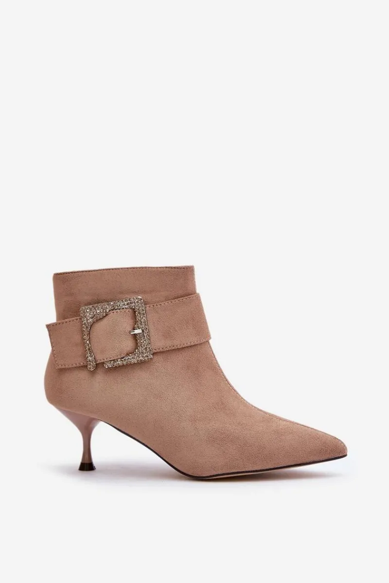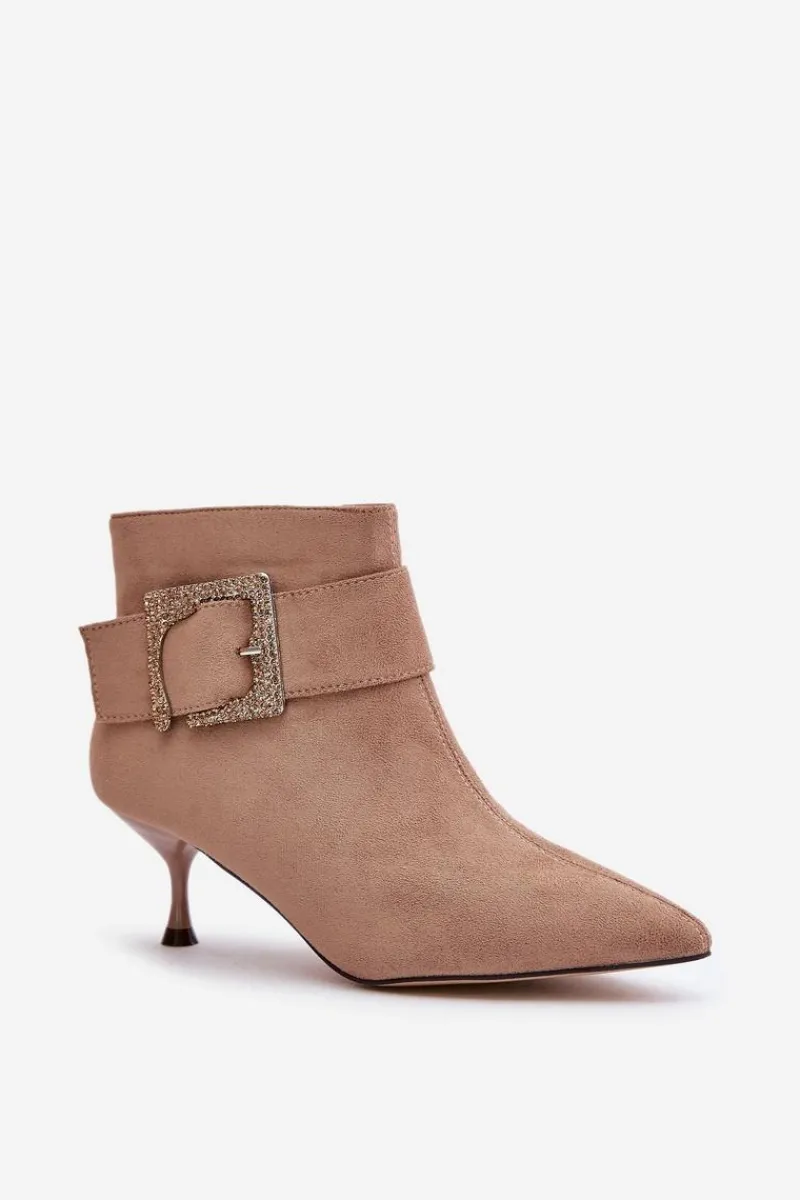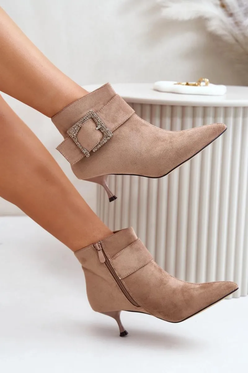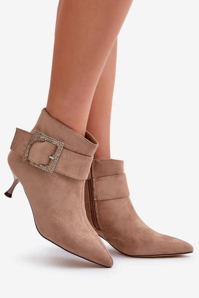 Stylowe botki na szpilce. Wykonane z eko zamszu. Zapinane na zamek, zapewniają wygodę i łatwość zakładania. Noski w szpic dodają wyrafinowanego charakteru, podkreślając kobiecość i smukłość sylwetki. Głównym atutem tego modelu jest duża, ozdobna klamra z boku cholewki. Idealne na specjalne okazje, jak i do codziennych stylizacji! Przy wyborze rozmiaru prosimy sugerować się tabelą rozmiarów.