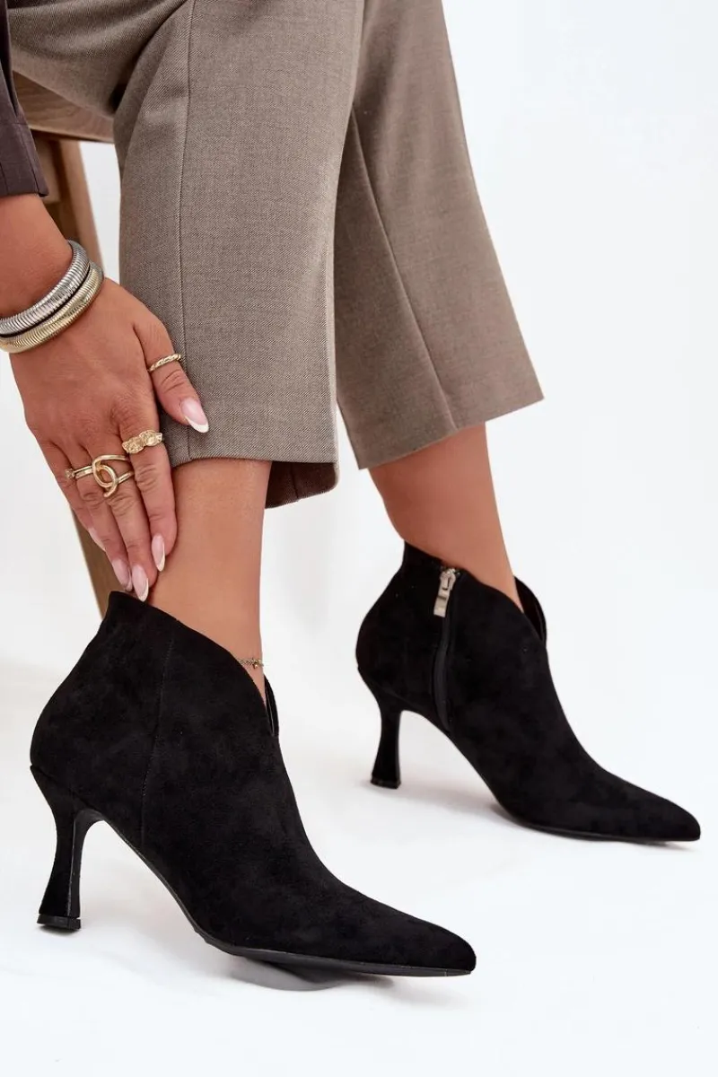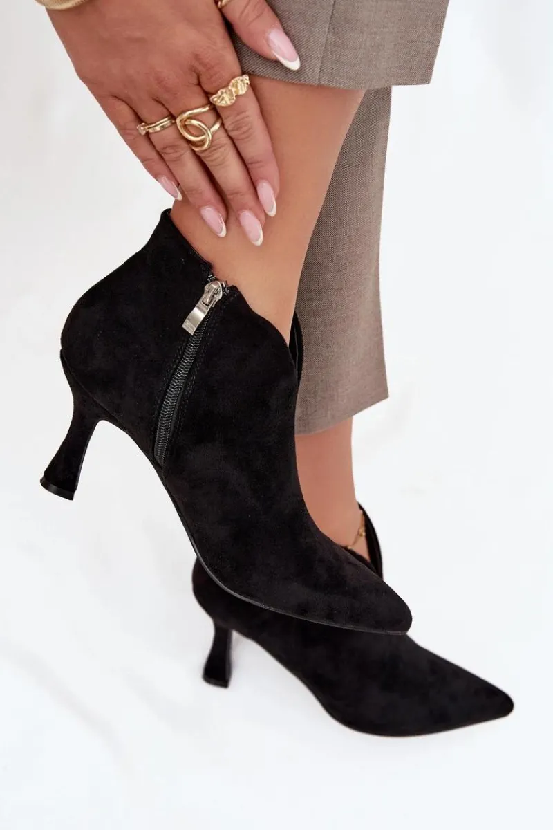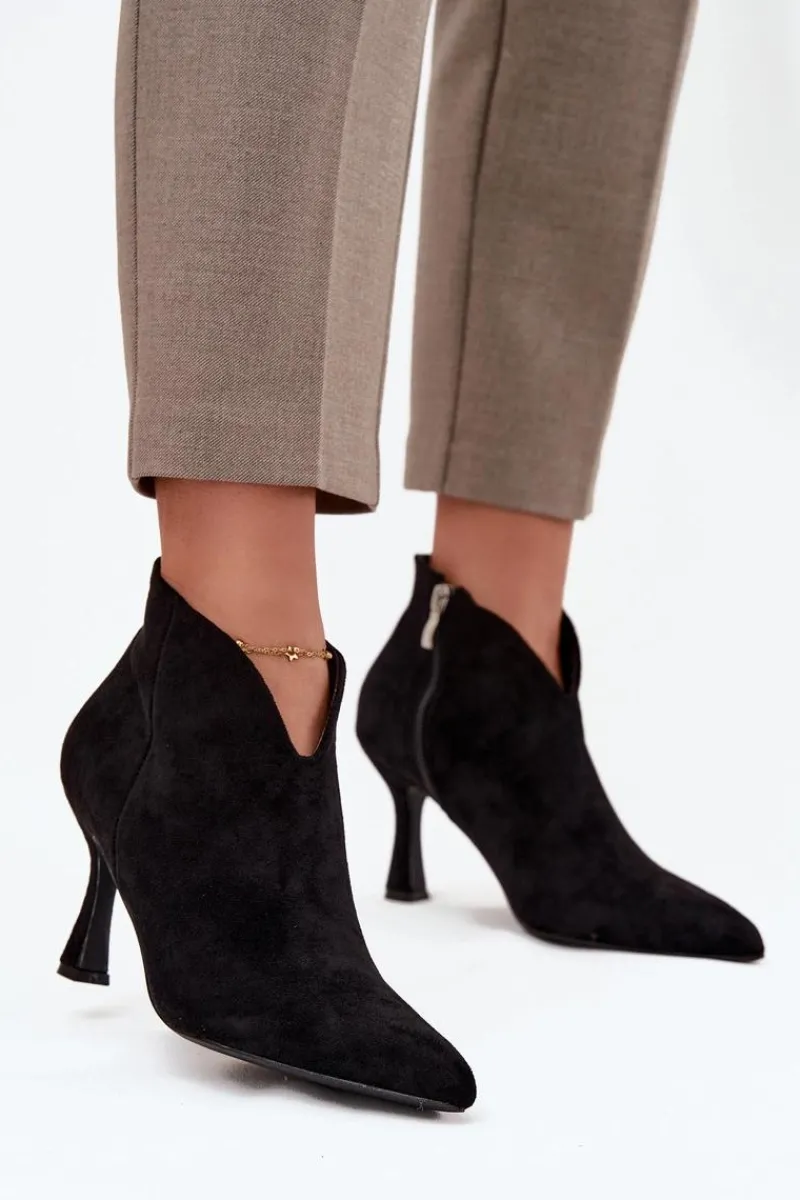 Niskie botki damskie wykonane z eko zamszu to elegancka propozycja dla kobiet, które cenią klasykę w nowoczesnym wydaniu. Osadzone na smukłej szpilce pięknie wysmuklają sylwetkę, a szpiczaste noski dodają całości szyku i podkreślają kobiecy charakter obuwia. Model zapinany jest na praktyczny zamek, co ułatwia zakładanie i zdejmowanie butów. Ciekawym elementem wyróżniającym ten fason jest asymetryczna cholewka, która nadaje oryginalnego wyglądu i sprawia, że prezentują się wyjątkowo stylowo. To doskonały wybór do eleganckich stylizacji – zarówno na co dzień, jak i na specjalne okazje. Przy wyborze rozmiaru prosimy sugerować się tabelą rozmiarów.