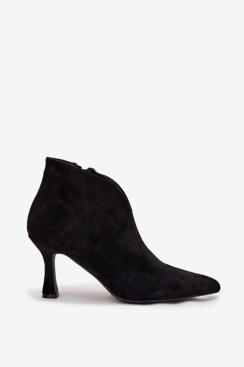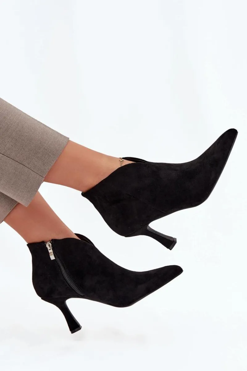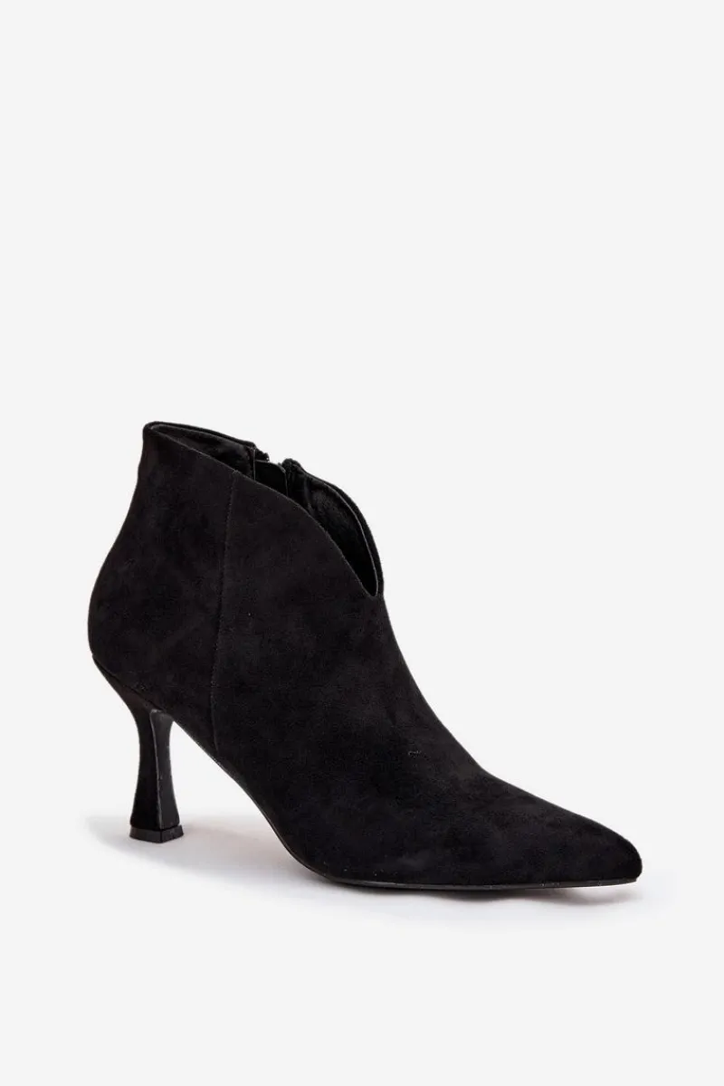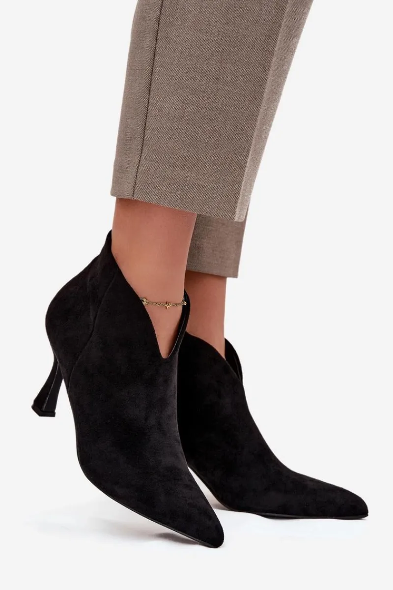 Niskie botki damskie wykonane z eko zamszu to elegancka propozycja dla kobiet, które cenią klasykę w nowoczesnym wydaniu. Osadzone na smukłej szpilce pięknie wysmuklają sylwetkę, a szpiczaste noski dodają całości szyku i podkreślają kobiecy charakter obuwia. Model zapinany jest na praktyczny zamek, co ułatwia zakładanie i zdejmowanie butów. Ciekawym elementem wyróżniającym ten fason jest asymetryczna cholewka, która nadaje oryginalnego wyglądu i sprawia, że prezentują się wyjątkowo stylowo. To doskonały wybór do eleganckich stylizacji – zarówno na co dzień, jak i na specjalne okazje. Przy wyborze rozmiaru prosimy sugerować się tabelą rozmiarów.