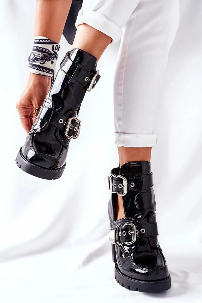 Czarne lakierowane botki to hit tego sezonu! Zapinane na sprzączkę. Wysoki słupek zapewni wygodę użytkowania. Podczas wyboru rozmiaru prosimy kierować się tabelą rozmiarów.