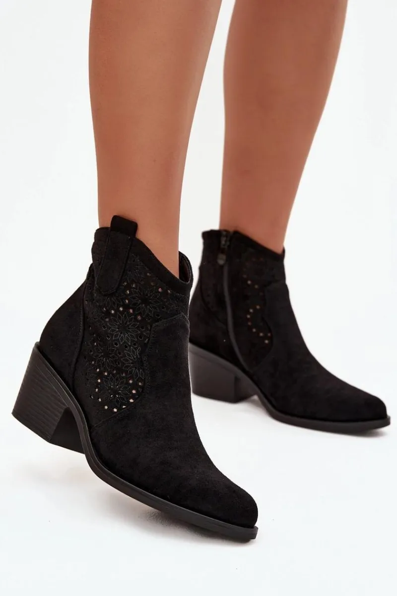 Botki damskie w stylu kowbojek od marki S.Barski to modna propozycja, która świetnie podkreśli charakter jesiennych i wiosennych stylizacji. Wykonane z wysokiej jakości eko zamszu, prezentują się elegancko i są przyjemne w dotyku. Charakterystycznym elementem tego modelu jest ażurowy wzór na cholewce, który nadaje im lekkości, oryginalności i subtelnie wyróżnia je na tle klasycznych kowbojek. Botki zostały osadzone na stabilnym, ściętym obcasie, który zapewnia wygodę podczas chodzenia, a jednocześnie dodaje całości stylowego wykończenia inspirowanego westernowym klimatem. Migdałowe noski optycznie wysmuklają stopę i podkreślają kobiecy charakter butów. To model, który doskonale sprawdzi się zarówno w codziennych, casualowych zestawach, jak i w bardziej wyrazistych stylizacjach z nutą boho. Przy wyborze rozmiaru prosimy sugerować się tabelą rozmiarów.
