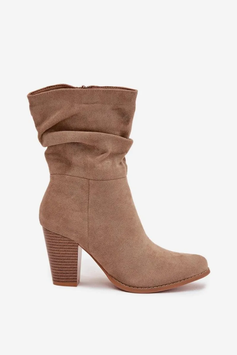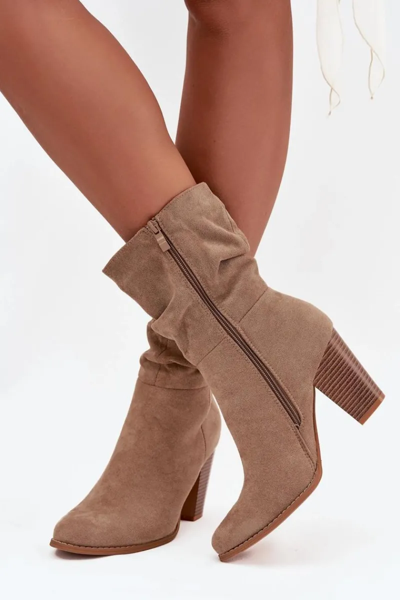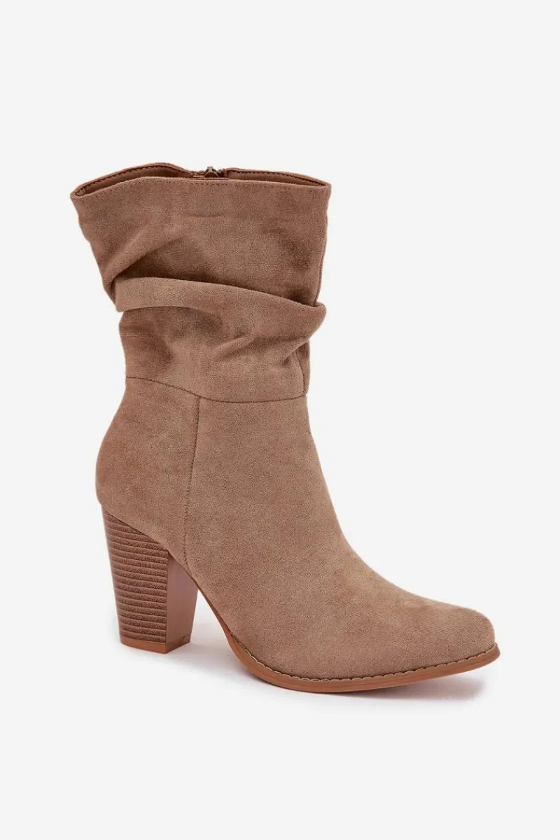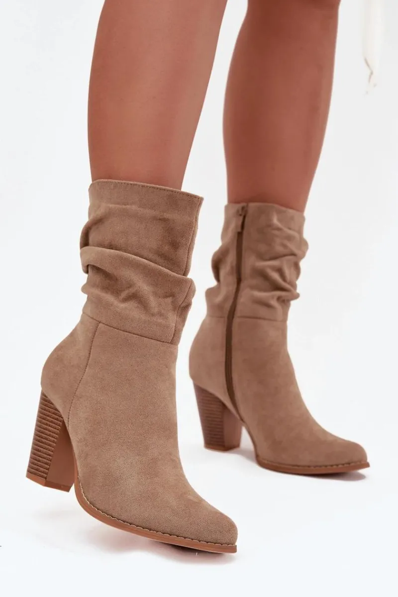 Botki damskie wykonane z eko zamszu. Stabilny obcas typu słupek dodaje kilku centymetrów wzrostu, jednocześnie zapewniając komfort noszenia. Uwagę przyciąga także marszczona góra cholewki. Świetnie sprawdzą się zarówno w codziennych stylizacjach, jak i w eleganckich zestawach – idealne do spodni, spódnic czy sukienek.