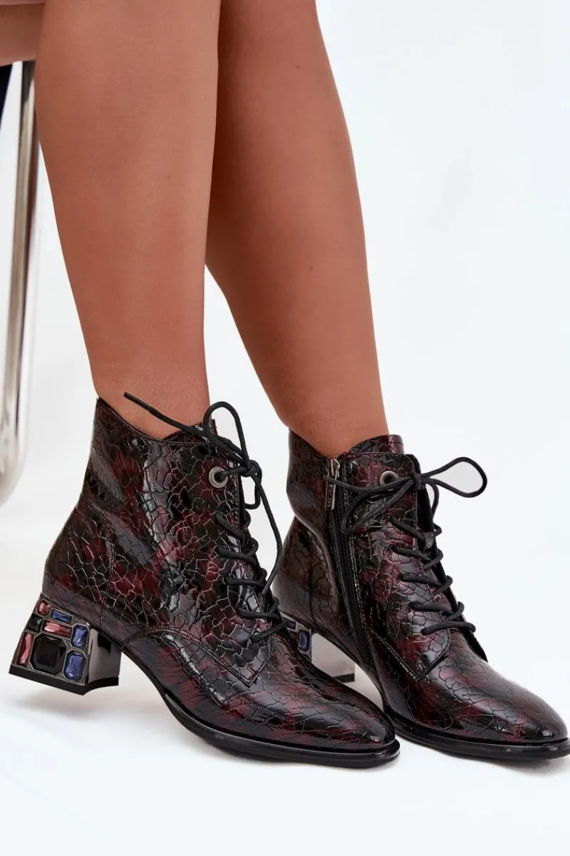 Botki damskie marki Artiker wykonane z lakierowanej skóry naturalnej to eleganckie obuwie z nutą oryginalności. Osadzone na stabilnym obcasie typu klocek, ozdobionym kryształkami, przyciągają uwagę i dodają stylizacjom wyjątkowego charakteru. Model łączy sznurowanie z praktycznym zamkiem, co ułatwia zakładanie i dopasowanie do stopy. Zaokrąglone noski podkreślają klasyczny fason, a wnętrze ocieplone miękkim w dotyku kocem obuwniczym zapewnia komfort i ciepło w chłodniejsze dni. Przy wyborze rozmiaru prosimy sugerować się tabelą rozmiarów.