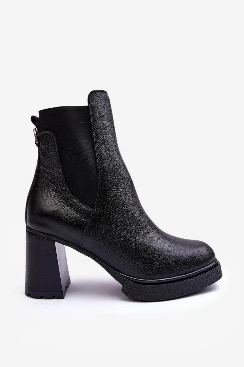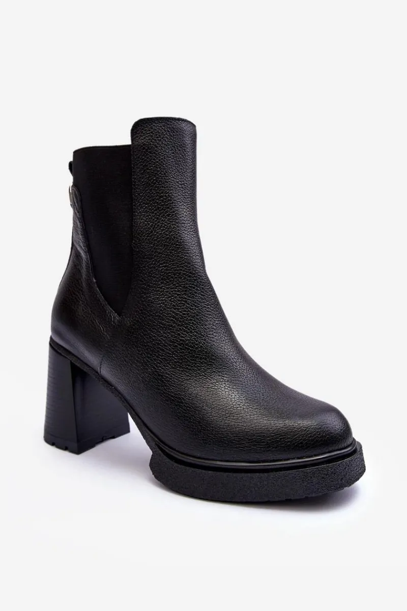 Botki na platformie i obcasie w postaci słupka. Cholewka za kostkę. Wykonane ze skóry naturalnej. Na cholewce elastyczna wstawka. Zapinane suwakiem po wewnętrznej stronie. Buty zostały ocieplone kocem obuwniczym. Podeszwa jest antypoślizgowa. Botki doskonale sprawdzą się w jesiennych stylizacjach. Przy wyborze rozmiaru prosimy kierować się tabelą rozmiarów