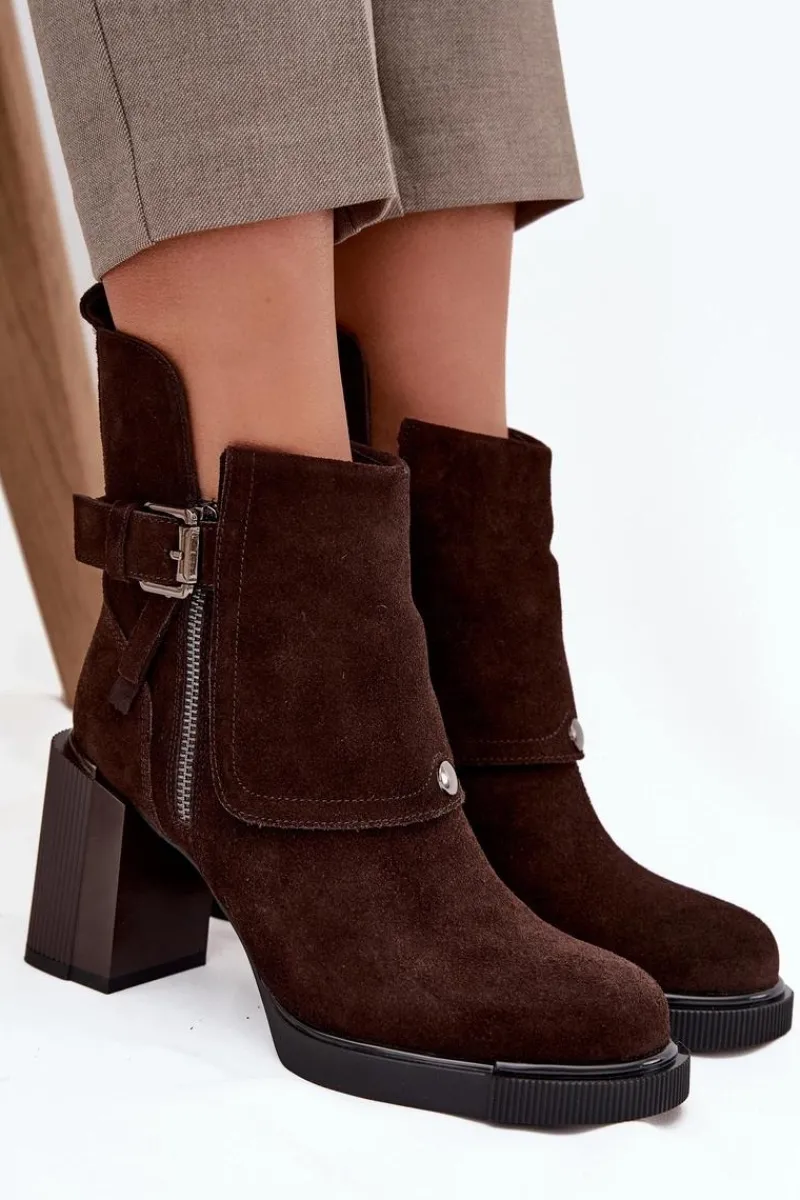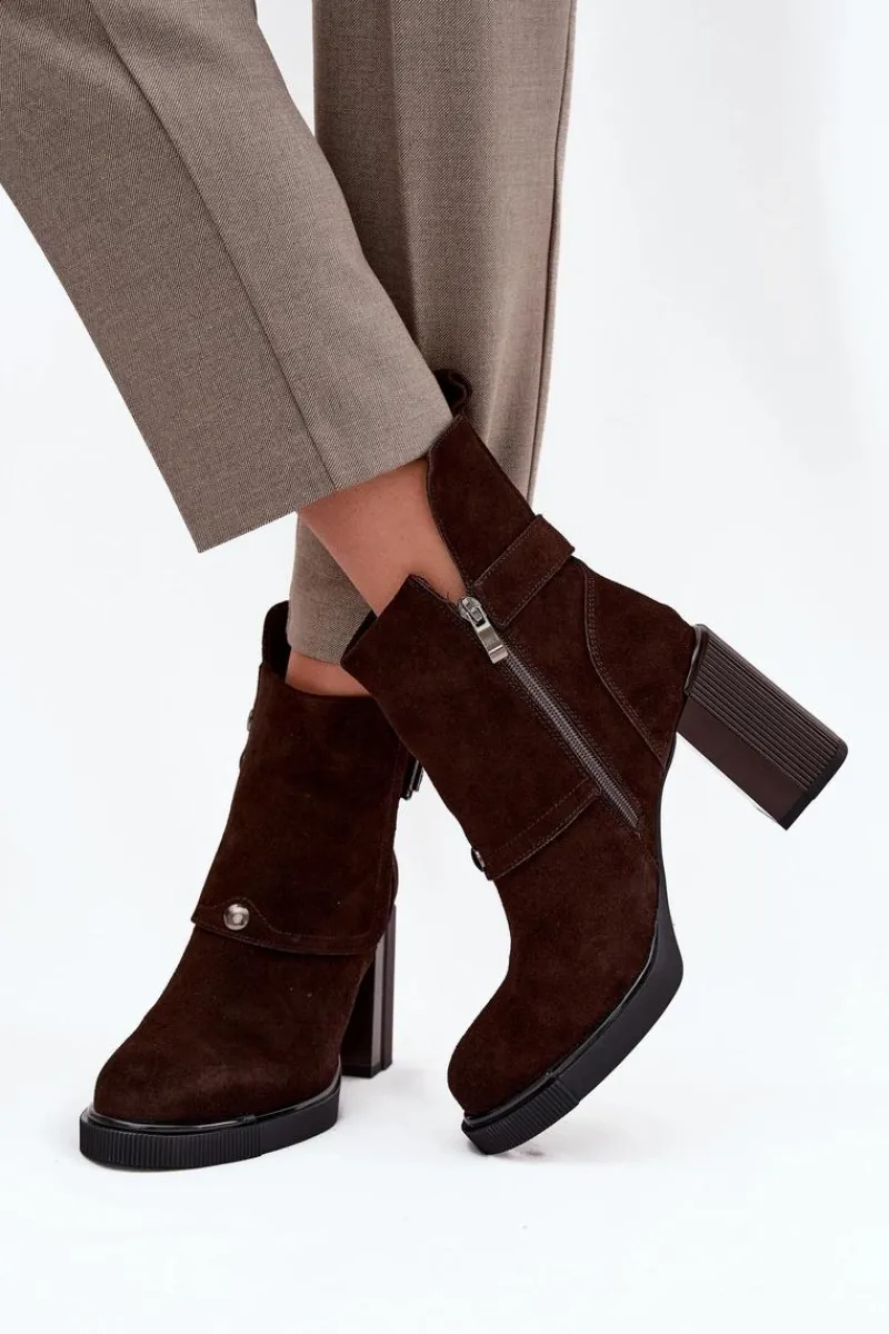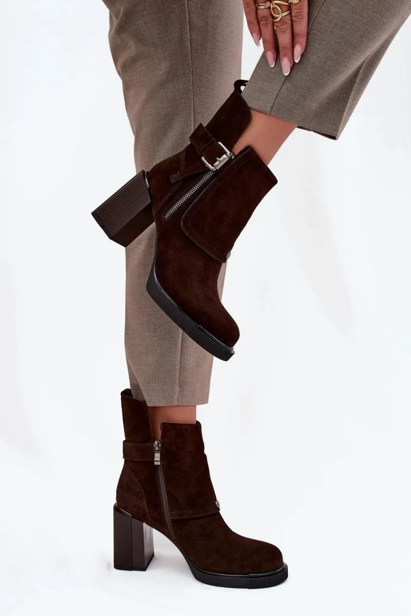 Botki damskie marki Vinceza wykonane z naturalnego zamszu to elegancka propozycja na chłodniejsze dni. Osadzone na stabilnym obcasie typu słupek wysmukla sylwetkę. Model zapinany na praktyczny zamek ułatwia zakładanie, a delikatne ocieplenie gwarantuje ciepło. Stylowym akcentem jest pasek z klamrą umieszczony na górze cholewki, który nadaje całości modnego i kobiecego charakteru. To uniwersalne botki, które świetnie sprawdzą się zarówno w codziennych, jak i eleganckich stylizacjach. Przy wyborze rozmiaru prosimy sugerować się tabelą rozmiarów.