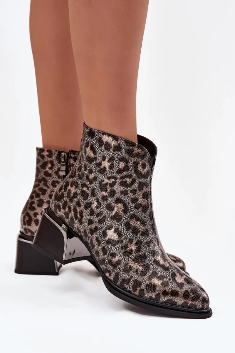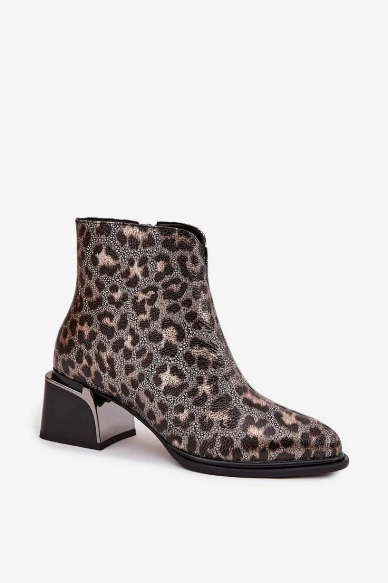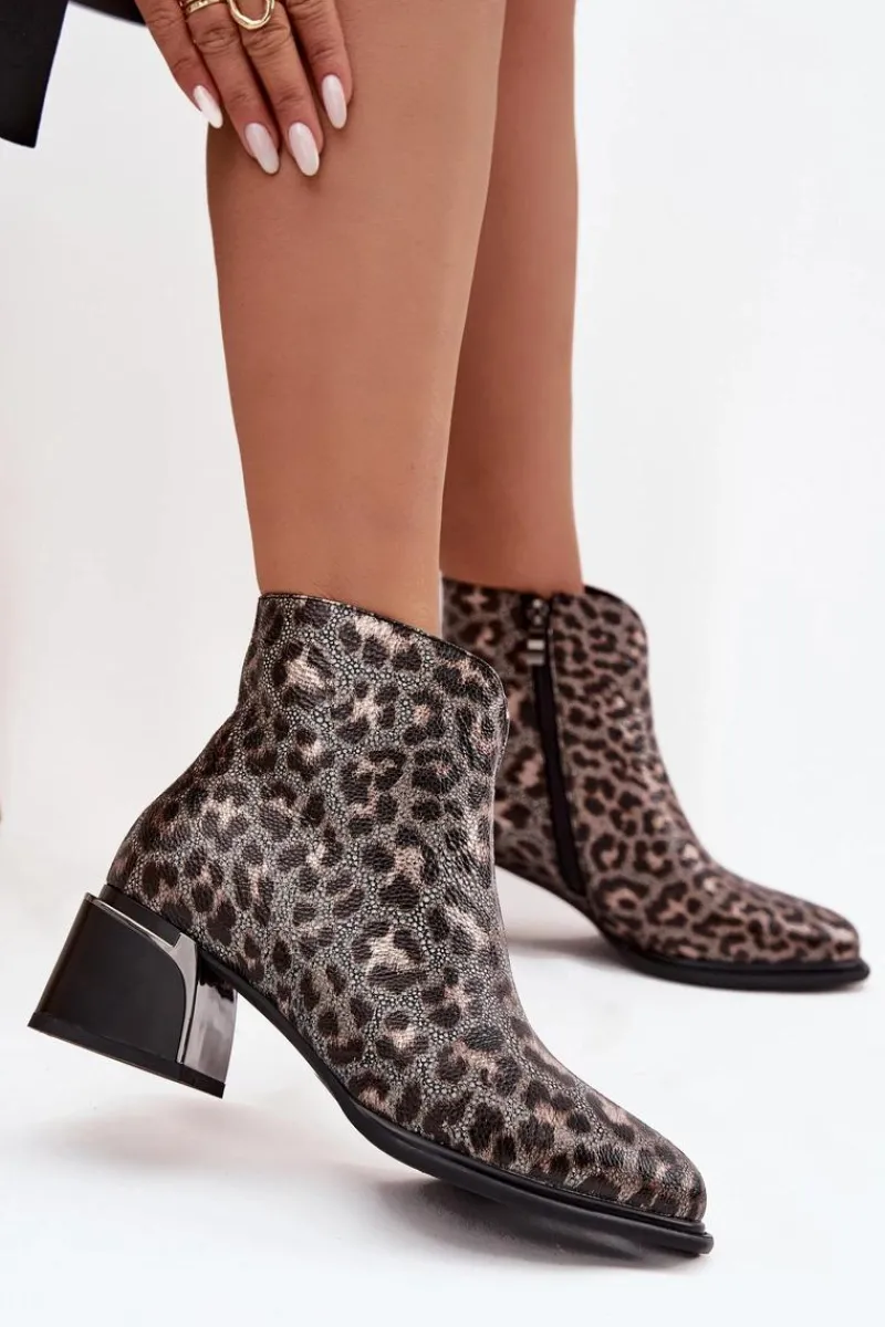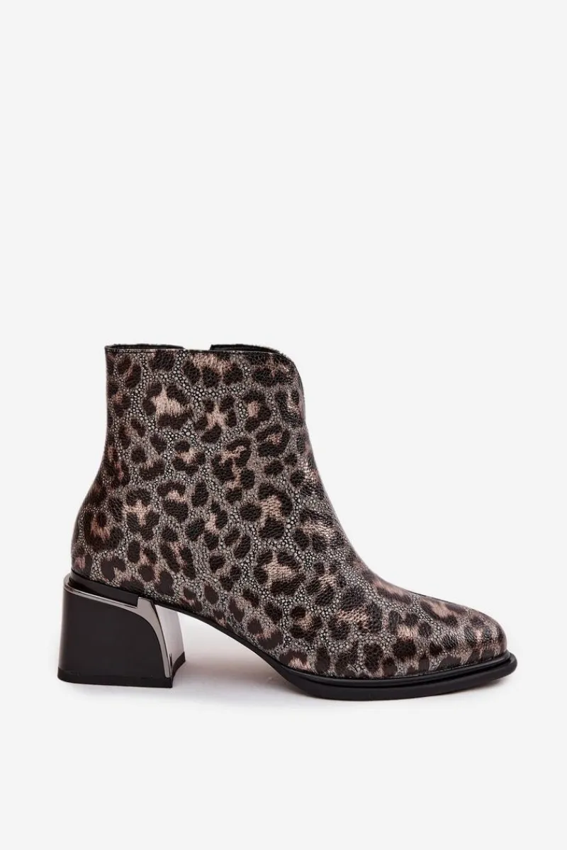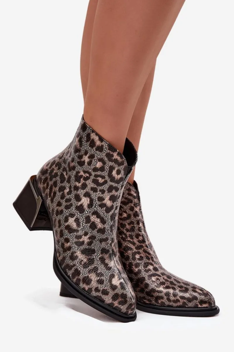 Stylowe i eleganckie botki damskie wykonane z naturalnej skóry to propozycja, która łączy modny wygląd z wygodą użytkowania. Model wyróżnia się efektownym wzorem w panterkę, nadającym wyrazistego charakteru i podkreślającym kobiecy styl. Osadzone na stabilnym obcasie w formie klocka zapewniają komfort noszenia, a praktyczne zapięcie na zamek ułatwia zakładanie i zdejmowanie. Migdałowe noski dodają całości subtelnej elegancji, a dekoracyjne przeszycie biegnące wzdłuż cholewki optycznie wydłuża nogę i podkreśla smukłą linię buta. Ocieplane wnętrze gwarantuje ciepło w chłodniejsze dni, dzięki czemu botki doskonale sprawdzą się w sezonie jesienno-zimowym. To model, który będzie idealnym uzupełnieniem zarówno codziennych, jak i bardziej eleganckich stylizacji.