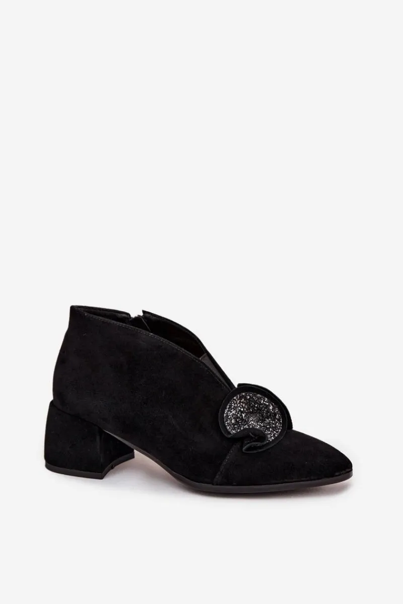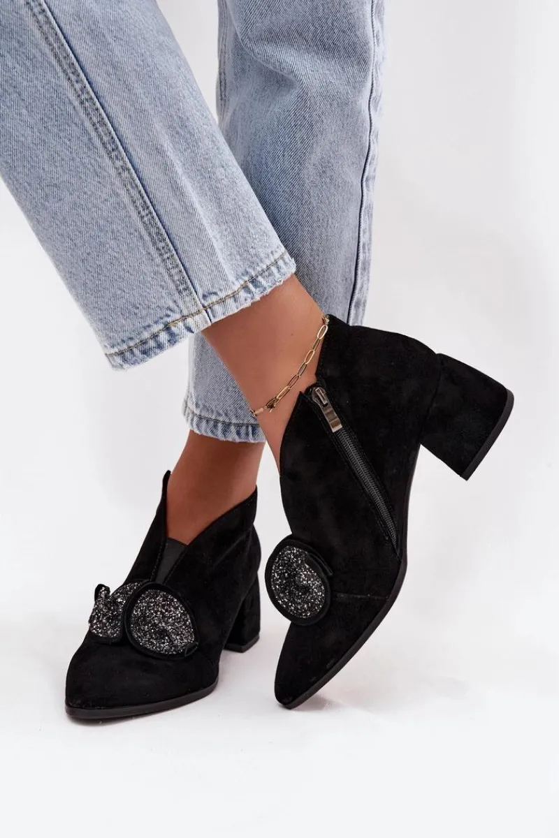 Eleganckie, niskie botki damskie z naturalnego zamszu to propozycja, która łączy klasyczny styl z wygodą użytkowania. Wykonane z wysokiej jakości materiału, prezentują się szykownie i ponadczasowo, a jednocześnie gwarantują trwałość na wiele sezonów. Osadzone na stabilnym obcasie w formie klocka, zapewniają komfort podczas noszenia i dodają sylwetce subtelnej elegancji. Migdałowe noski podkreślają kobiecy charakter obuwia, a efektowny detal umieszczony z przodu sprawia, że model wyróżnia się i przyciąga spojrzenia. Zapięcie na zamek ułatwia zakładanie i zdejmowanie, a skórzana wkładka zwiększa wygodę oraz dba o komfort stóp w ciągu dnia. Doskonałe do formalnych stylizacji, a jednocześnie idealne na wieczorne wyjścia i specjalne okazje. Elegancki krój i stylowe detale sprawiają, że świetnie uzupełnią klasyczne zestawy, dodając im szyku i kobiecego charakteru. Przy wyborze rozmiaru prosimy sugerować się tabelą rozmiarów.