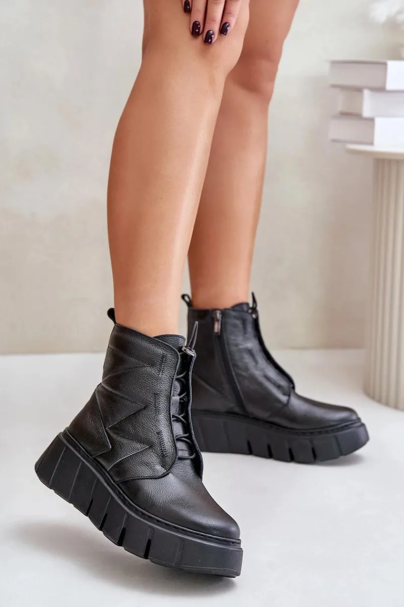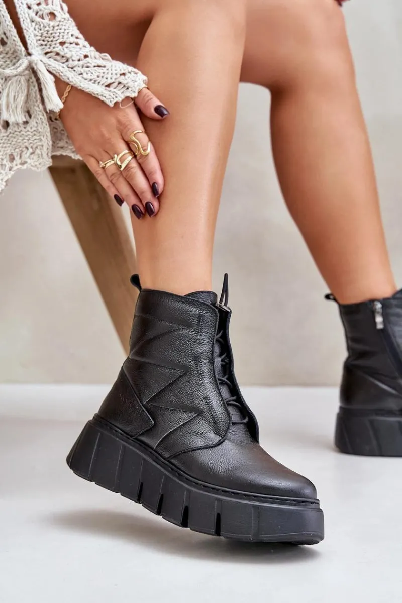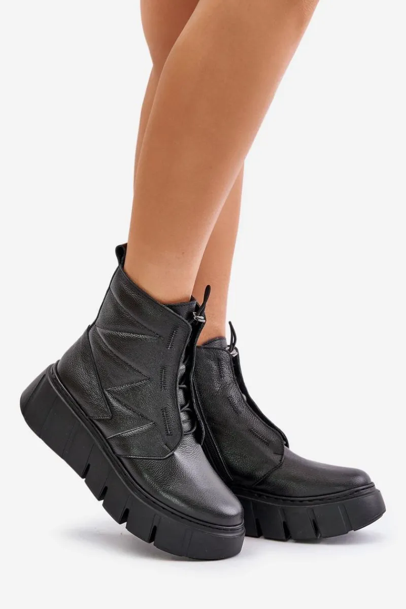 Damskie botki wykonane z naturalnej skóry, osadzone na platformie i koturnie, to idealny wybór na chłodniejsze dni. Ocieplane filcem, zapewniają ciepło i komfort noszenia. Model zapinany na zamek ułatwia zakładanie, a elegancki design sprawia, że botki doskonale pasują zarówno do codziennych, jak i bardziej stylowych stylizacji. Przy wyborze rozmiaru prosimy kierować się tabelą rozmiarów